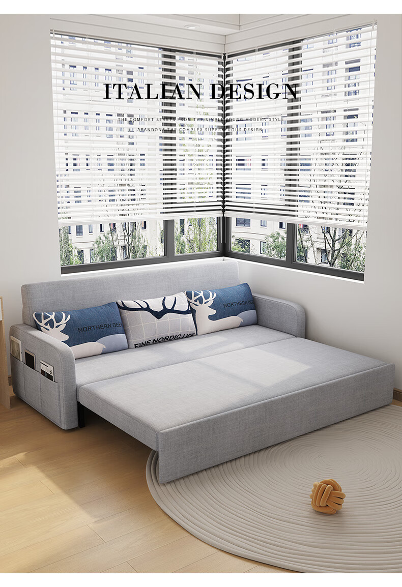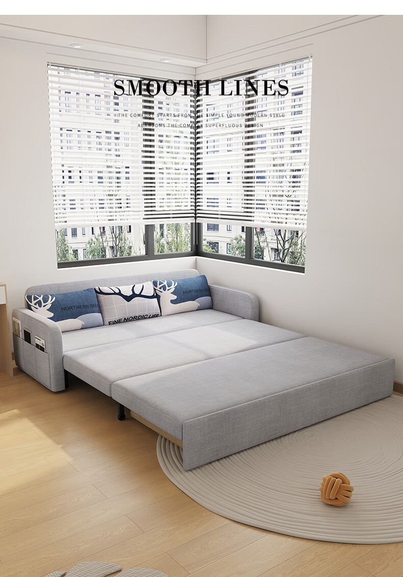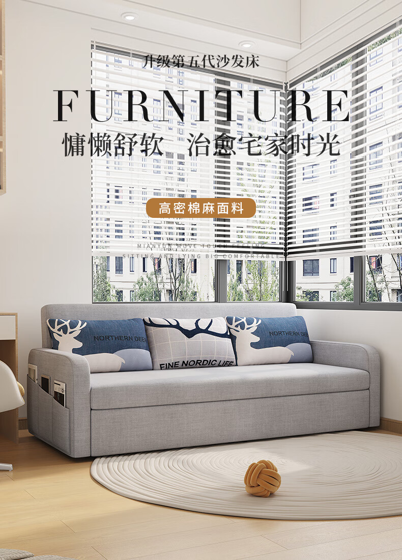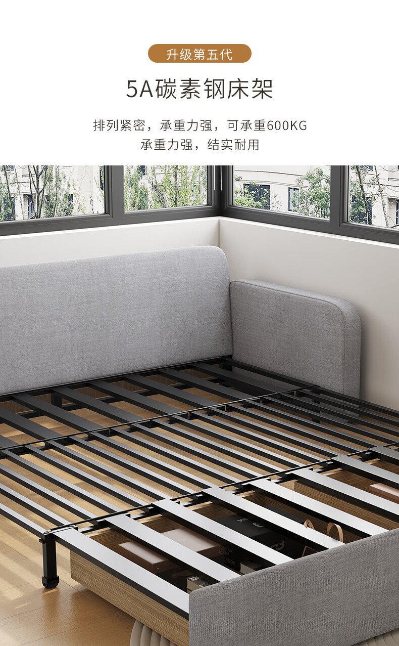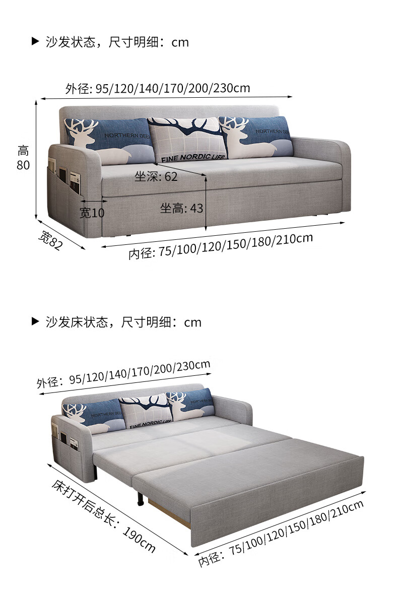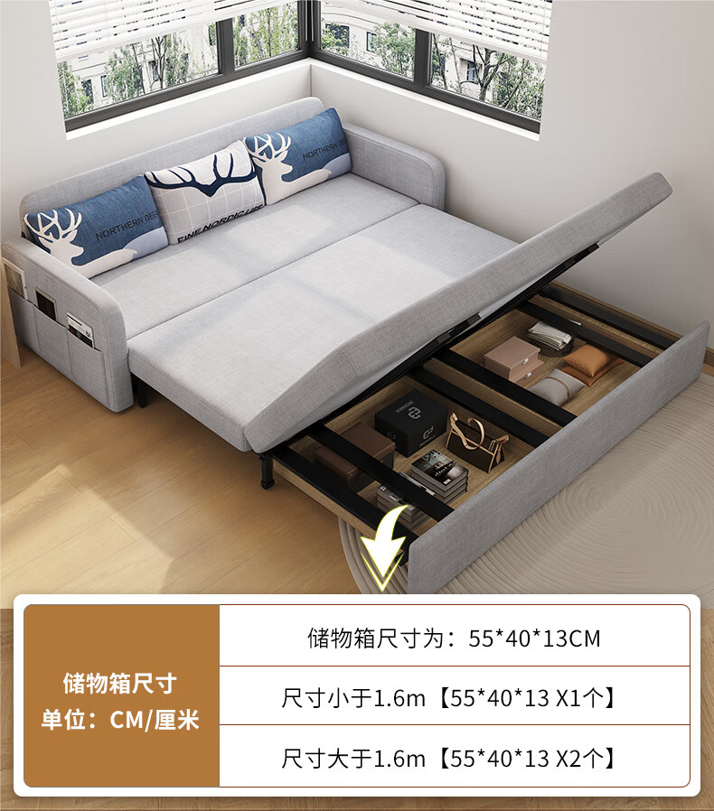 Aunolan sofa bed dual-purpose Nordic simple small apartment multi-functional foldable storage retractable fabric bed outer diameter 2.0 meters skin-friendly cotton and linen + storage high-density sponge type