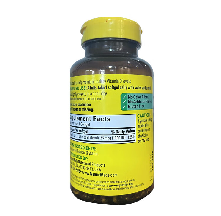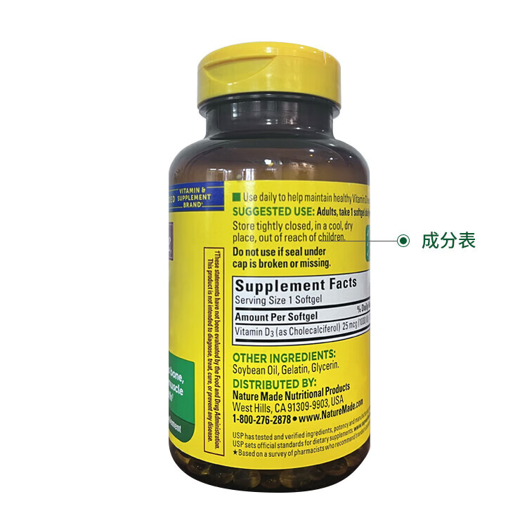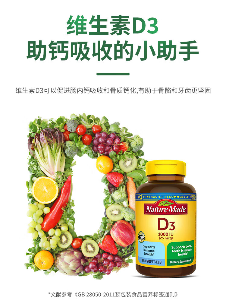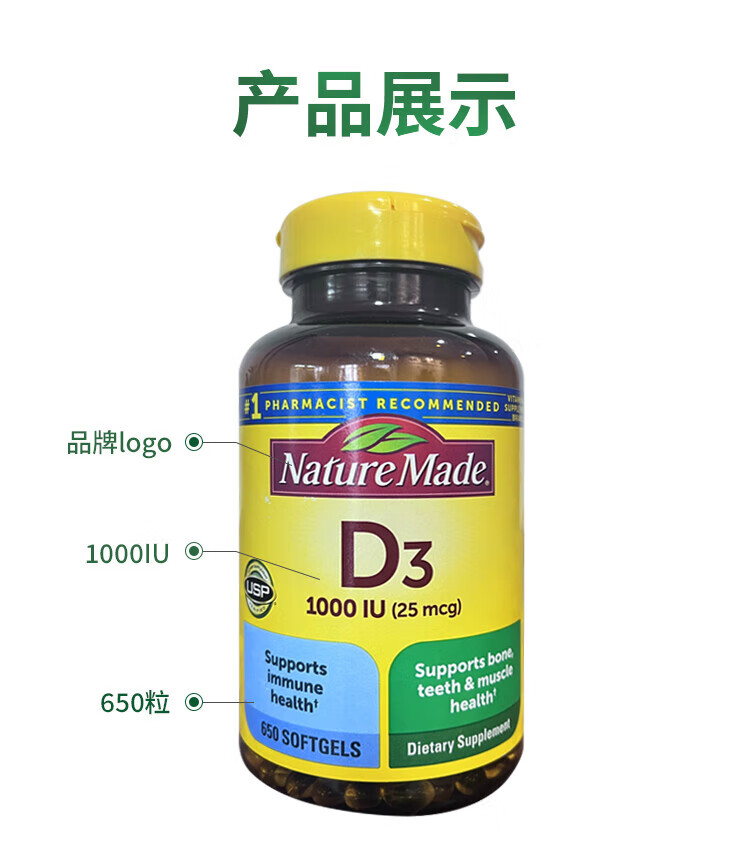 Nature Made Vitamin D3 soft capsules 1000IU imported from the United States Vitamin D for adults, children, pregnant women, middle-aged and elderly 1000 units of Vitamin D3 650 capsules*1 bottle