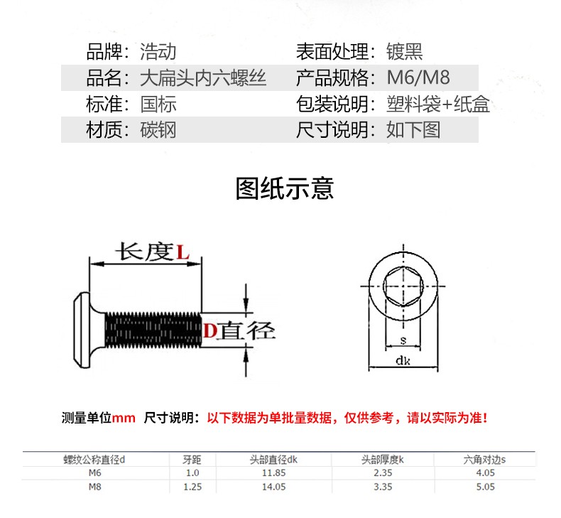 Haodong black furniture oblique large flat head hexagonal screws children's bed flat round head flat head edge bolts M3M4M5M6M8 8*20 10 pieces