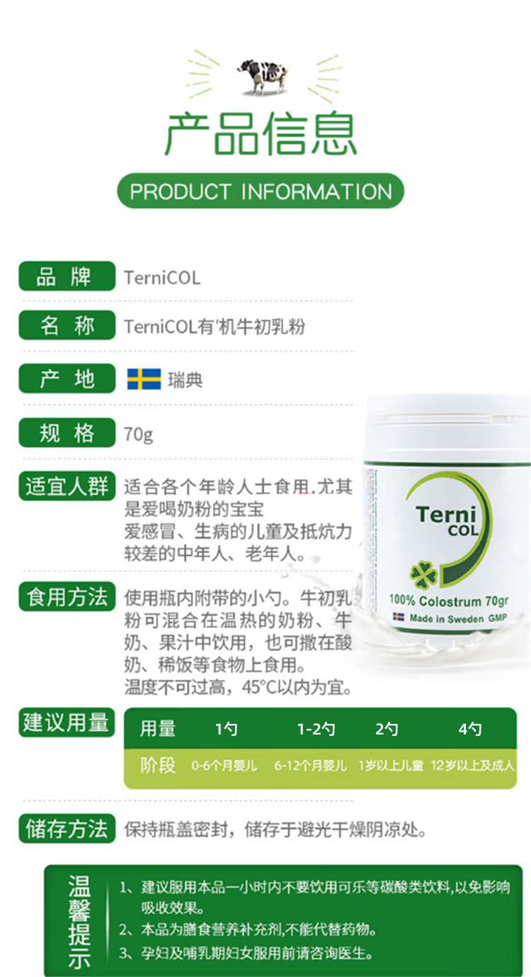 TerniCOL Swedish imported natural supplement children's immune globulin lactoferrin bovine colostrum powder 70g 70g*1 bottle