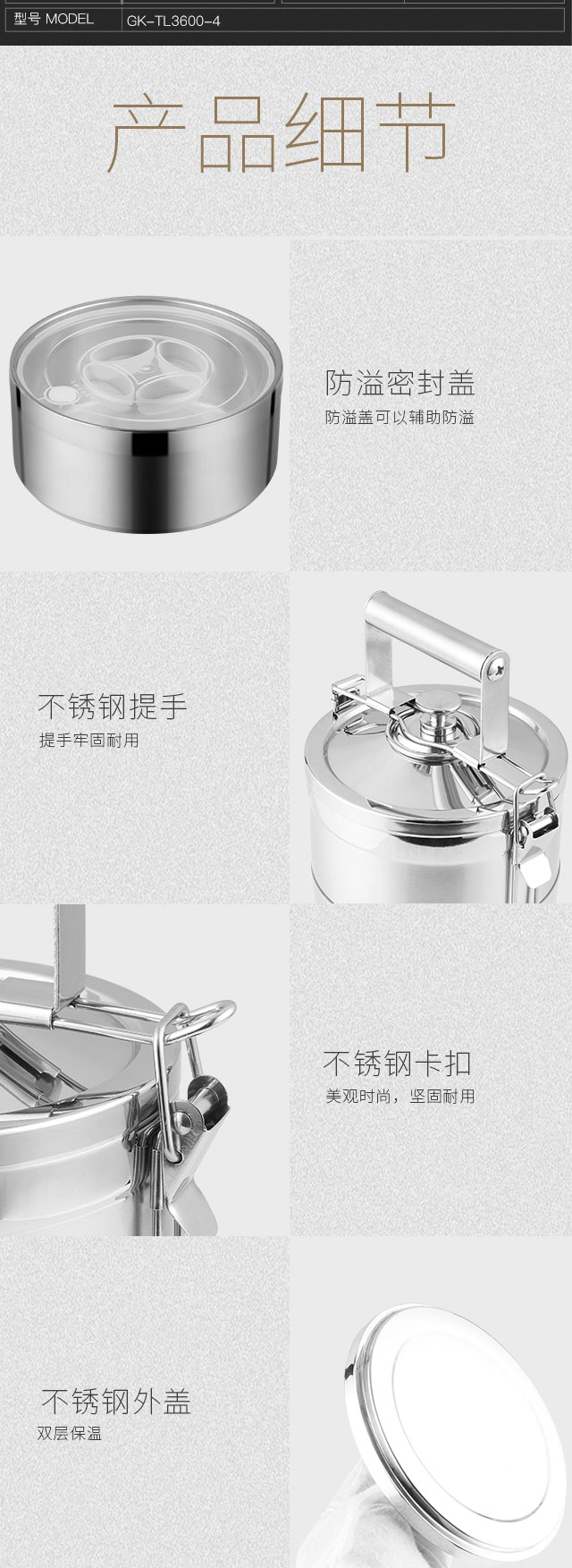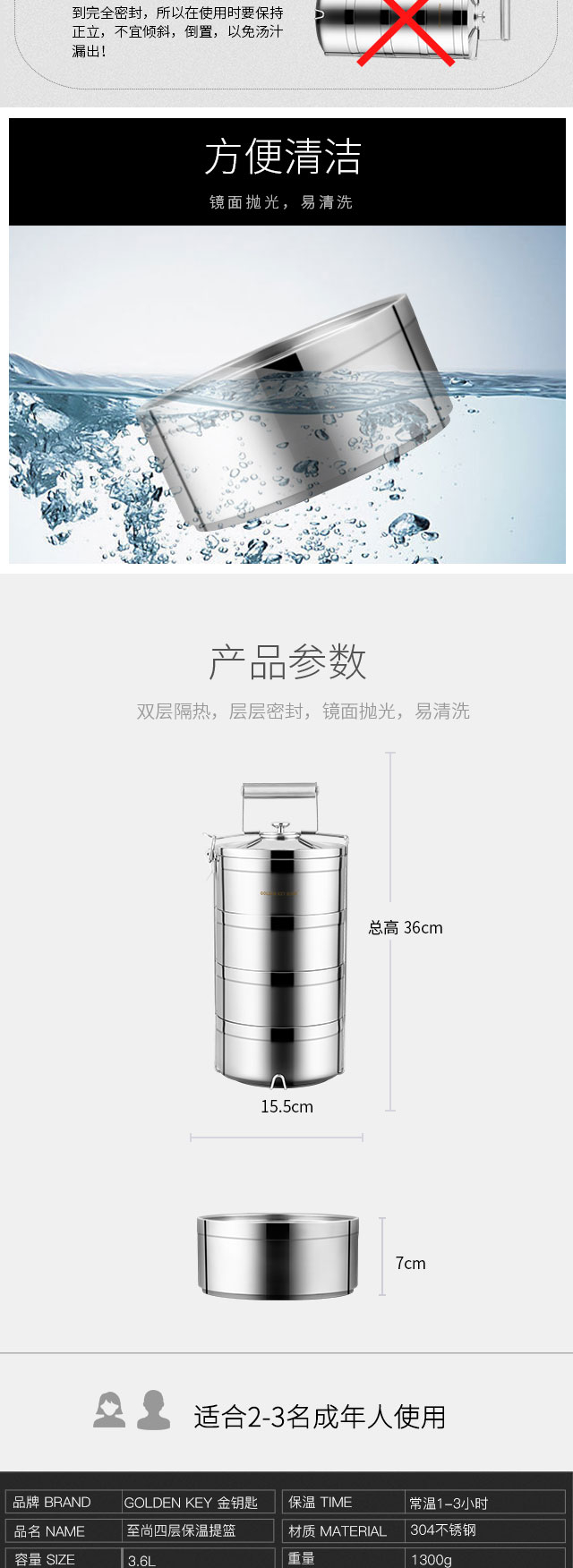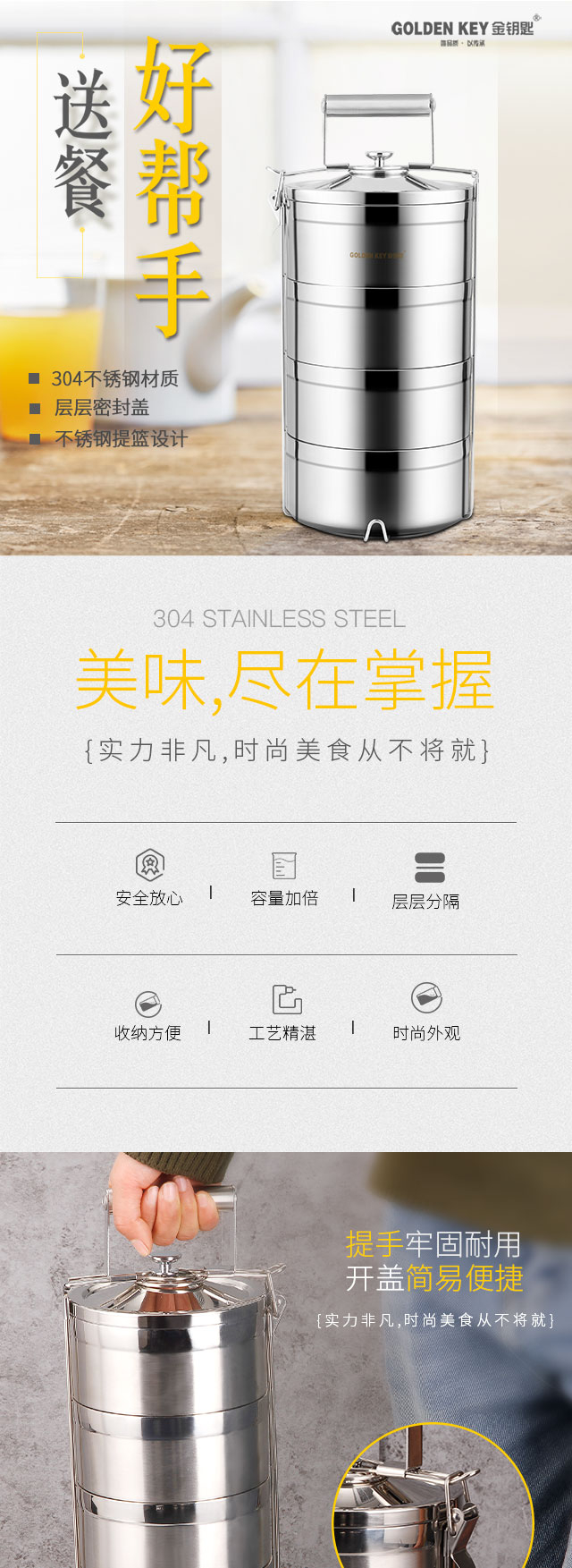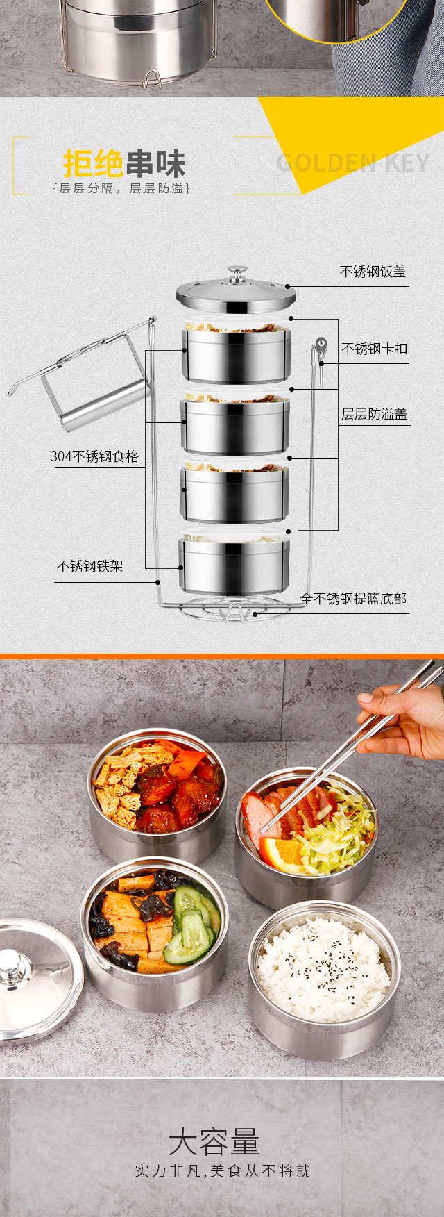 Golden Key 304 stainless steel ultimate 3.6L four-layer insulated lunch box basket layered lunch box GK-TL3600-4