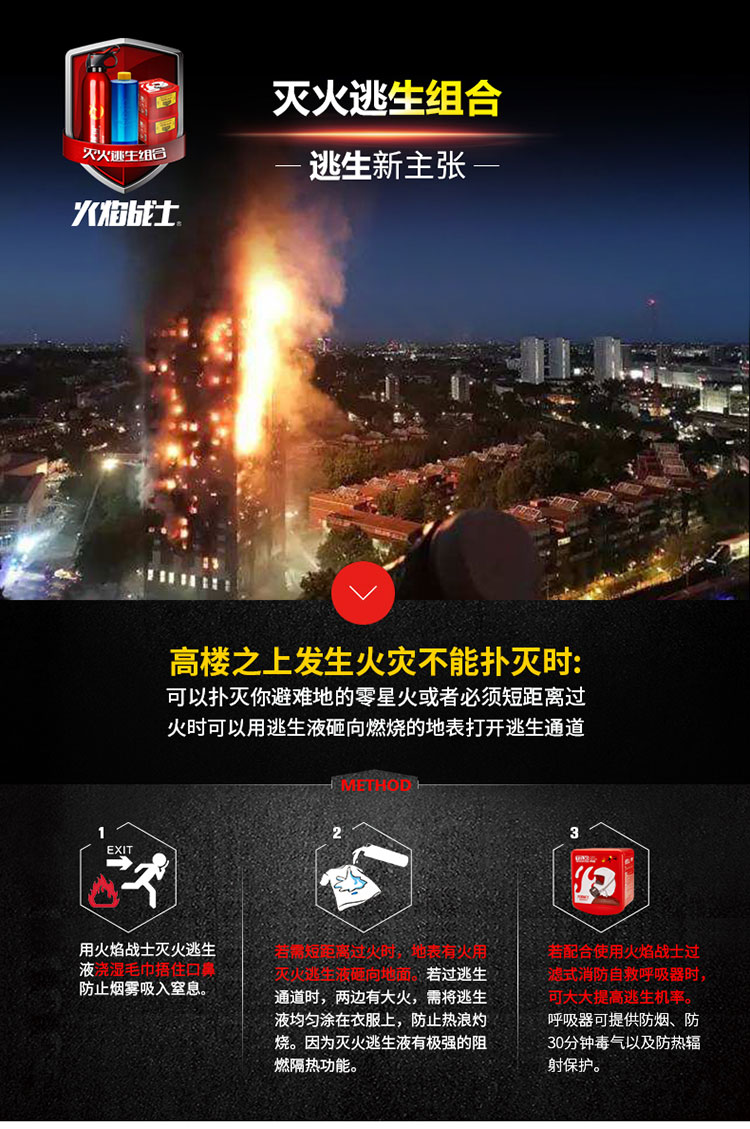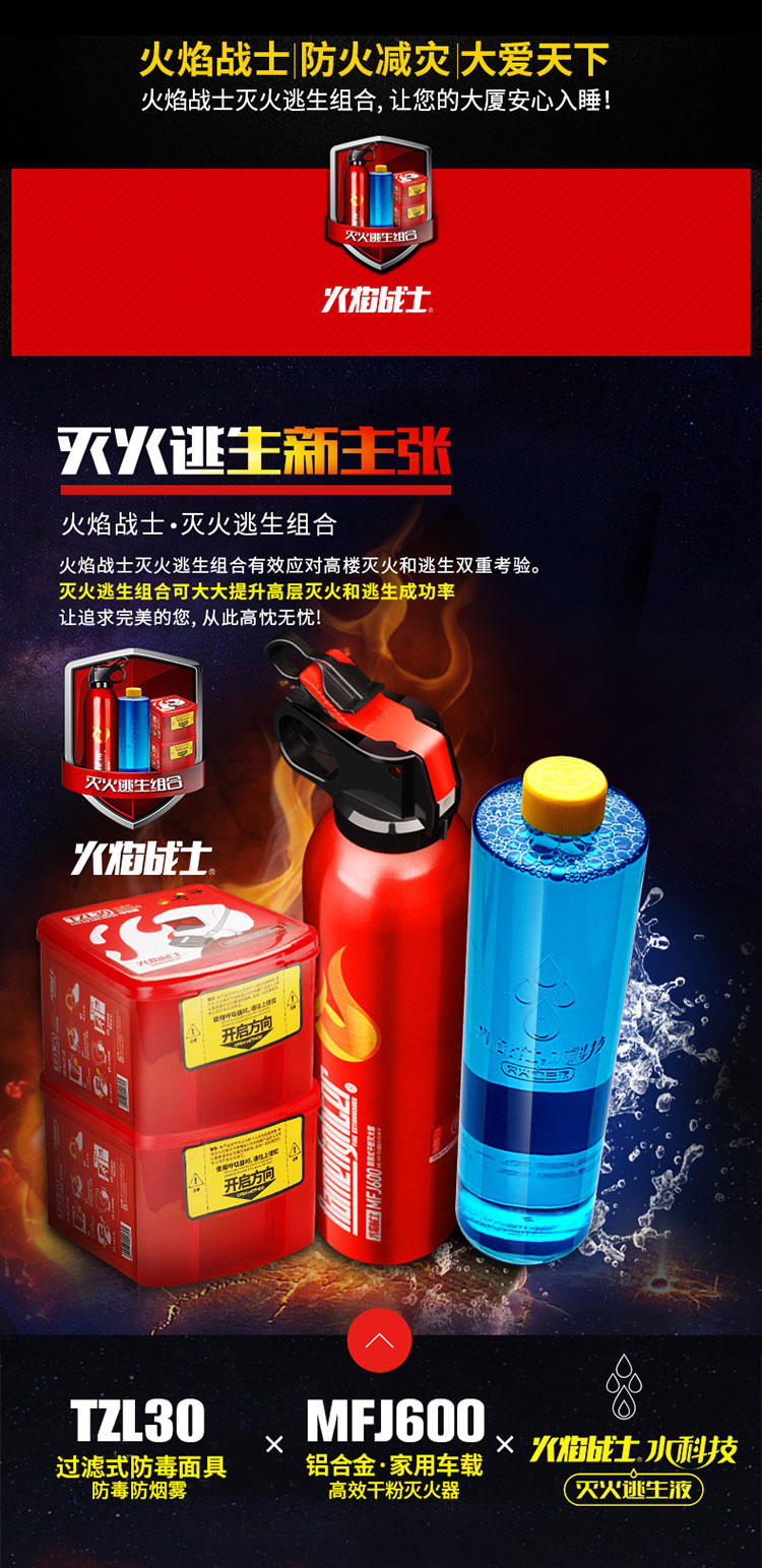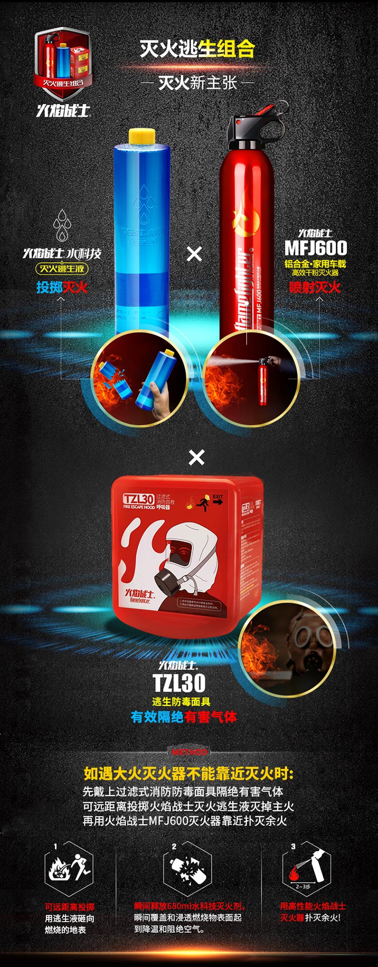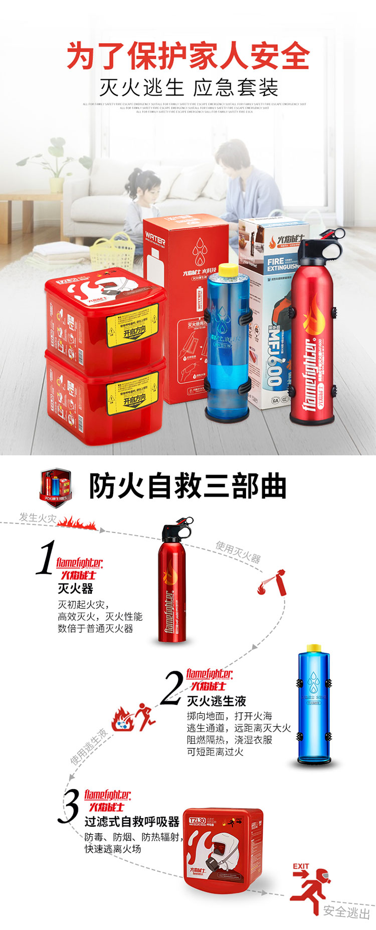 Flame Warrior Fire Extinguisher Gas Mask Car Home Furnishing Fire Escape Emergency Four-piece Set (600G Dry Powder + Escape Mask X2 + Water-based Environmentally Friendly Escape Bottle) FTZ-100