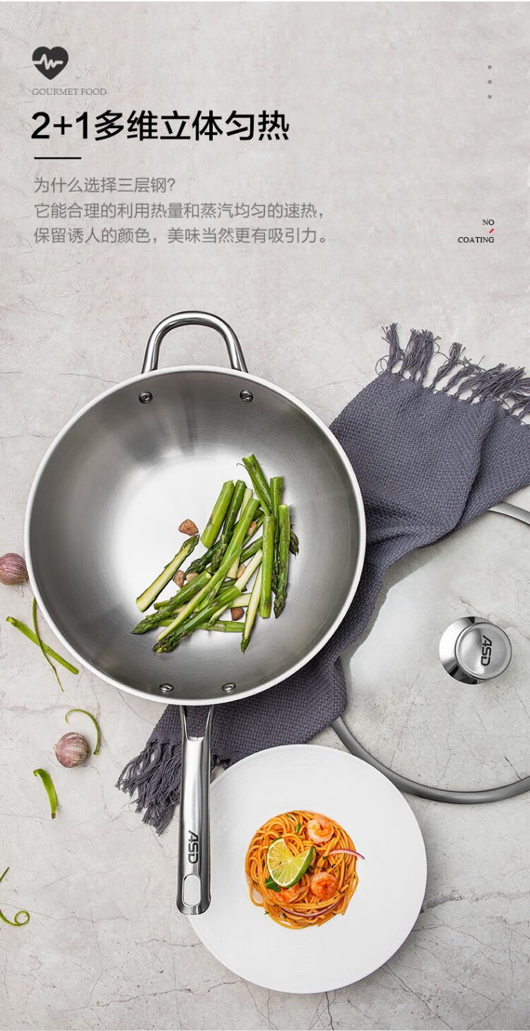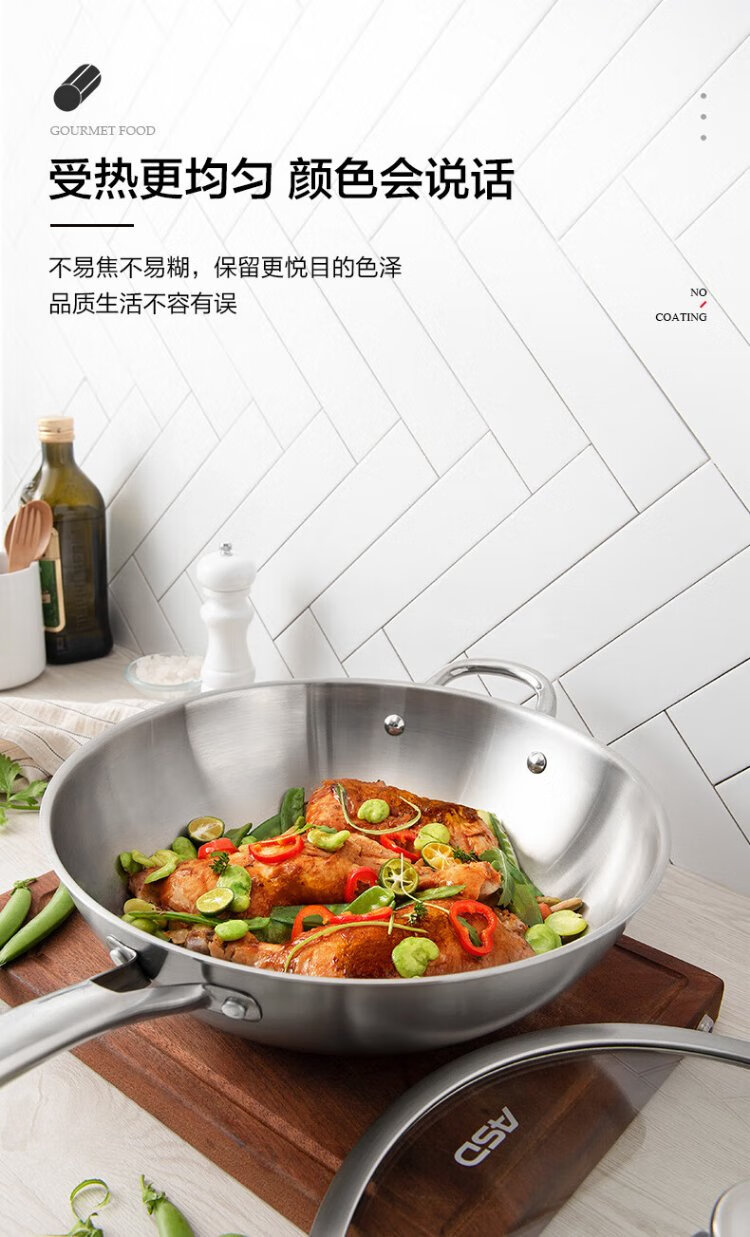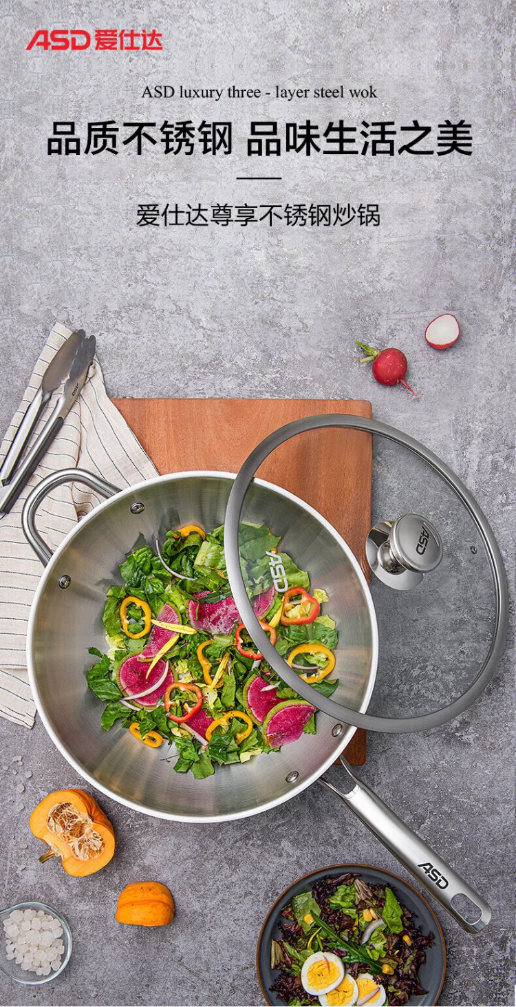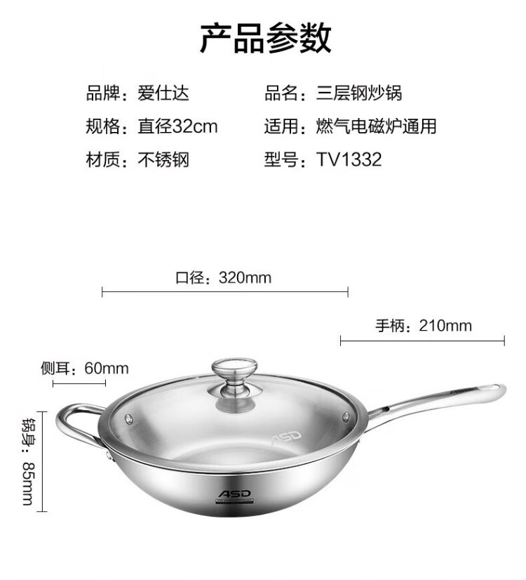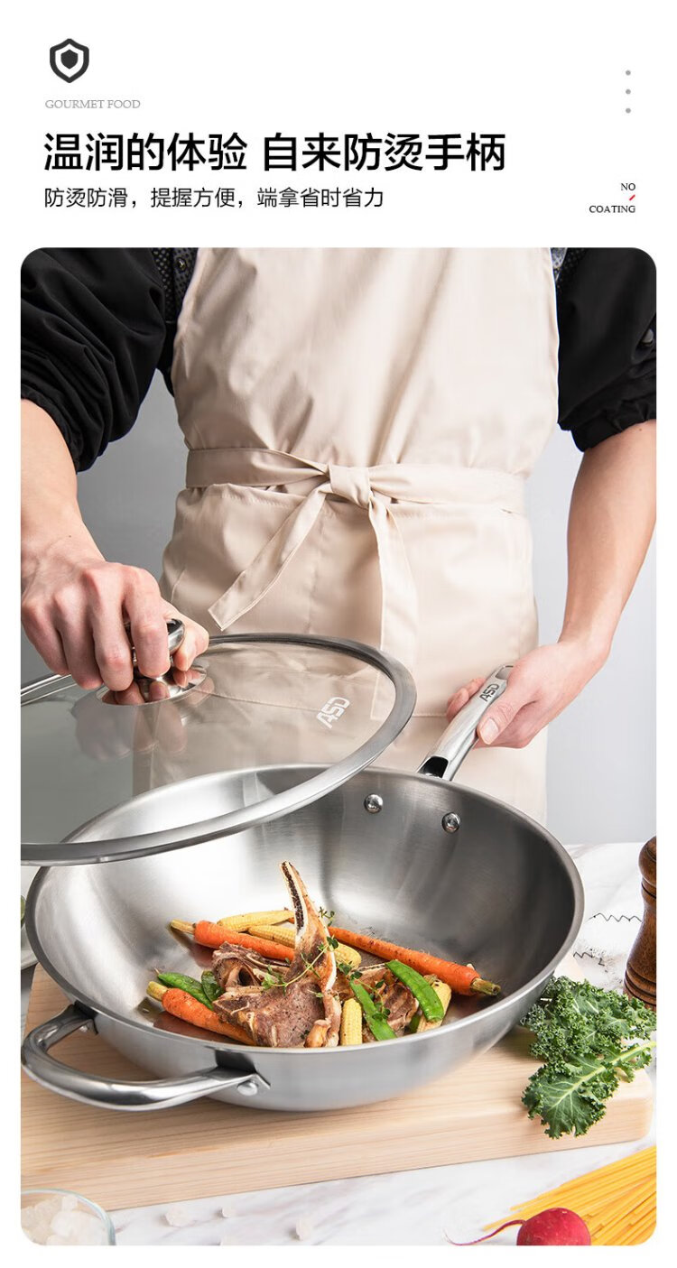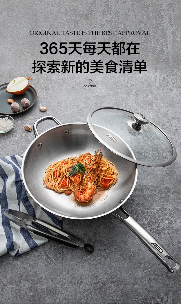 ASD wok 304 stainless steel uncoated household wok 32cm gas induction cooker universal TV1332