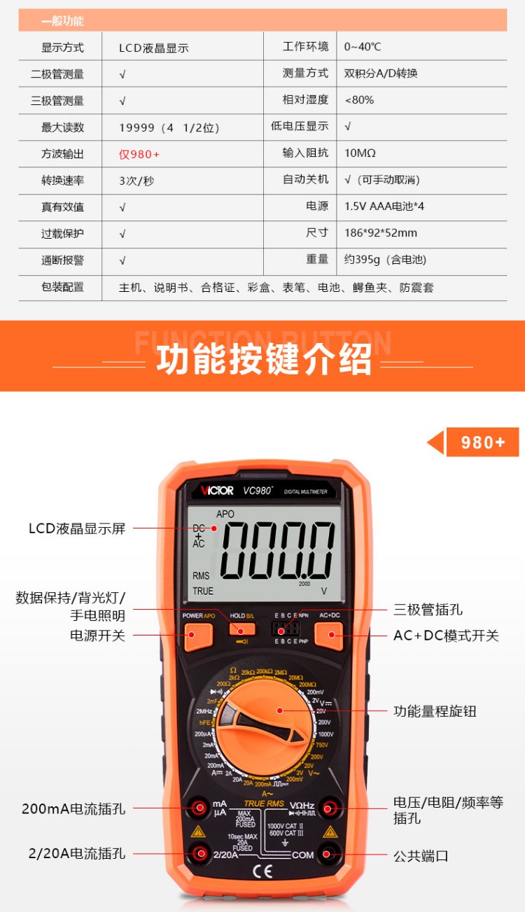 Victory Instrument (VICTOR) high-precision digital multimeter four-and-a-half-digit multimeter for home use with backlight frequency conductivity VC9807A+