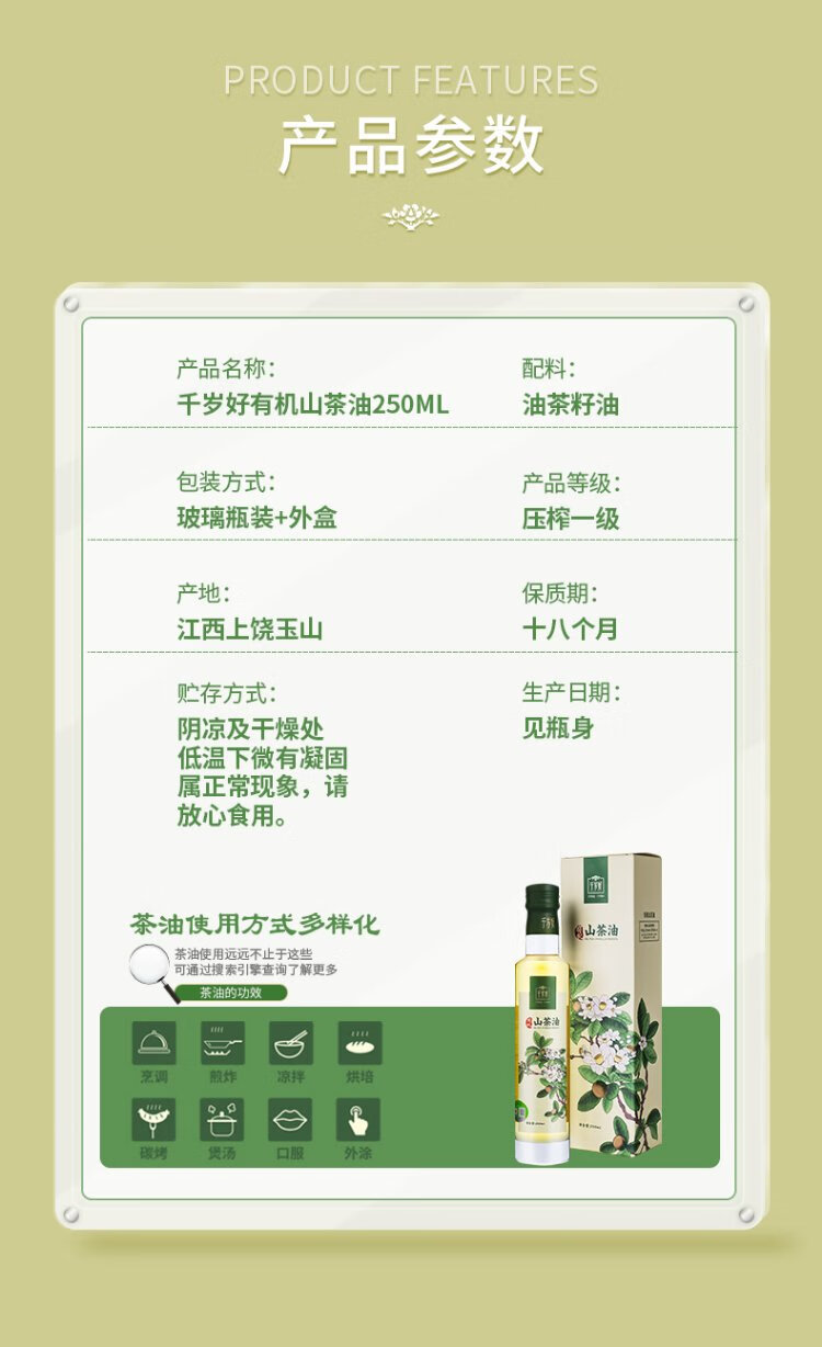 Chitosehao Fidelity Camellia Oil Camellia Oil Organic Camellia Seed Oil Pressed Level 1 250ml Suitable for Pregnant Women and Babies