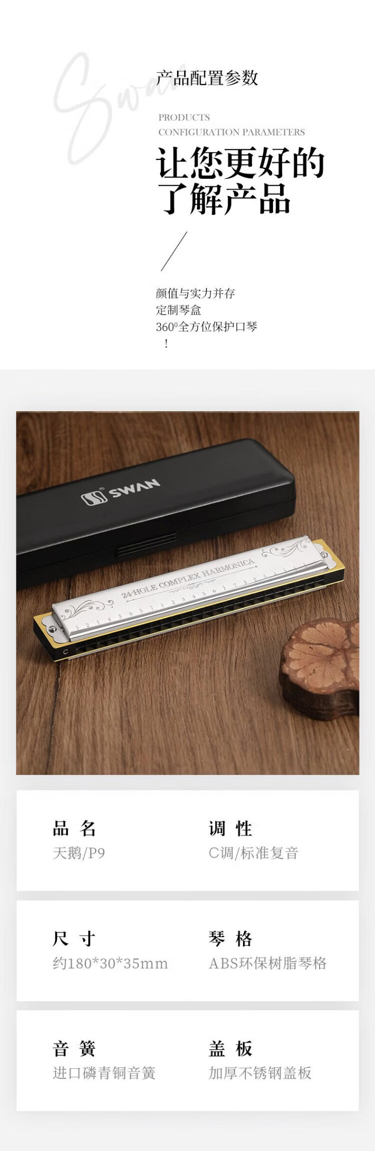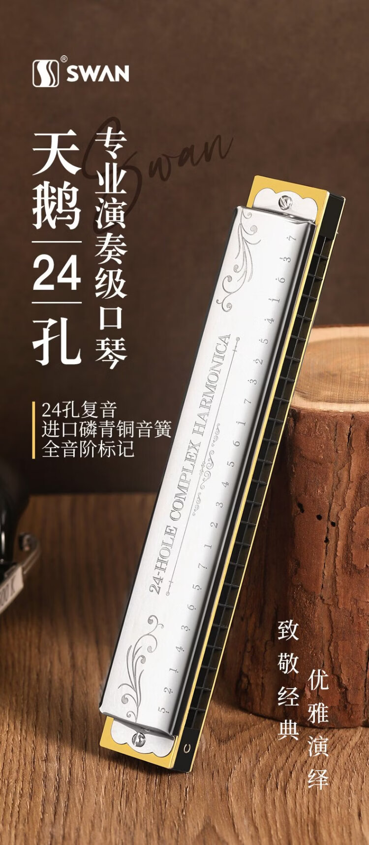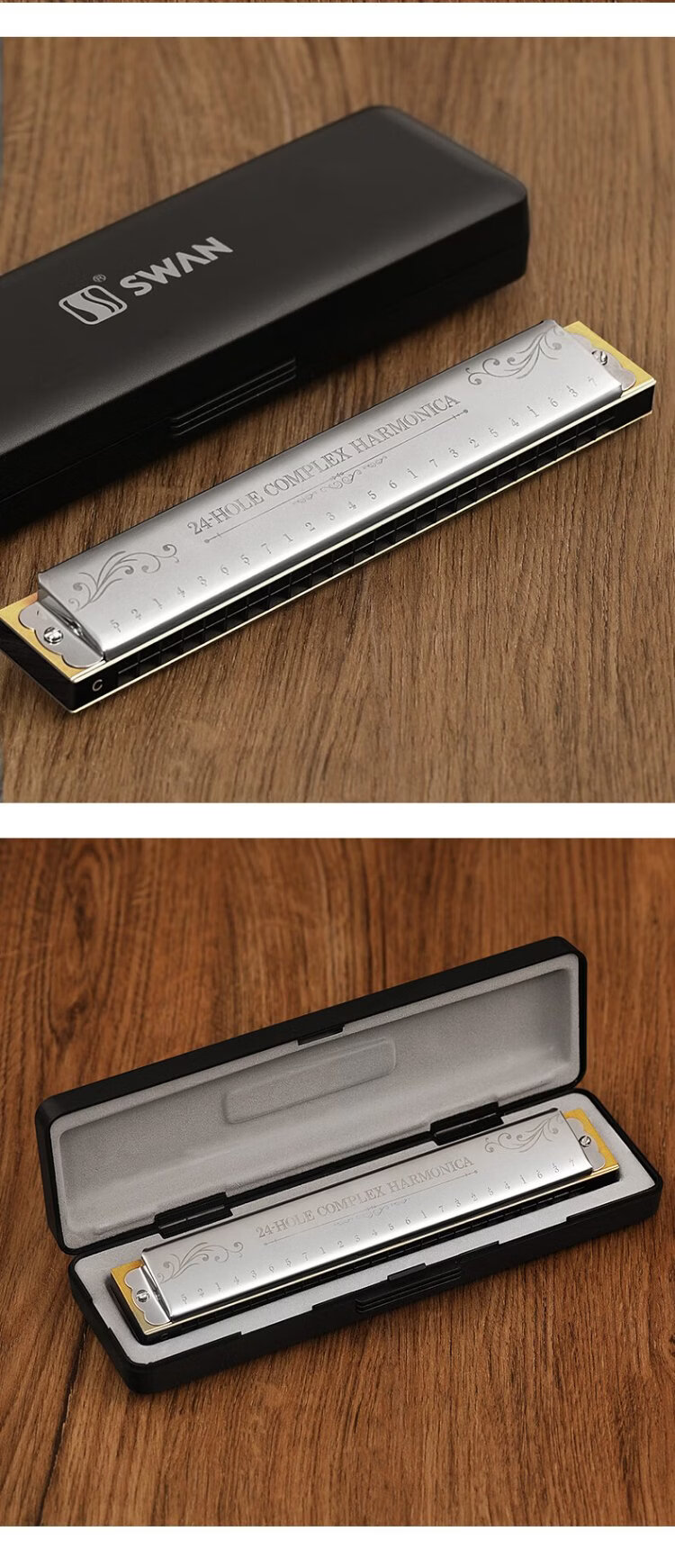 Swan (SWAN) 24-hole polyphonic playing harmonica in C key with phonetic markings for students and adults teaching recommended musical instrument silver
