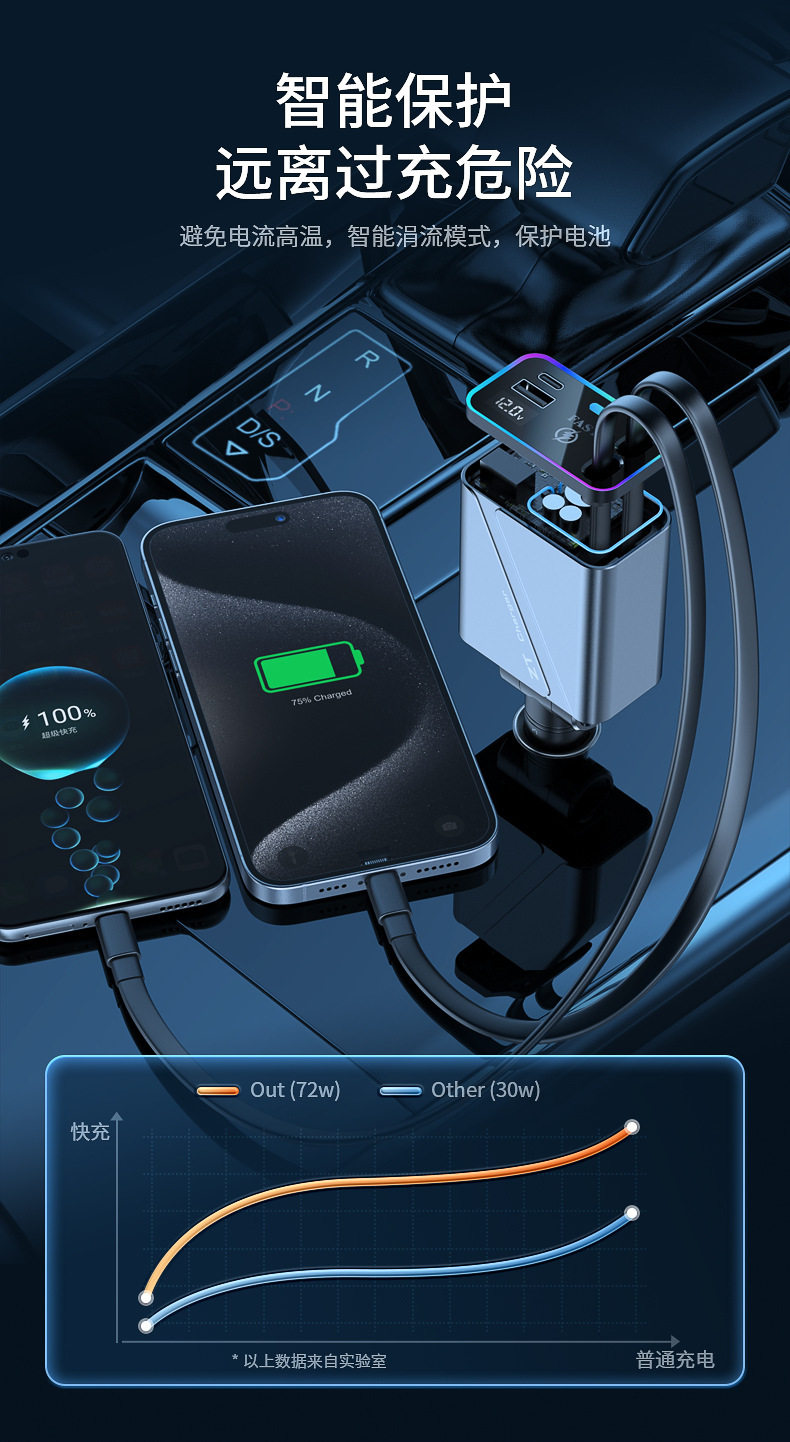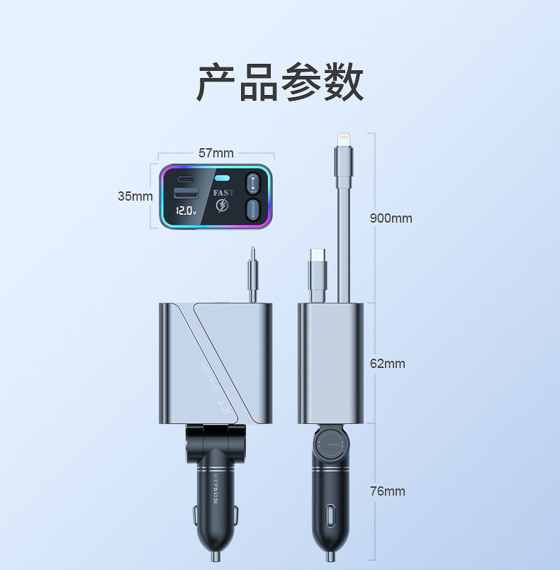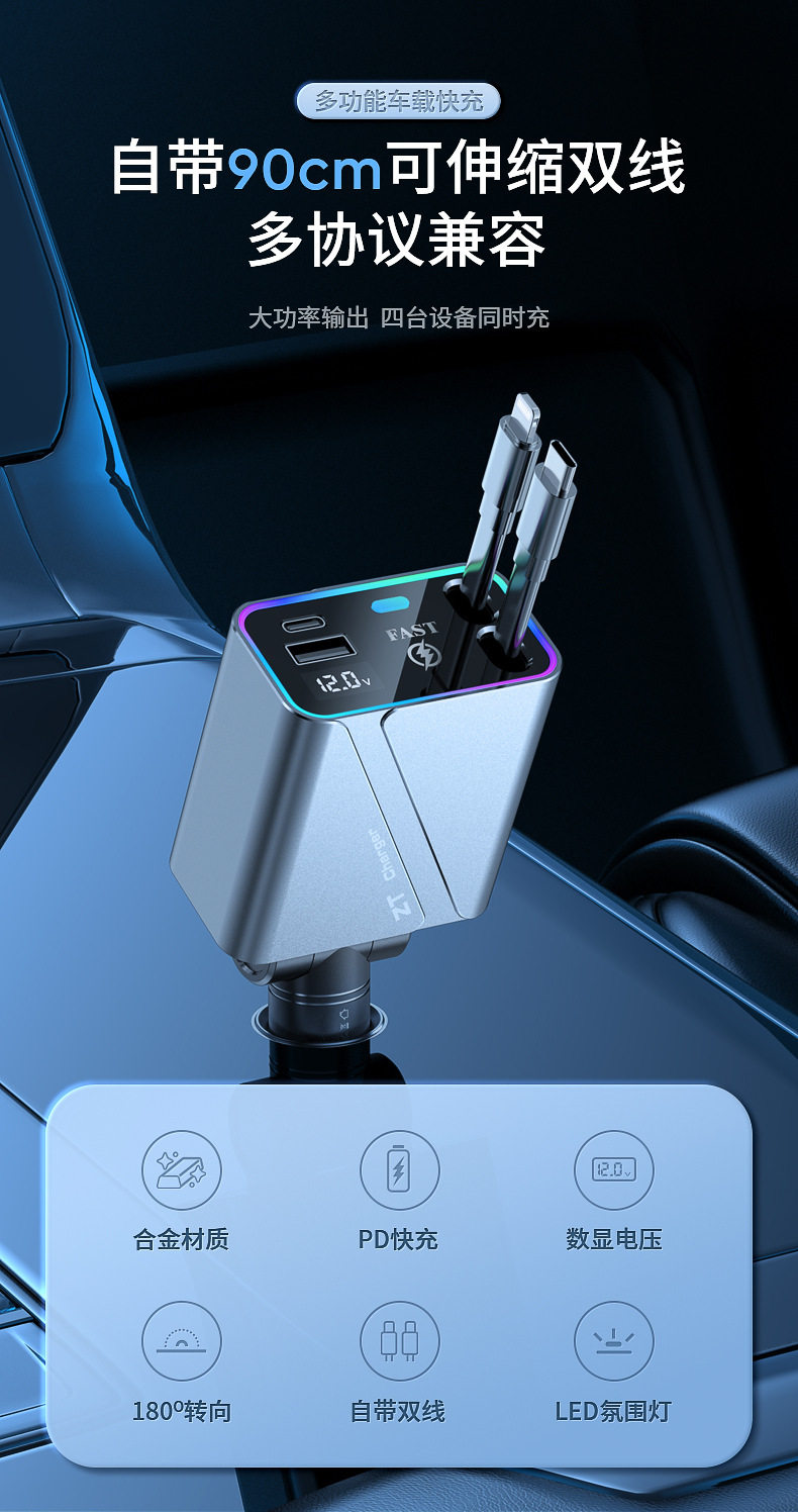 Cross-Border Car Charger Retractable Cable Super Fast Charging Apple One to Two Cigarette Lighter W Suitable for Huawei Xiaomi Typ