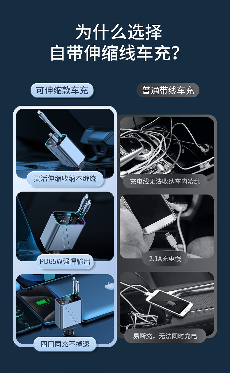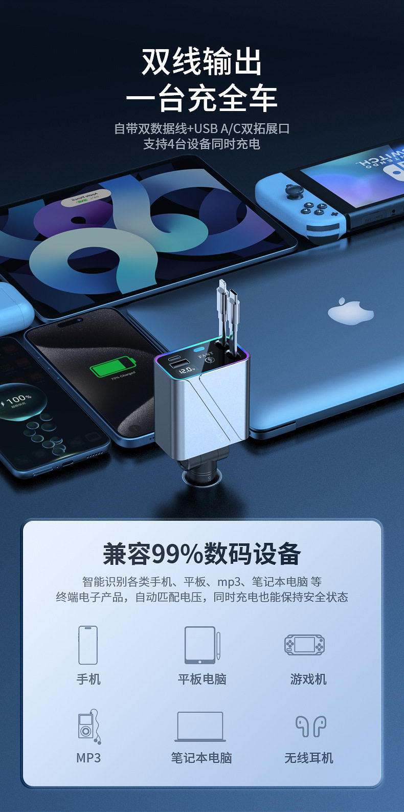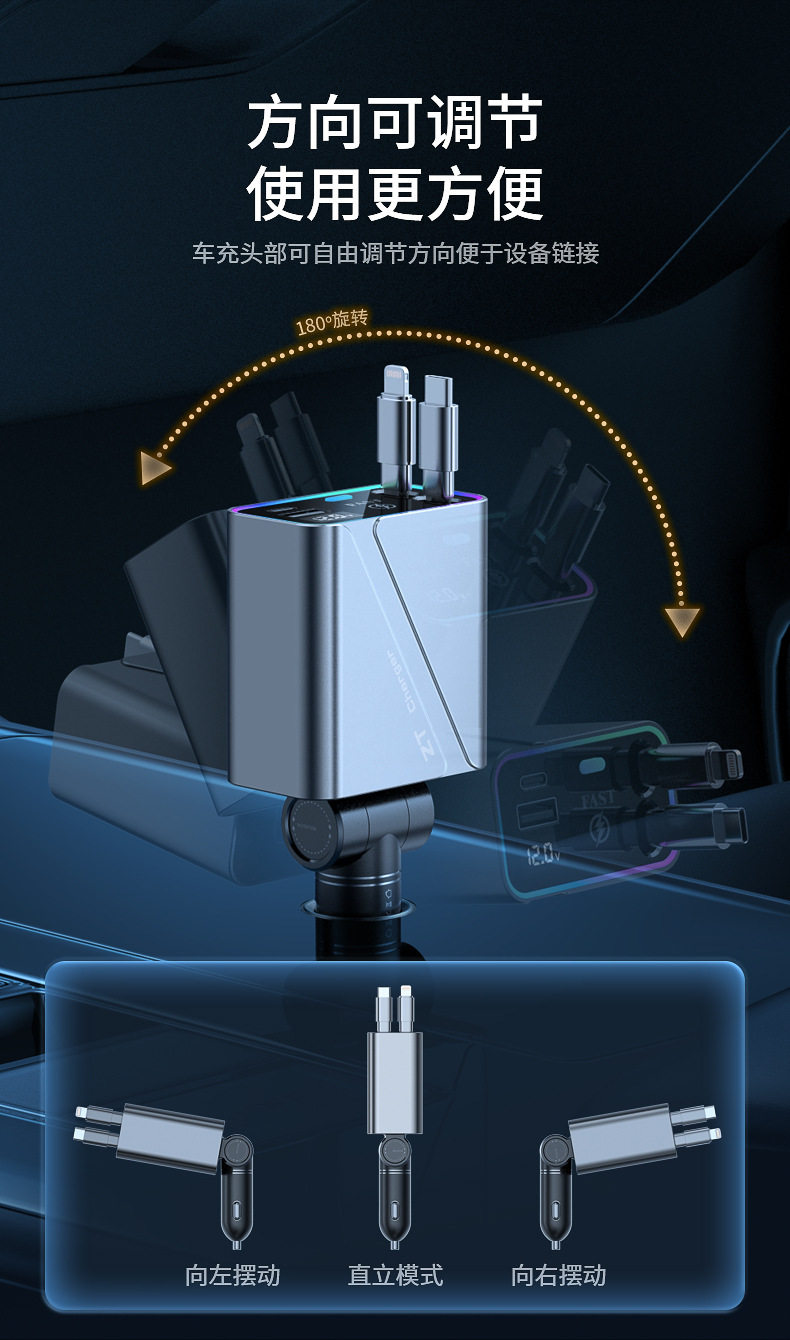 Cross-Border Car Charger Retractable Cable Super Fast Charging Apple One to Two Cigarette Lighter W Suitable for Huawei Xiaomi Typ