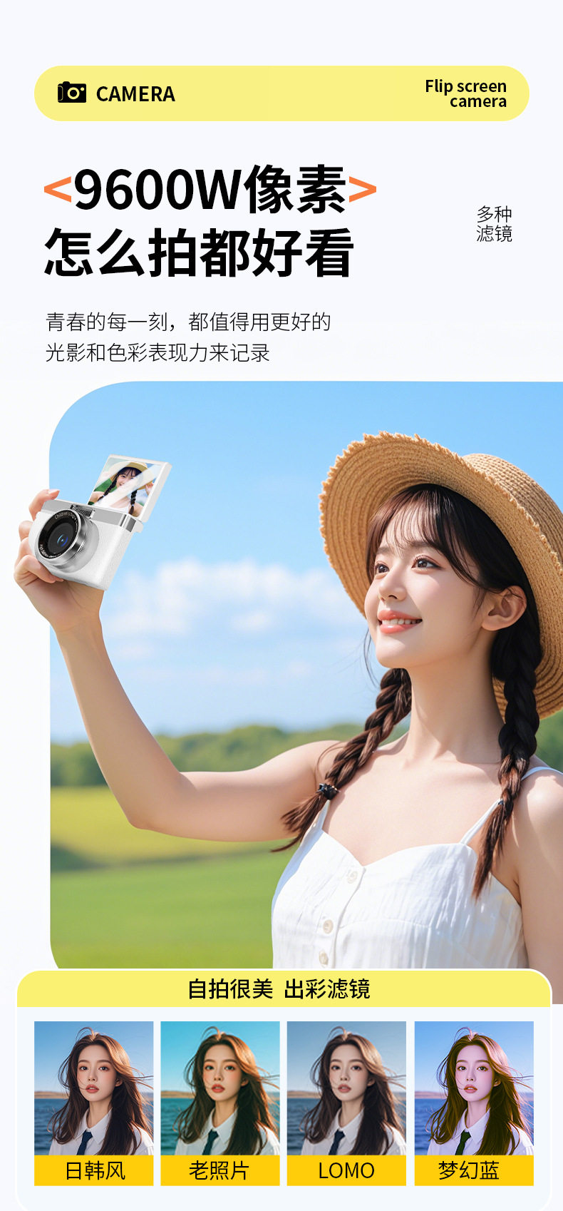| Body color | Y02 [white] hd 6400w flip screen camera,Y02 [black] hd 6400w flip screen camera,Y02 [brown] hd 6400w flip screen camera,Y02 [matcha green] hd 6400w flip screen camera,H13 [white] hd 9600w flip screen camera,H13 [black] hd 9600w flip screen camera,H13 [green] hd 9600w flip screen camera,Z6 [white] hd 4800w flip screen camera,Z6 [black] hd 4800w flip screen camera,Z6 [pink] hd 4800w flip screen camera |