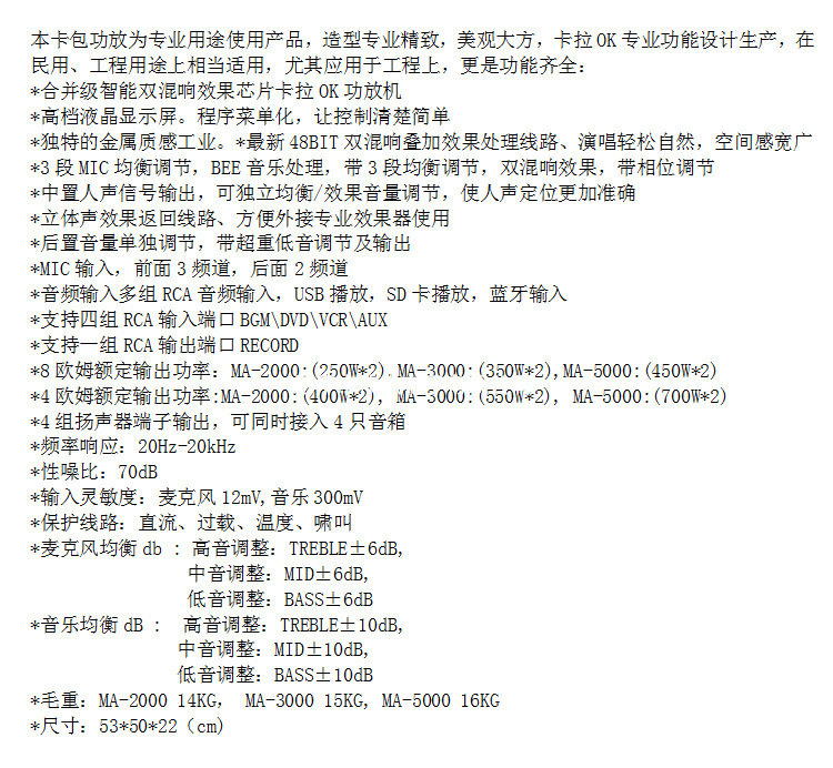 | Product specifications | Ma-250 (250w*2ch),Ma-350 (350w*2ch),Ma-450 (450w*2ch) |