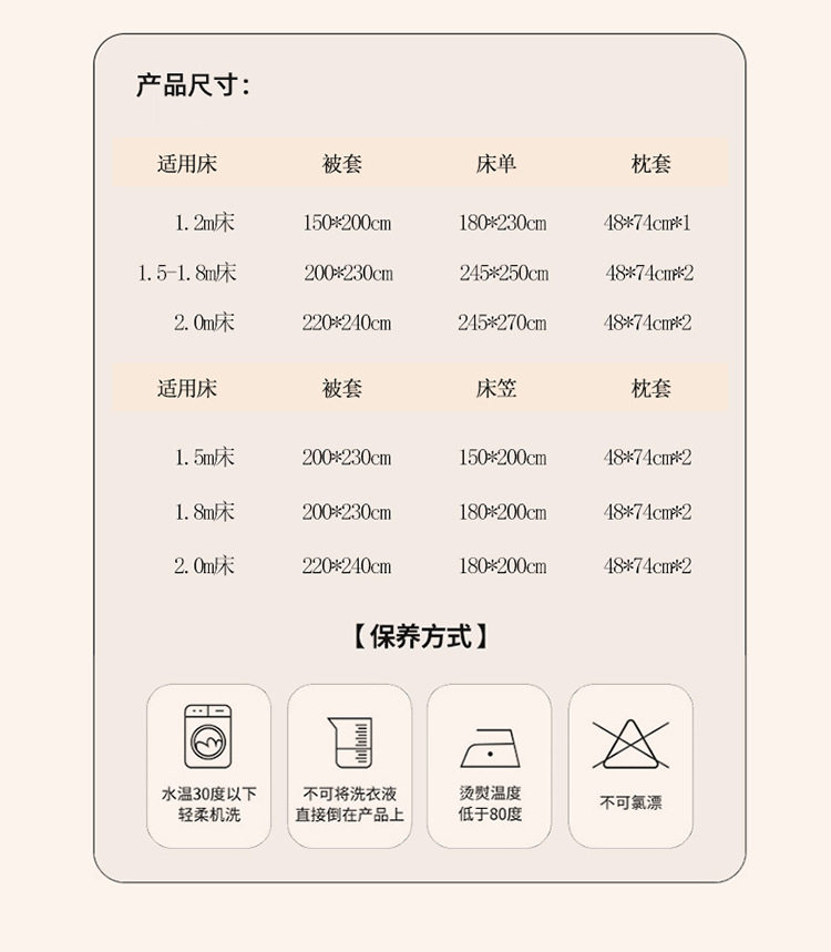 | Size specifications | 0.9m bed [three-piece sheet set] - suitable for 150*200cm quilt core,1.2m bed [three-piece sheet set] - suitable for 150*200cm quilt core,1.5m bed [sheet set of four] - suitable for 200*230cm quilt core,1.8m bed [sheet set of four] - suitable for 200*230cm quilt core,2.0m bed [four-piece sheet set] - suitable for 220*240cm quilt core,1.5m bed [four-piece fitted sheet set] - suitable for 200*230cm quilt core,1.8m bed [four-piece fitted sheet set] - suitable for 200*230cm quilt core,1.8m bed enlarged [four-piece fitted sheet set] - suitable for 220*240cm quilt core |
