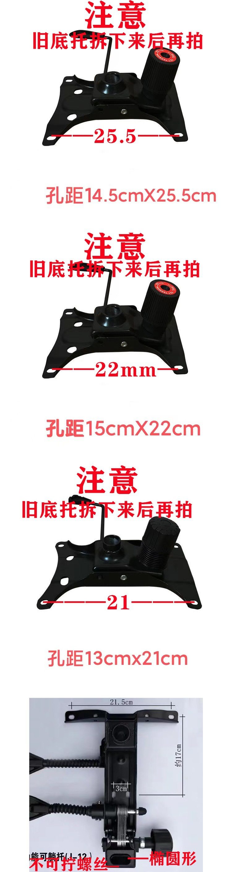 | Specifications | 8x8cm1.2mm thick round bottom bracket,8x8cm1.2mm thick round base + screw + spacer + inner hexagon,8x8cm 1.5mm thick round base,8x8cm 1.5mn thick bottom bracket + screws + gaskets + inner hexagon,10x10cm 1.5mm thick round bottom bracket,10x10cm 1.5mm thick bottom bracket + screws + spacers + inner hexagon,10x10cm 2.0mm thick round bottom bracket,10x10cm 2.0mm thick bottom bracket + screws + spacers + inner hexagon,13.7x17.5cm 1.8mm thick dovetail mop,13.7x17.5cm 1.8mm thick bottom bracket + screw + spacer + inner hexagon,14x17.5cm 2.6mm thick bottom bracket + screws + spacers + inner hexagon,13x21cm 2.0mn thick xiaoyao bottom bracket + screws + gaskets + inner hexagon,Reclining gaming chair base |