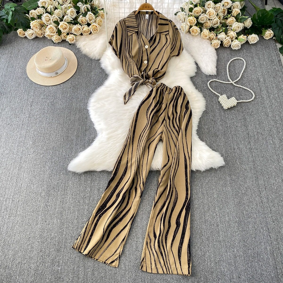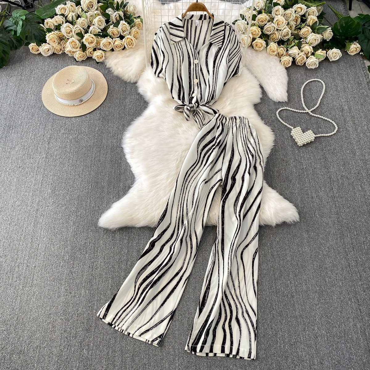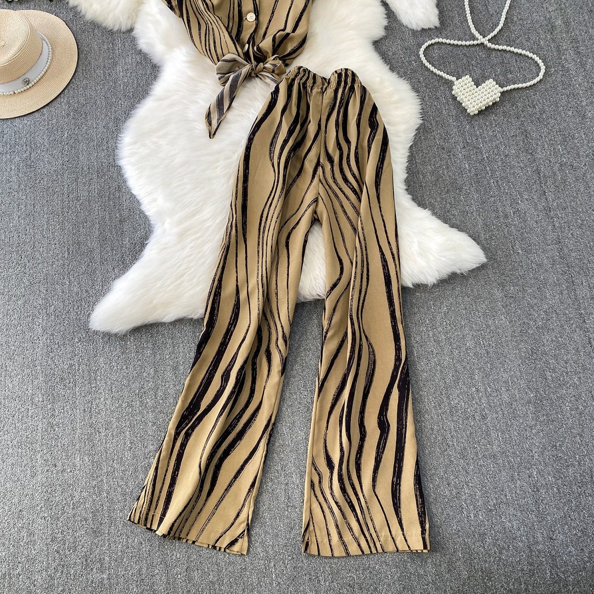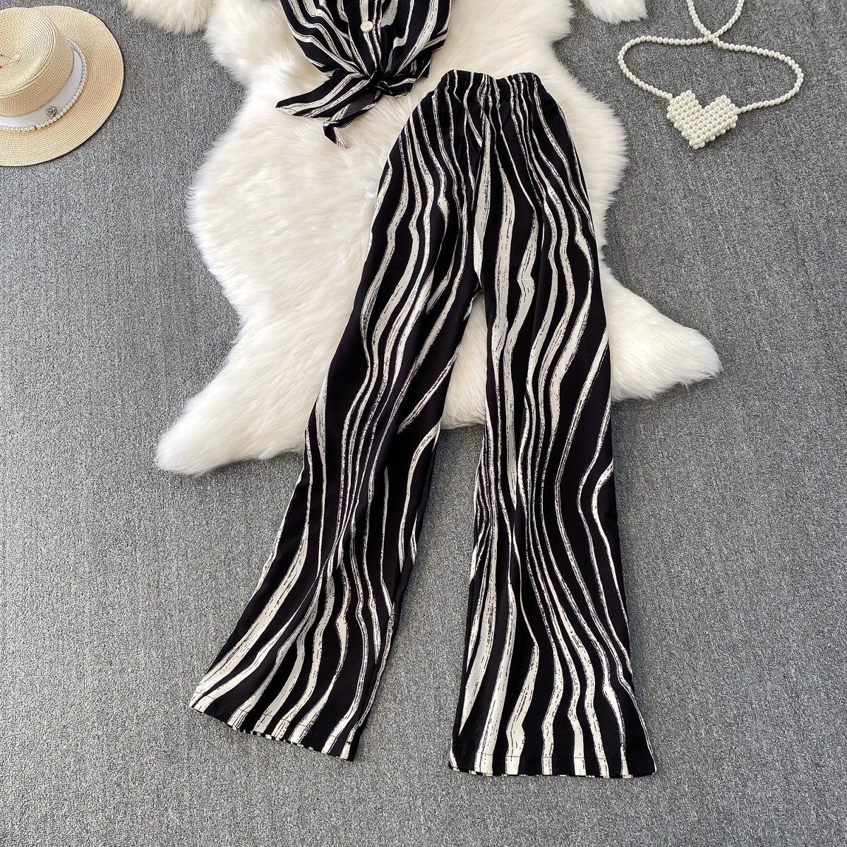 Hong Kong Style Ins Tie Waist Single-Breasted Lapel Short Light Mature Style Striped Shirt Casual Wide-Leg Pants Two-Piece Set