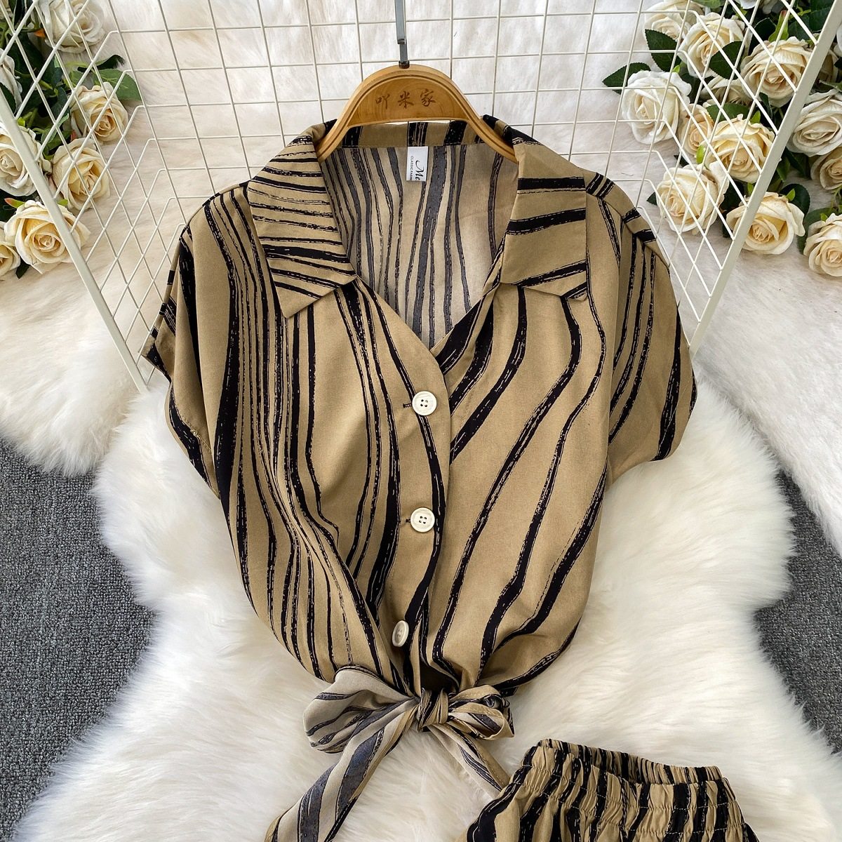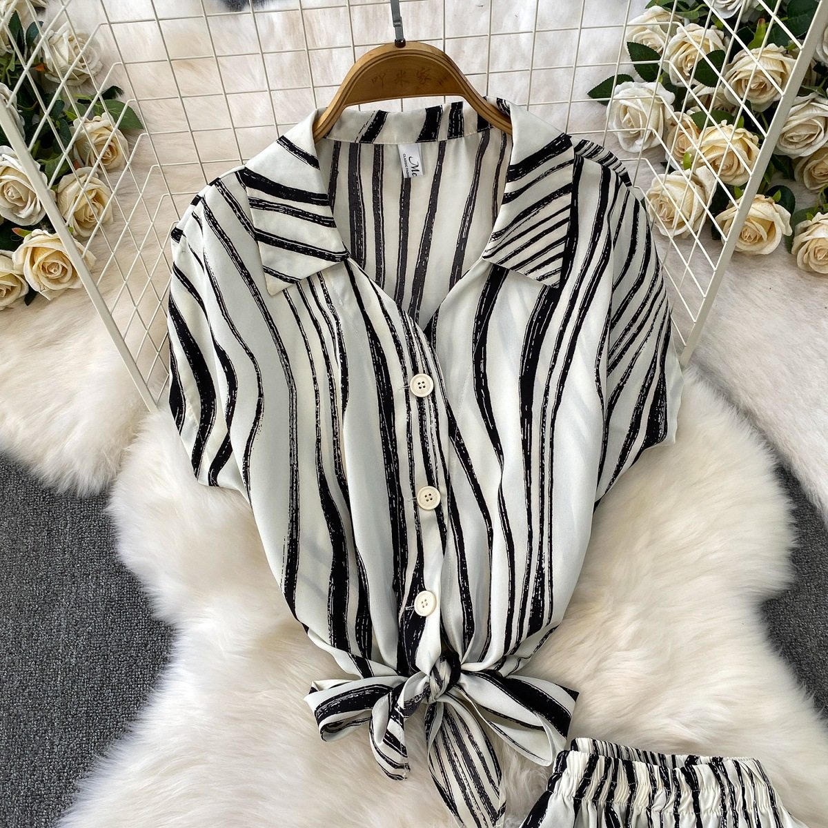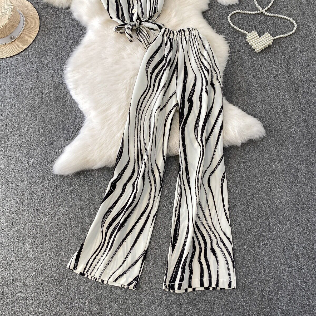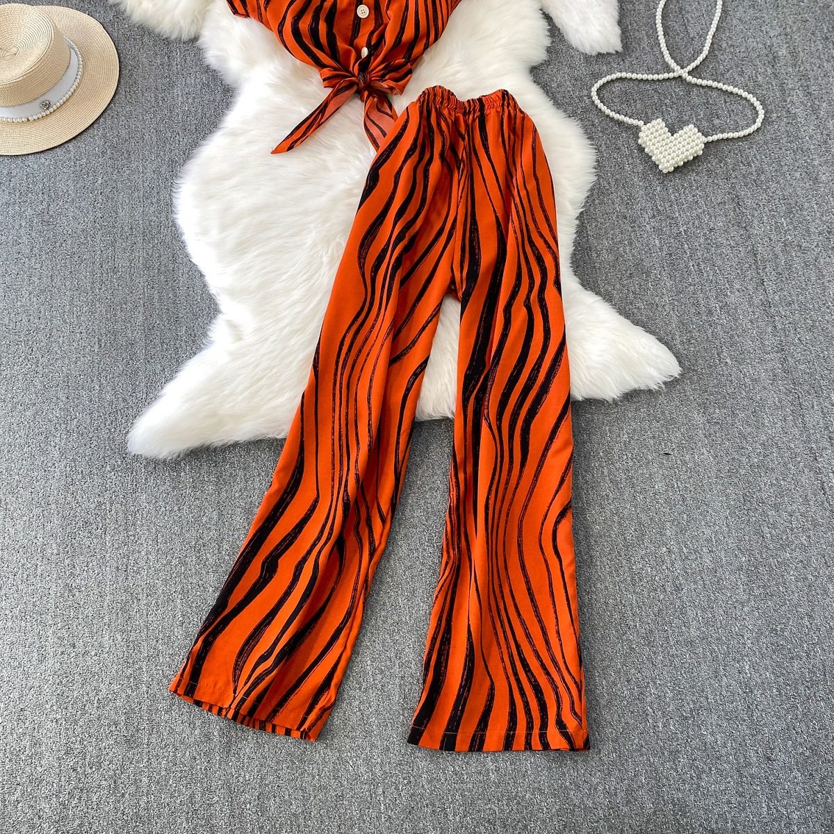 Hong Kong Style Ins Tie Waist Single-Breasted Lapel Short Light Mature Style Striped Shirt Casual Wide-Leg Pants Two-Piece Set