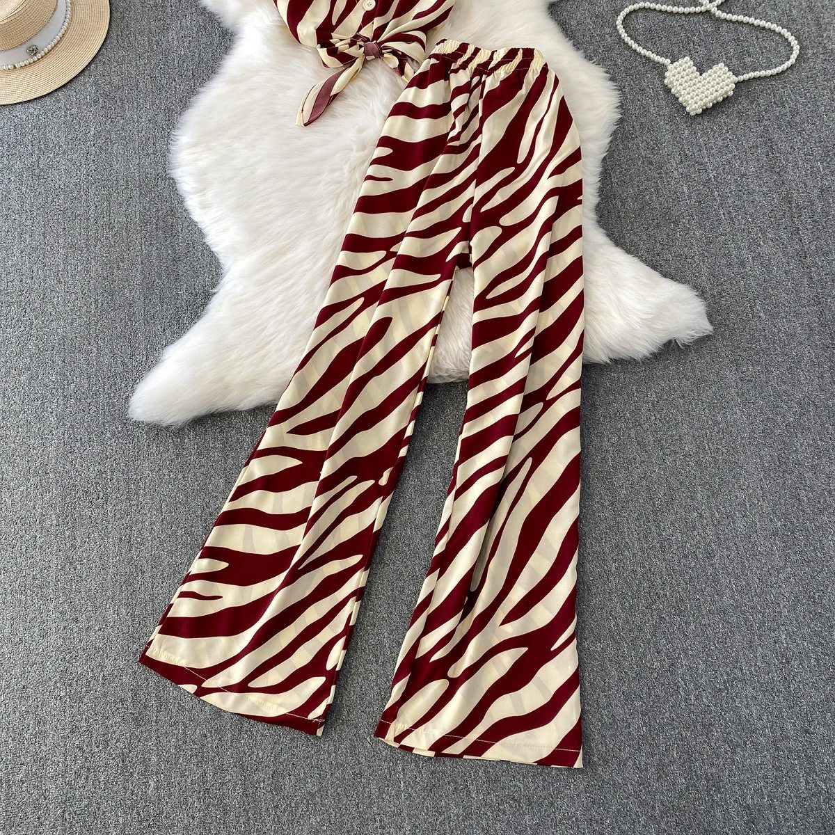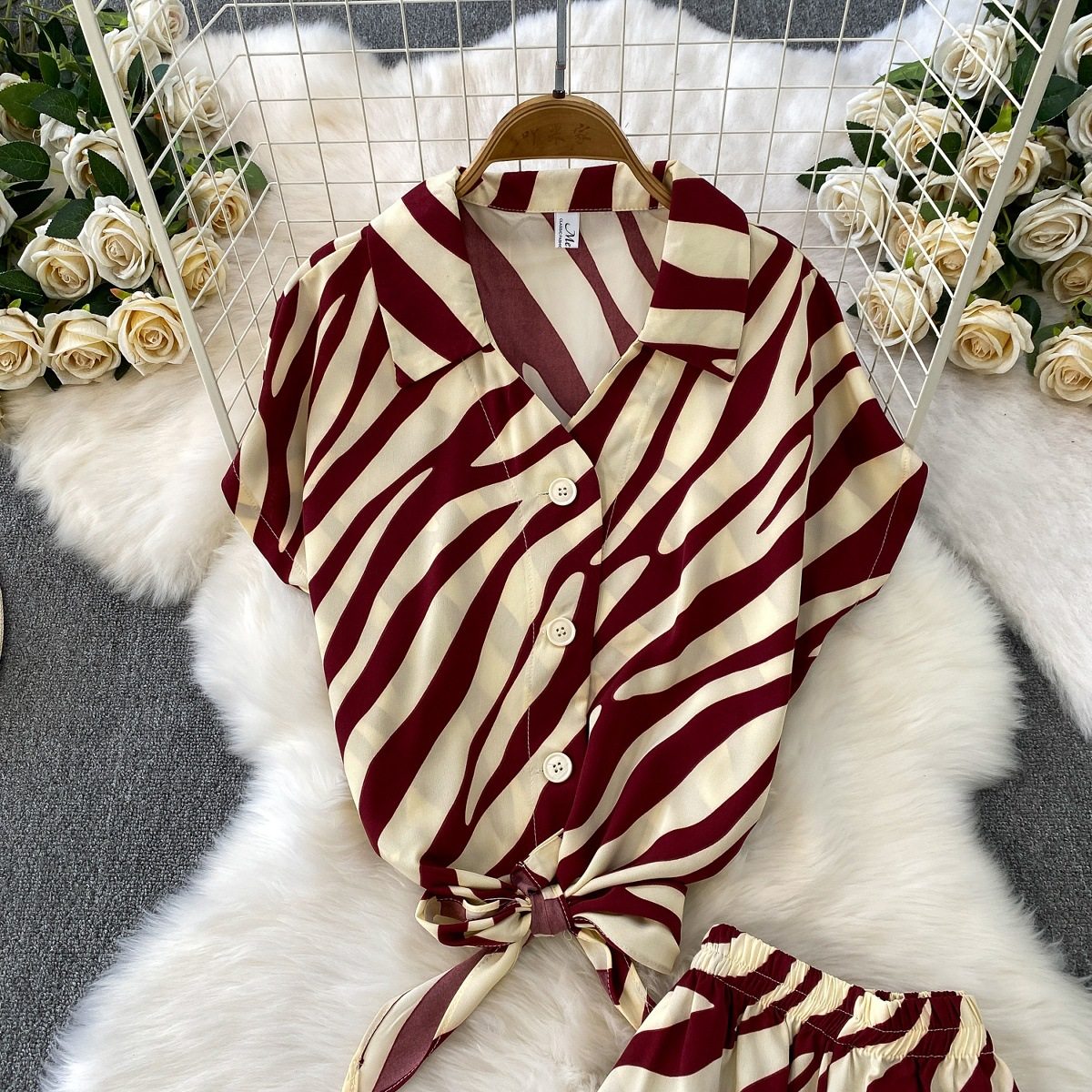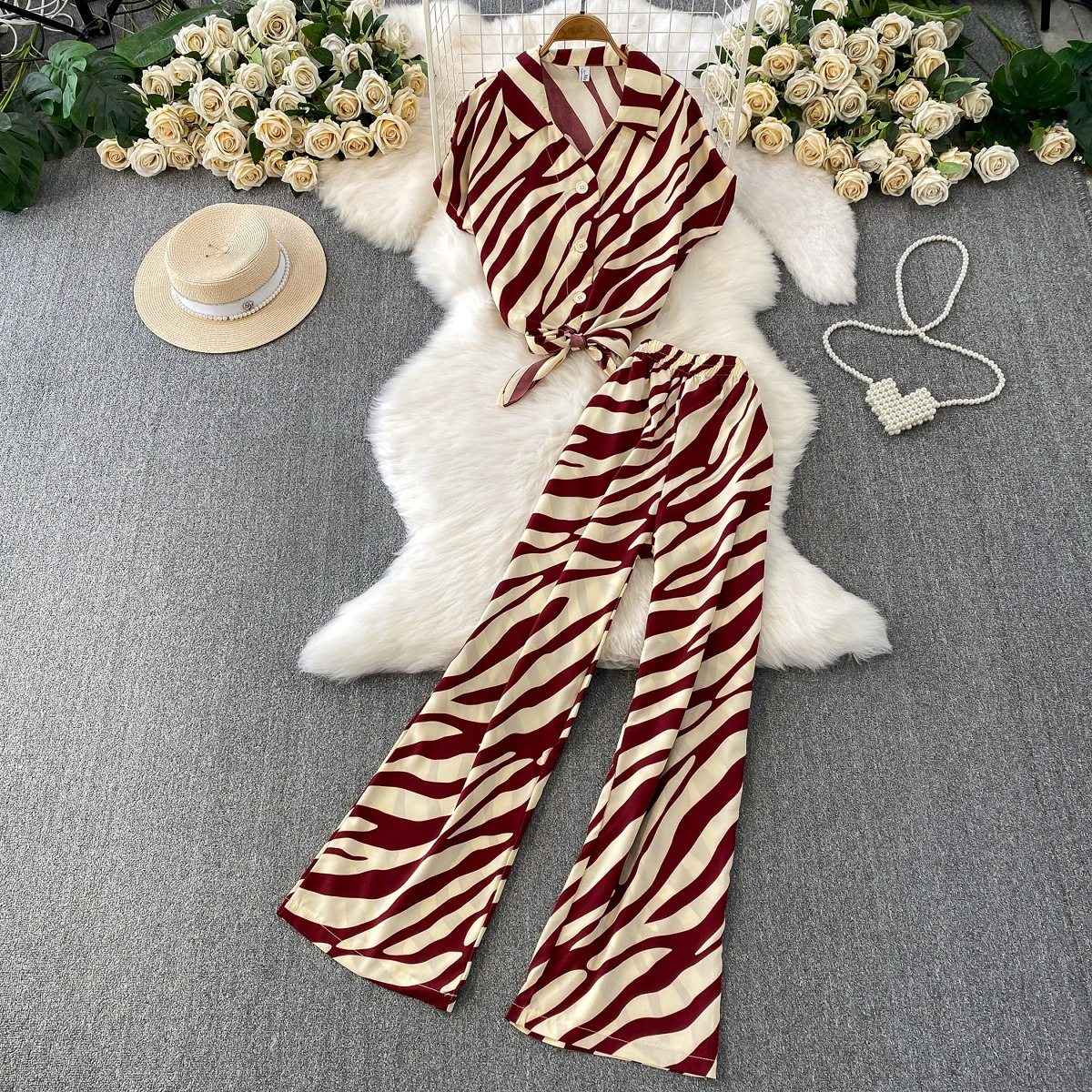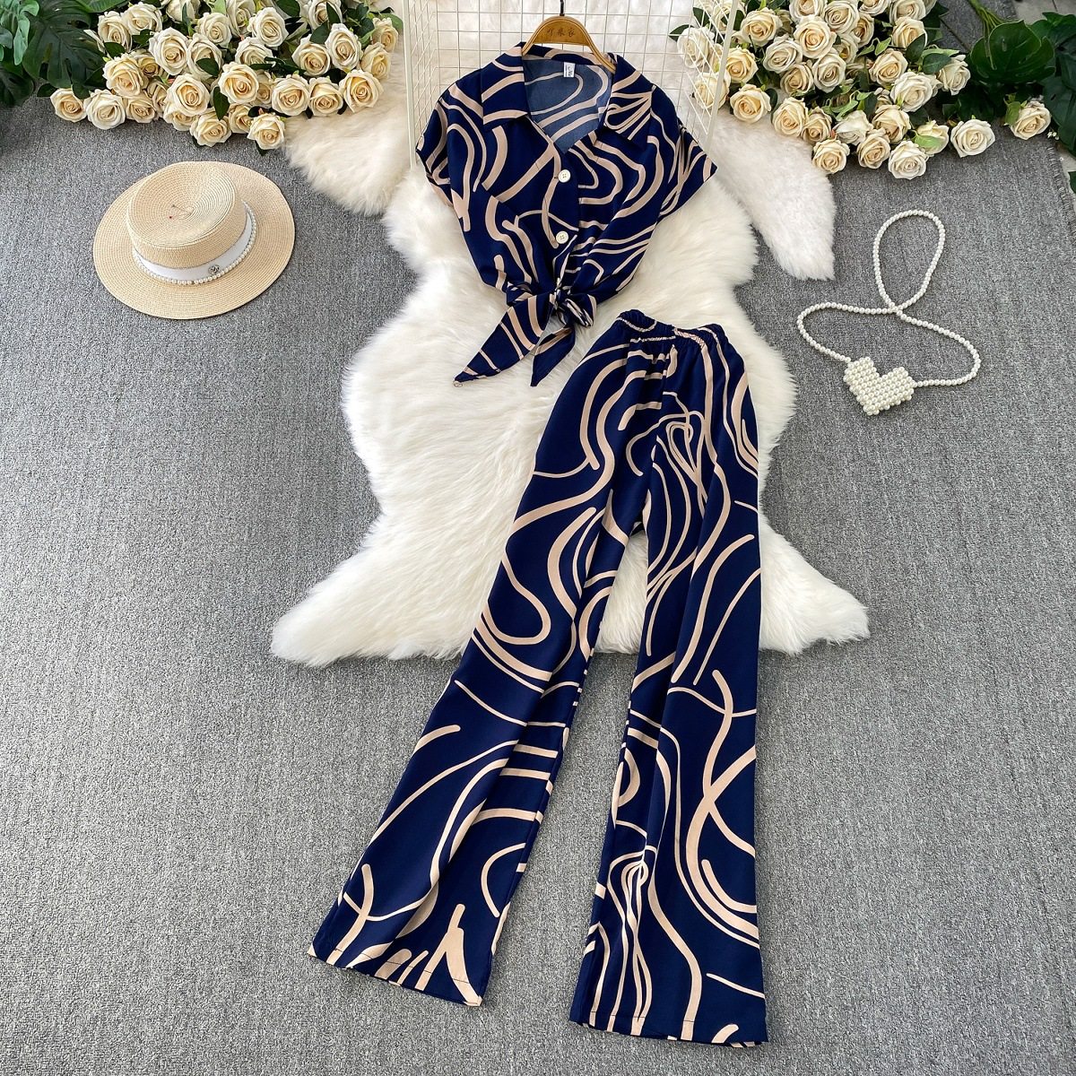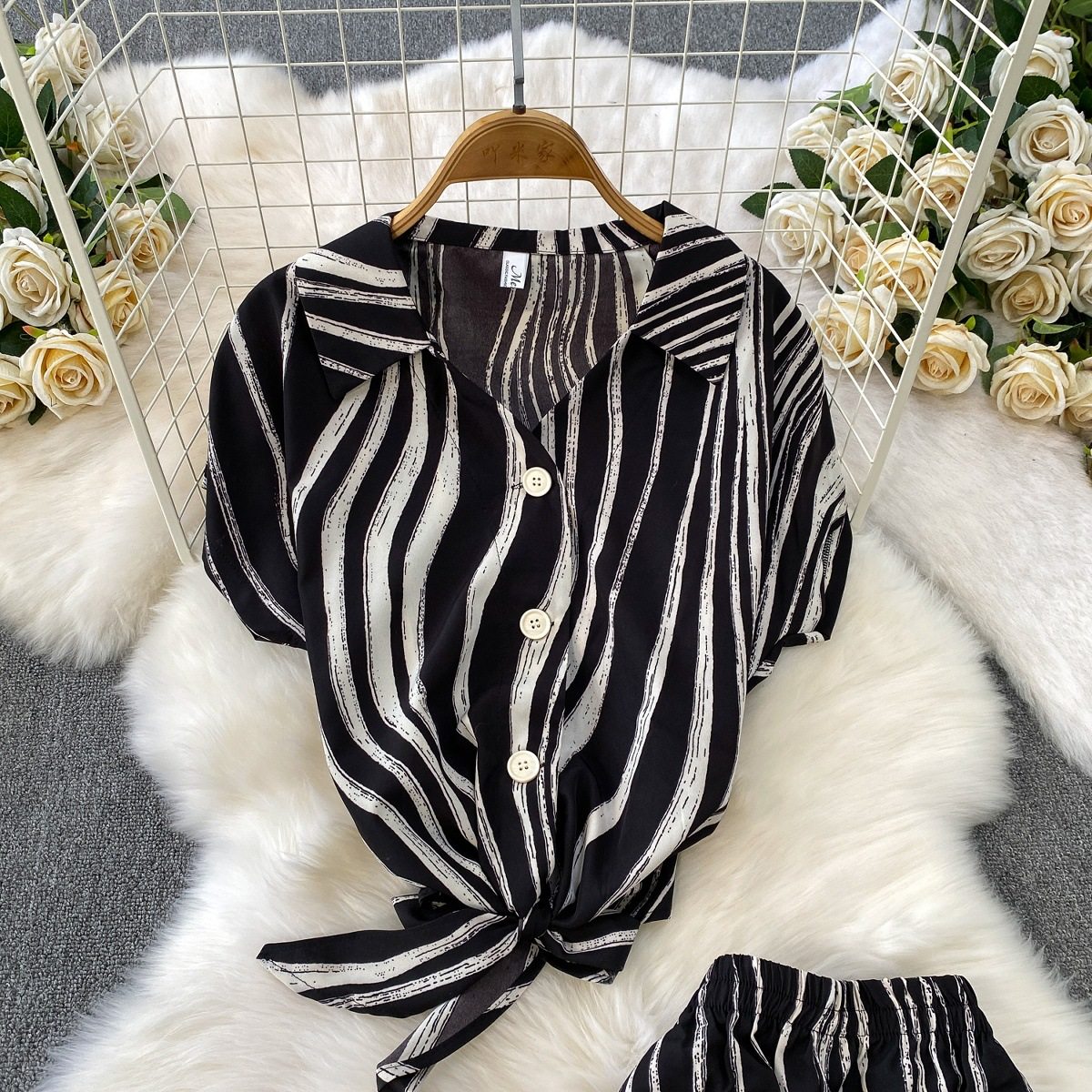 Hong Kong Style Ins Tie Waist Single-Breasted Lapel Short Light Mature Style Striped Shirt Casual Wide-Leg Pants Two-Piece Set