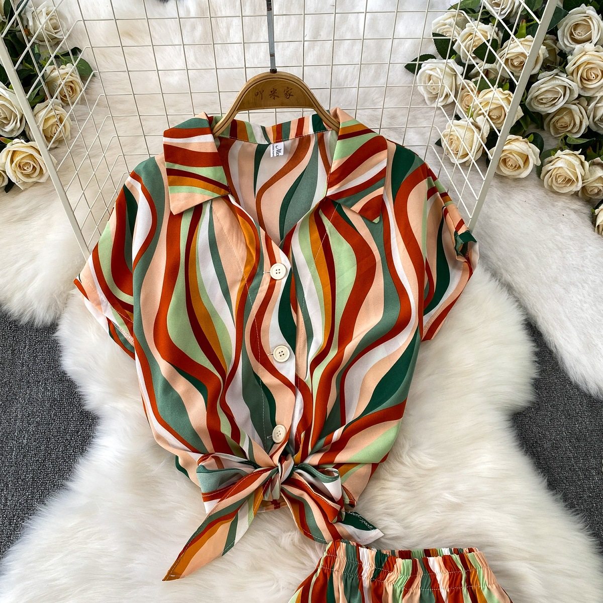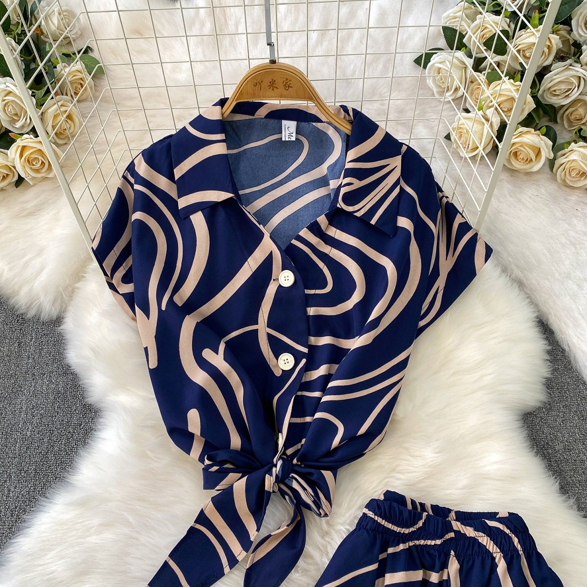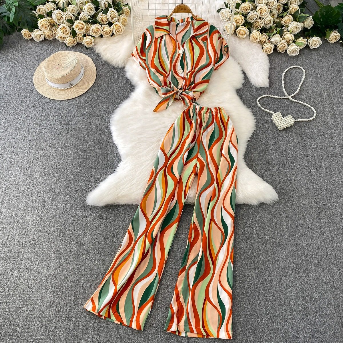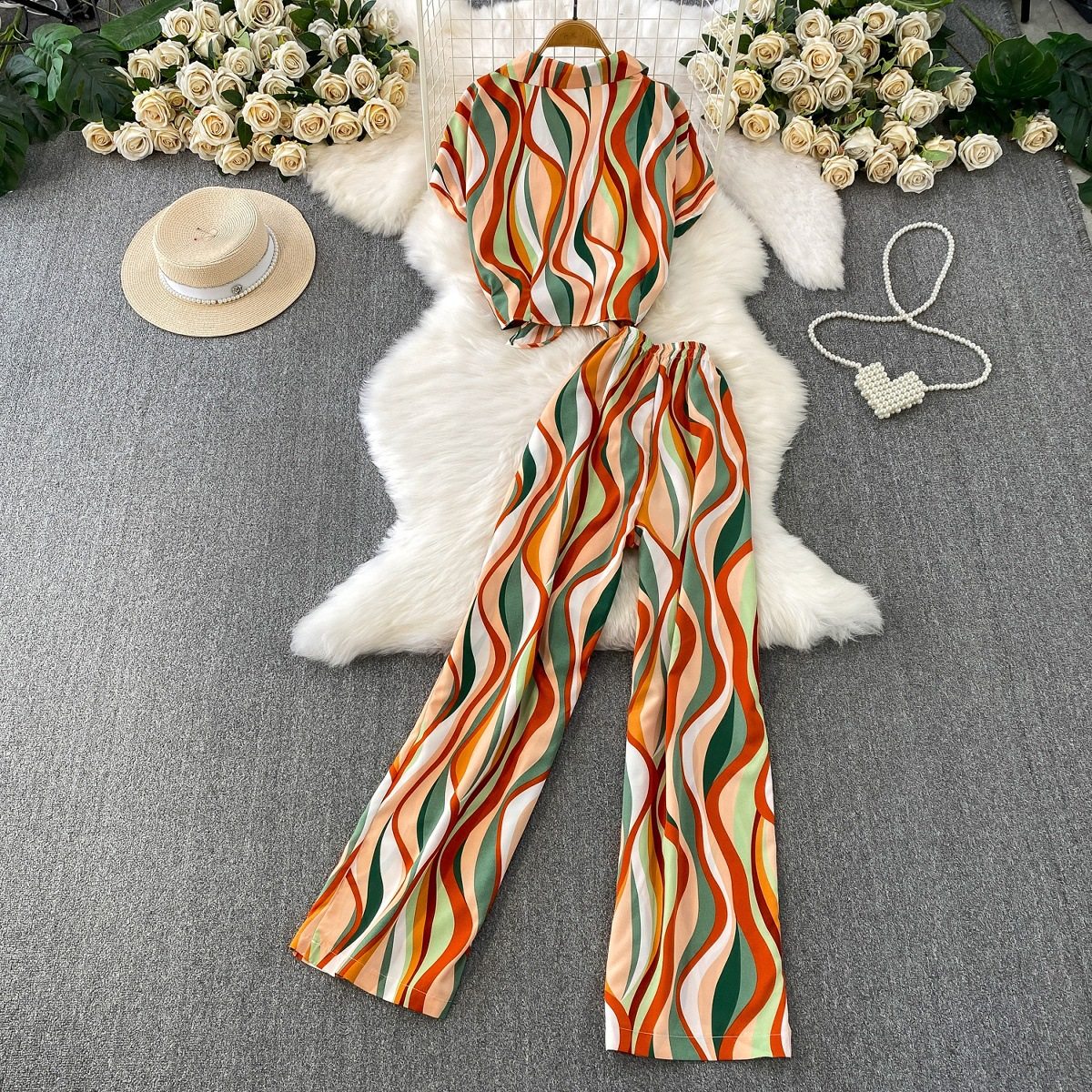 Hong Kong Style Ins Tie Waist Single-Breasted Lapel Short Light Mature Style Striped Shirt Casual Wide-Leg Pants Two-Piece Set