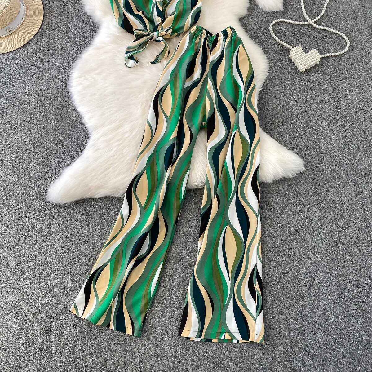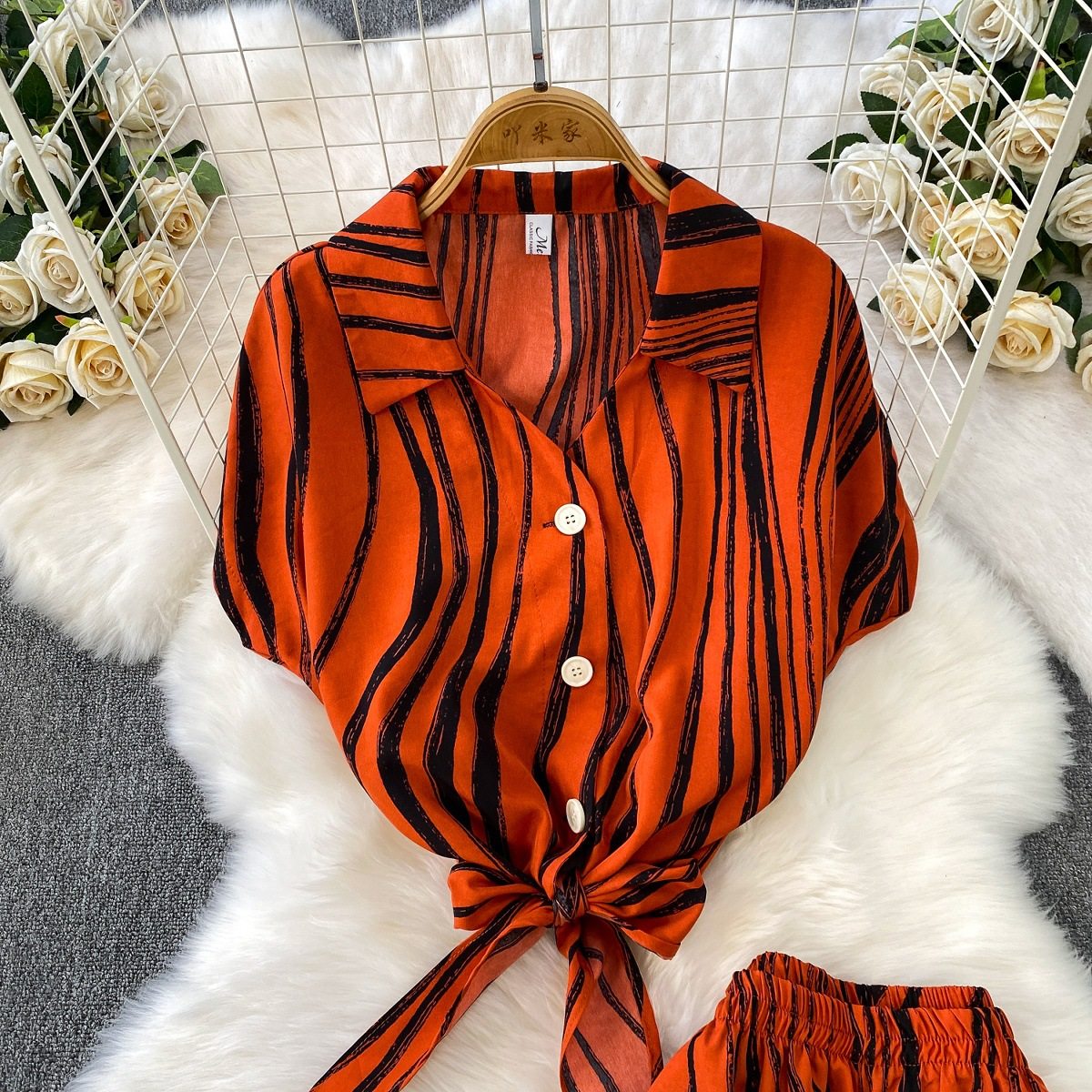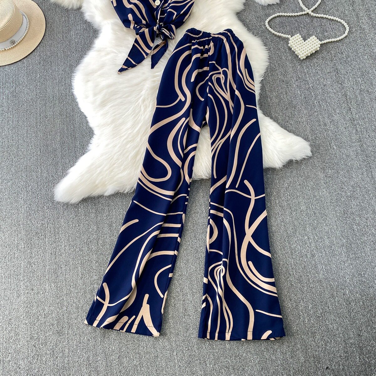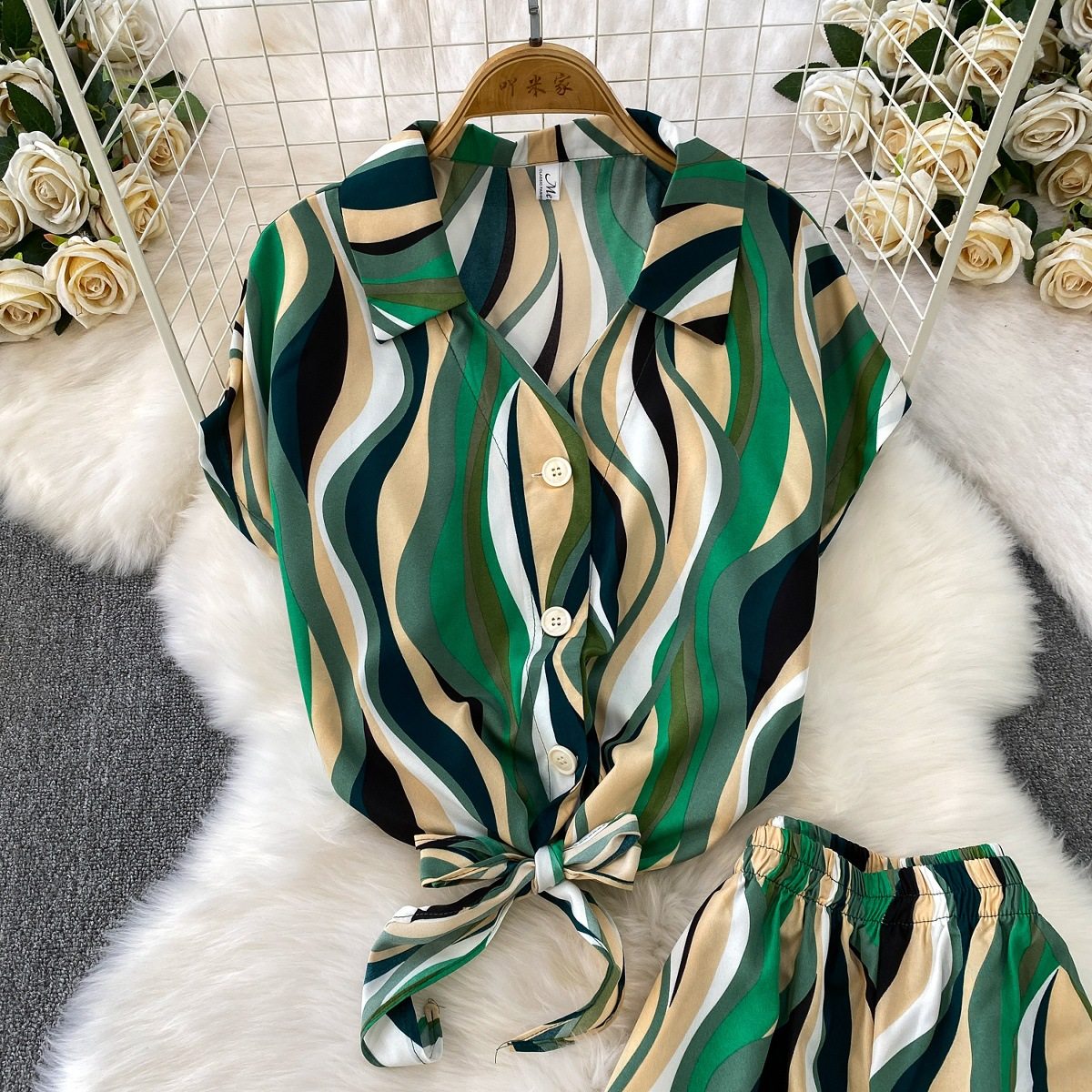 Hong Kong Style Ins Tie Waist Single-Breasted Lapel Short Light Mature Style Striped Shirt Casual Wide-Leg Pants Two-Piece Set
