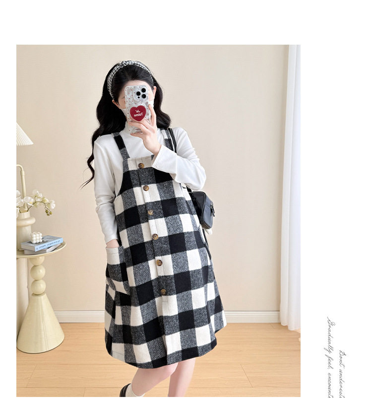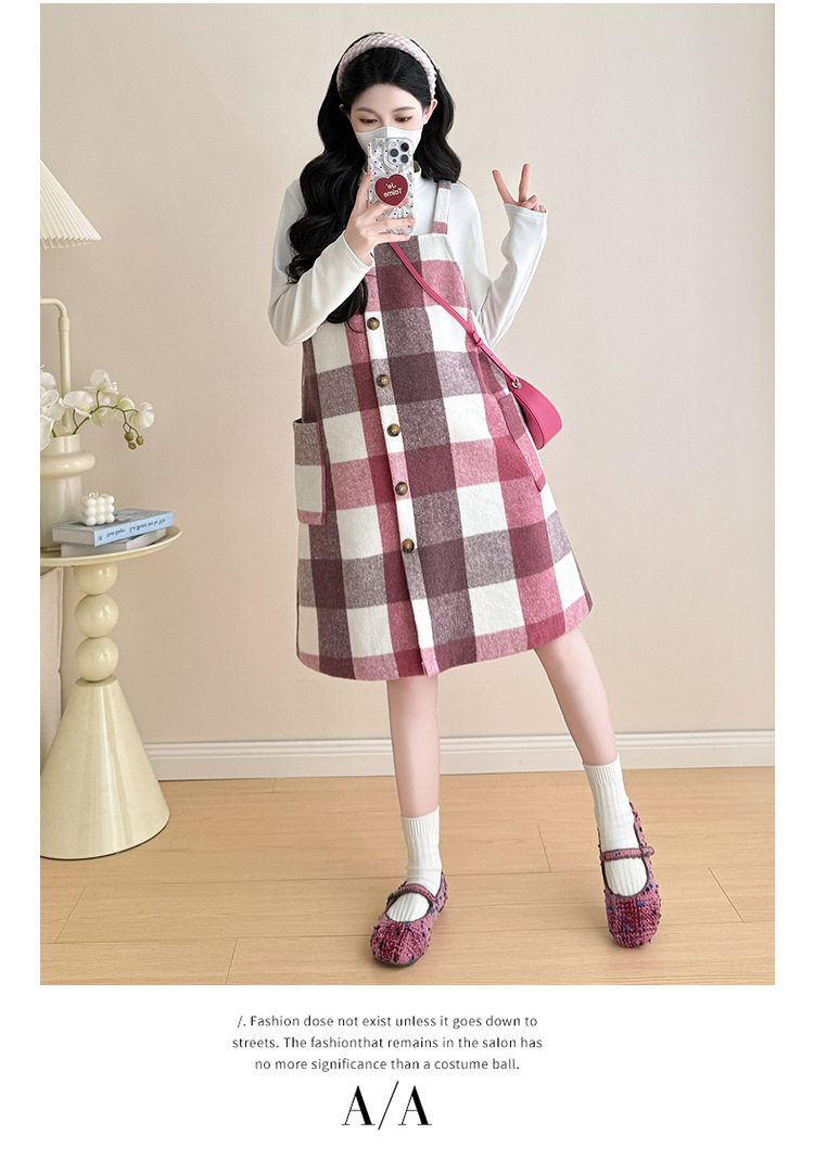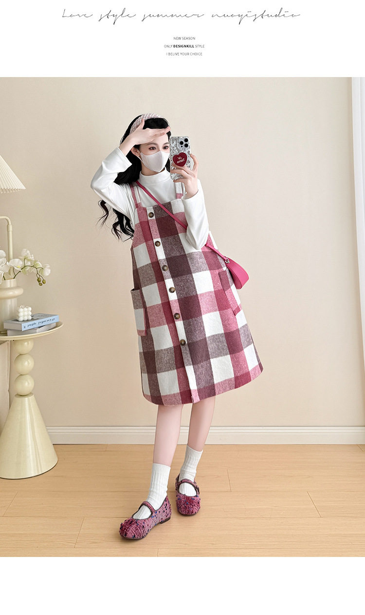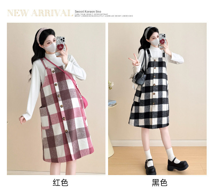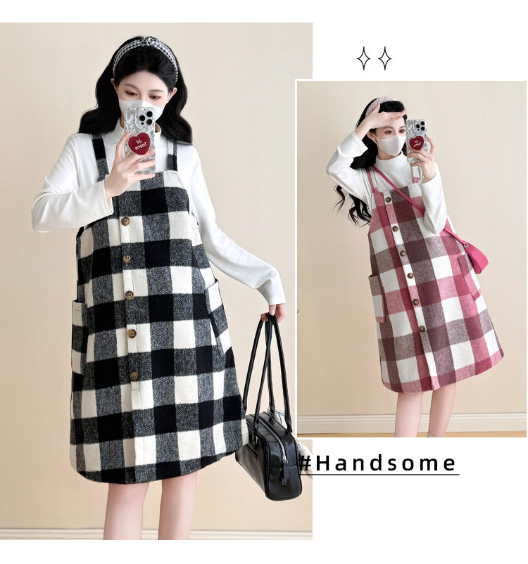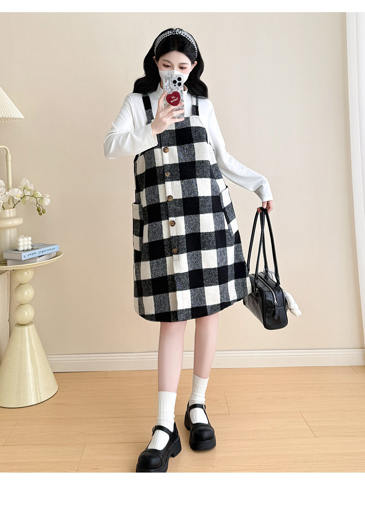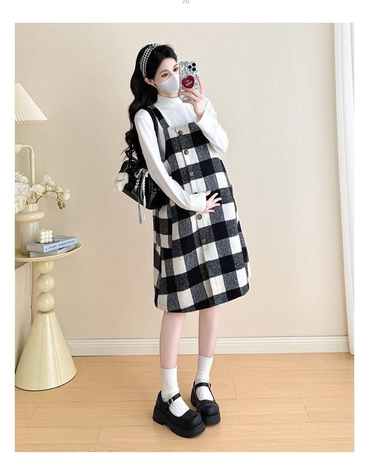 2025 New Autumn and Winter Thickened Comfortable Belly-Covering Suspender Dress, Versatile and Slimming Plaid Maternity Suit Dress for Commuting