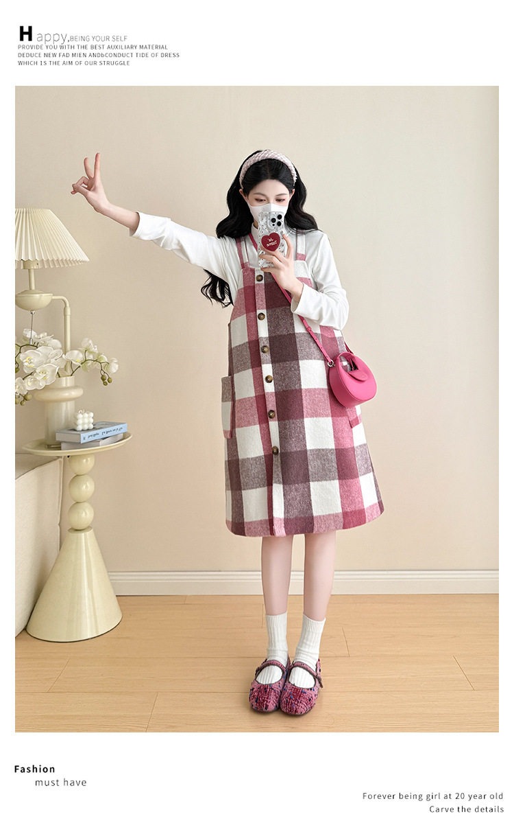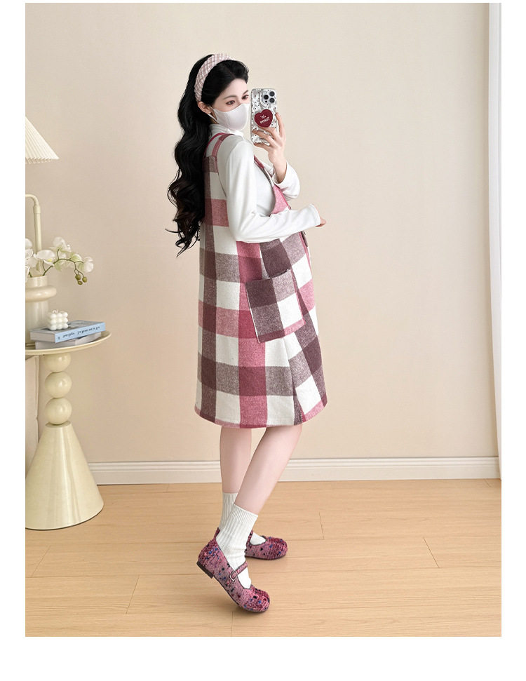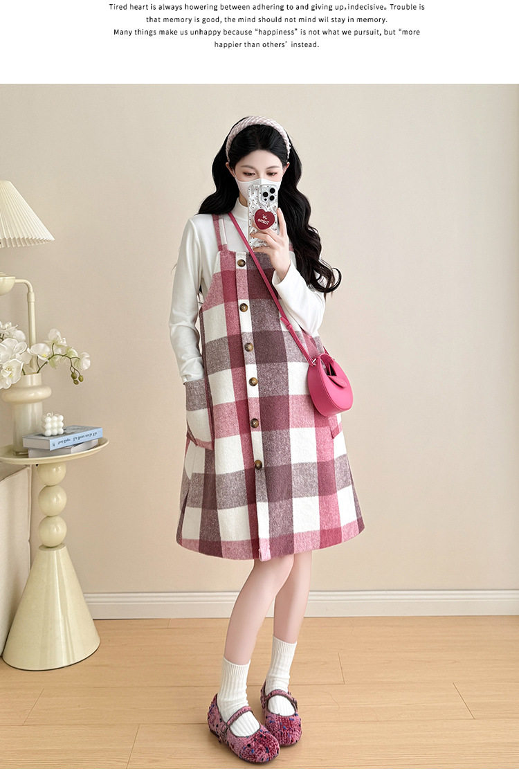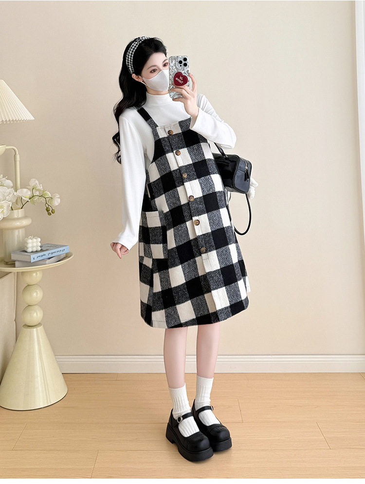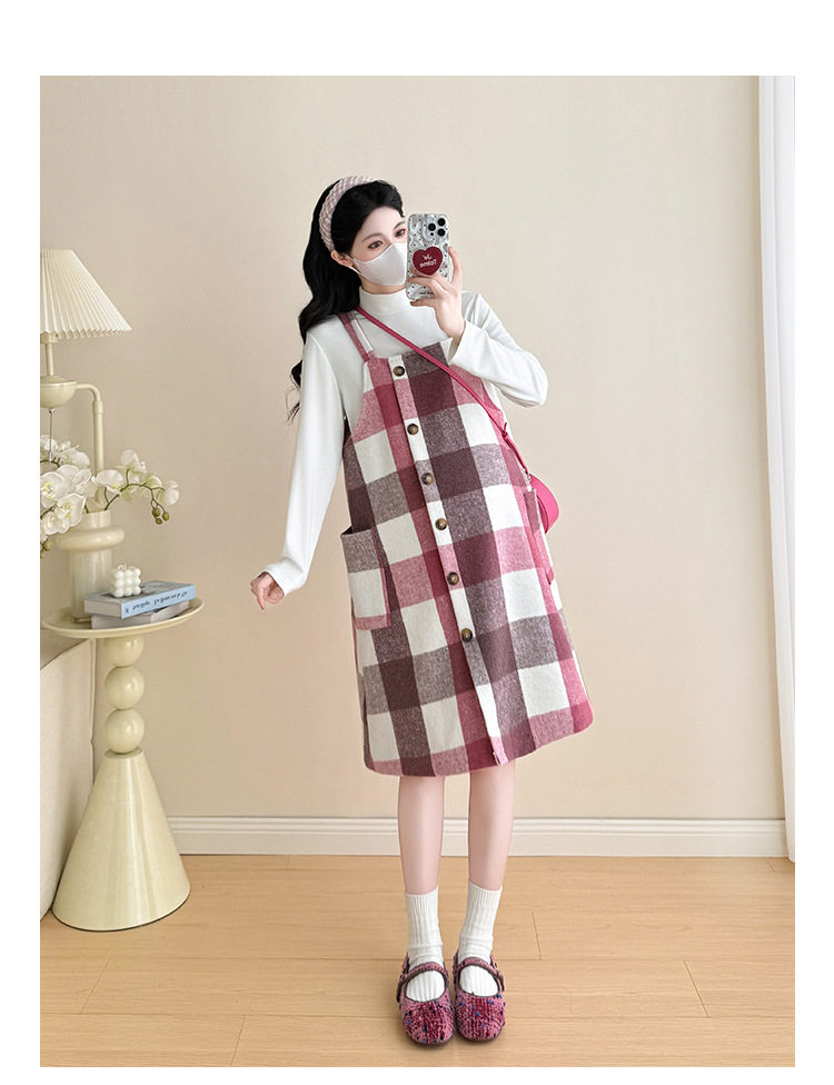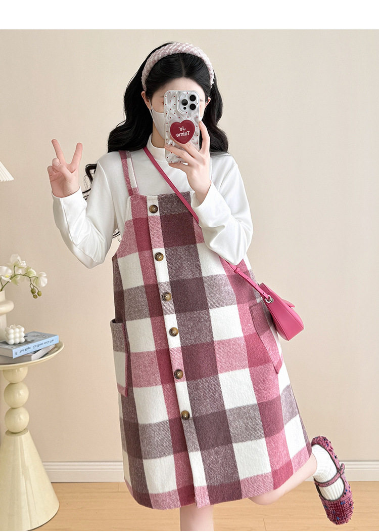 2025 New Autumn and Winter Thickened Comfortable Belly-Covering Suspender Dress, Versatile and Slimming Plaid Maternity Suit Dress for Commuting