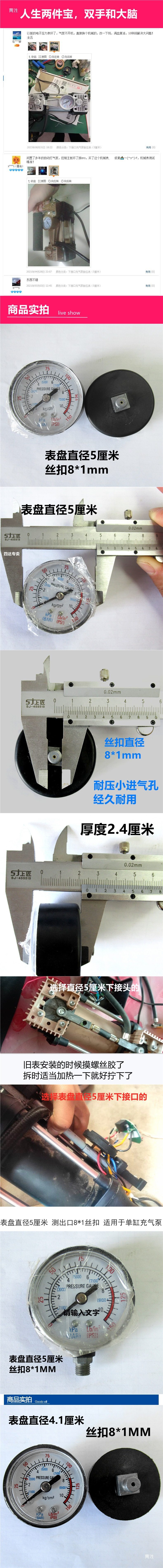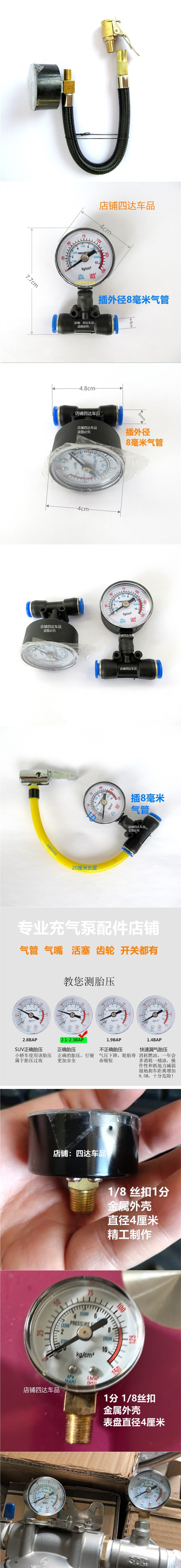 | Specifications | Lower interface air pump tire pressure gauge (5cm),Side interface air pump tire pressure gauge (5cm),Lower interface air pump tire pressure gauge (4cm),Side interface air pump tire pressure gauge (4cm),Direct plug-in air pump tire pressure gauge (4cm) plug in,Tire shop tire pressure gun gas meter,5cm tire pressure strap tee,Direct plug-in dial diameter 5cm tire pressure gauge lower plug-in,Diameter 5cm tire pressure gauge with screw hole inserted downwards,Side-mounted air pump tire pressure gauge (4cm),4cm with tube 6*1 thread buckle,Metal threaded tape meter conversion tube,Snap metal thread 2 valve with meter conversion tube,Quick clamp metal thread 2 valve with meter conversion tube,Radial 1 minute 1/8 diameter 4cm metal watch,Axial 1 minute 1/8 diameter 4cm metal watch,Radial tire pressure gauge inserted into 8mm air tube,Axial tire pressure gauge inserted into 8mm air tube,Radial tire pressure gauge inserted into 8mm air tube with air nozzle |