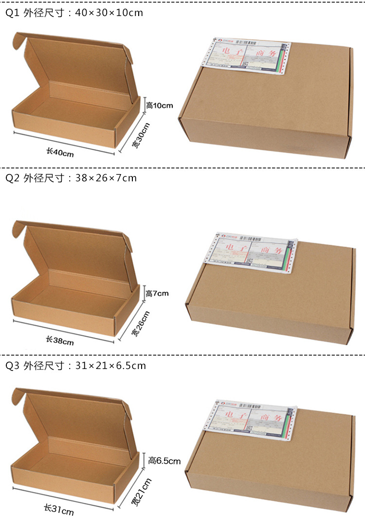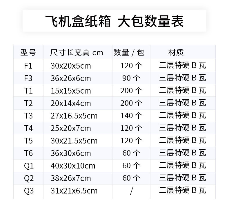 | Specifications and models | Wholesale of airplane boxes in whole packages; f1: 30*20*5 (120/pack),Wholesale of airplane boxes in whole packages; f3: 36*26*6 (90/pack),Wholesale of airplane boxes in whole packages; t1: 15*15*5 (200/pack),Wholesale of airplane boxes in whole packages; t2: 20*14*4 (200/pack),Wholesale of airplane boxes in whole packages; t3: 27*16.5*5 (140/pack),Wholesale of airplane boxes in whole packages; t4: 25*20*7 (120/pack),Wholesale of airplane boxes in whole packages; t5: 30*21.5*5 (120/pack),Wholesale of airplane boxes in whole packages; t6: 36*30*6 (60/pack),Wholesale of airplane boxes in whole packages; q1: 40*30*10 (60/pack),Wholesale of airplane boxes in whole packages; q2: 38*26*7 (60/pack),Wholesale of airplane boxes in whole packages; q3: 31*21*6.5,Three-layer extra hard retail; f1: 30*20*5 (120/pack),Three-layer extra-hard retail packaging; f3: 36*26*6 (90/pack),Three-layer extra hard retail; t1: 15*15*5 (200/pack),Three-layer extra-hard retail packaging; t2: 20*14*4 (200/pack),Three-layer extra-hard retail packaging; t3: 27*16.5*5 cm (140/pack),Three-layer extra-hard retail packaging; t4: 25*20*7 (120/pack),Three-layer extra-hard retail packaging; t5: 30*21.5*5 (120/pack),Three-layer extra-hard retail packaging; t6: 36*30*6 (60/pack),Three-layer extra-hard retail packaging; q1: 40*30*10 (60/pack),Three-layer extra-hard retail packaging; q2: 38*26*7 (60/pack),Three-layer extra-hard retail packaging; q3: 31*21*6.5 cm |