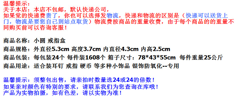 Specification model Silver color * diameter 5.3cm height 3.6cm small round ring box,Maroon red * diameter 5.3cm height 3.6cm small round ring box,Pink* diameter 5.3cm height 3.6cm small round ring box,Golden color * diameter 5.3cm, height 3.6cm, small round ring box,Bronze * diameter 5.3cm height 3.6cm small round ring box,Light blue* diameter 5.3cm height 3.6cm small round ring box,Big red * diameter 5.3cm height 3.6cm small round ring box,Brown * diameter 5.3cm, height 3.6cm, small round ring box,Golden yellow * diameter 5.3cm height 3.6cm small round ring box,Dark purple * diameter 5.3cm height 3.6cm small round ring box