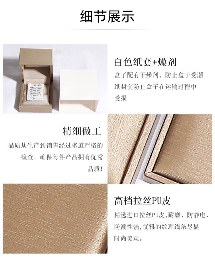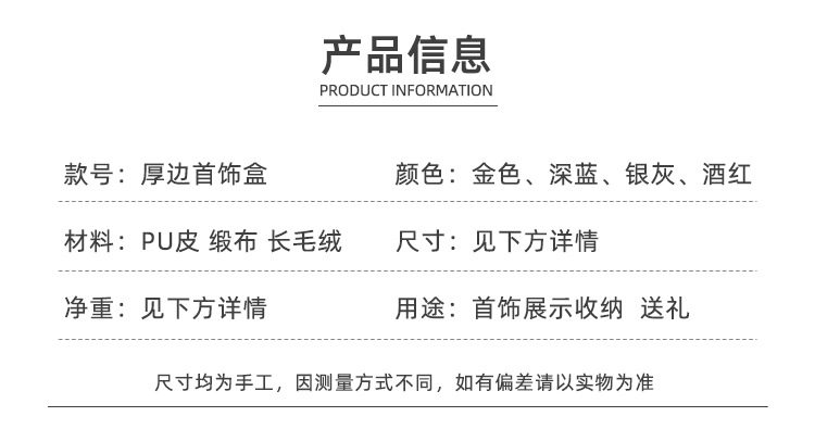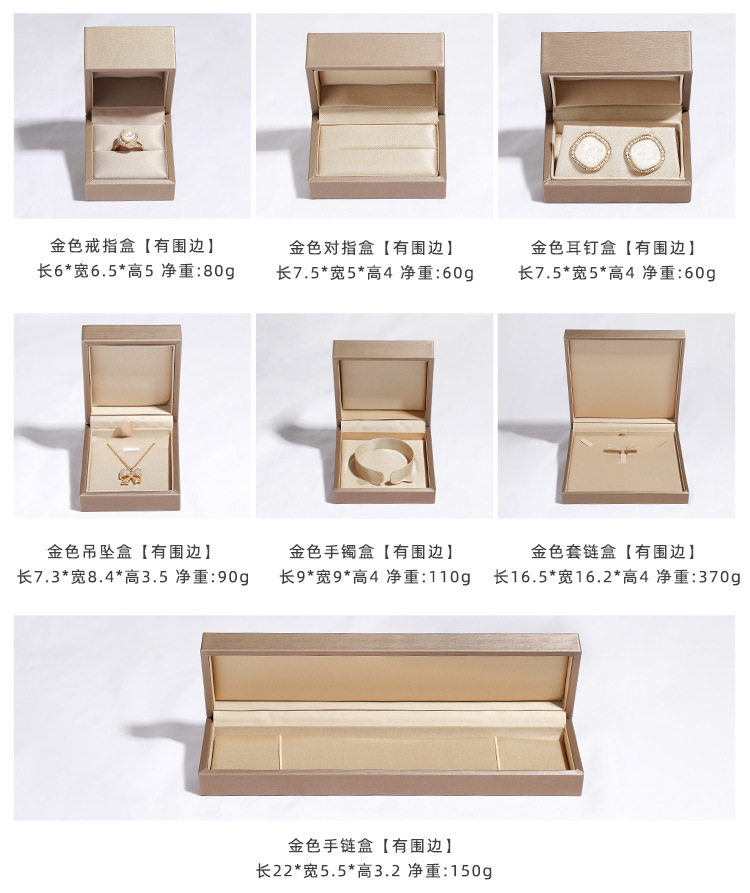 | Specifications and models | Royal blue (inner flannel); single ring box,Royal blue (flannel inside); ring box,Royal blue (flannel); earring box,Royal blue (flannel inside); pendant box,Royal blue (flannel inside); bracelet box,Royal blue (flannel); Bracelet box,Royal blue (flannel inside); set box,Silver gray (inner flannel); single ring box,Silver gray (flannel); pendant box,Silver gray (flannel); bracelet box,Silver gray (flannel); Bracelet box,Gold (inner flannel); single ring box,Gold (flannel); locket,Gold (flannel); bracelet box,Gold (flannel); Bracelet box,Jujube (inner flannel); single ring box,Jujube (inner flannel); pair box,Jujube (inner flannel); earnail box,Jujube (inner flannel); pendant box,Jujube (flannel); bracelet box,Jujube (flannel); Bracelet box,Black (inner flannel); single ring box,Black (flannel inside); locket,Black (flannel inside); bracelet box,Black (inner flannel); Bracelet box,Gold (inner satin); single ring box,Gold (inner satin); ring box,Gold (inner satin cloth); earring box,Gold (satin inside); locket,Gold (inside satin); bracelet case,Gold (inside satin); Bracelet box,Gold (inside satin); set box |