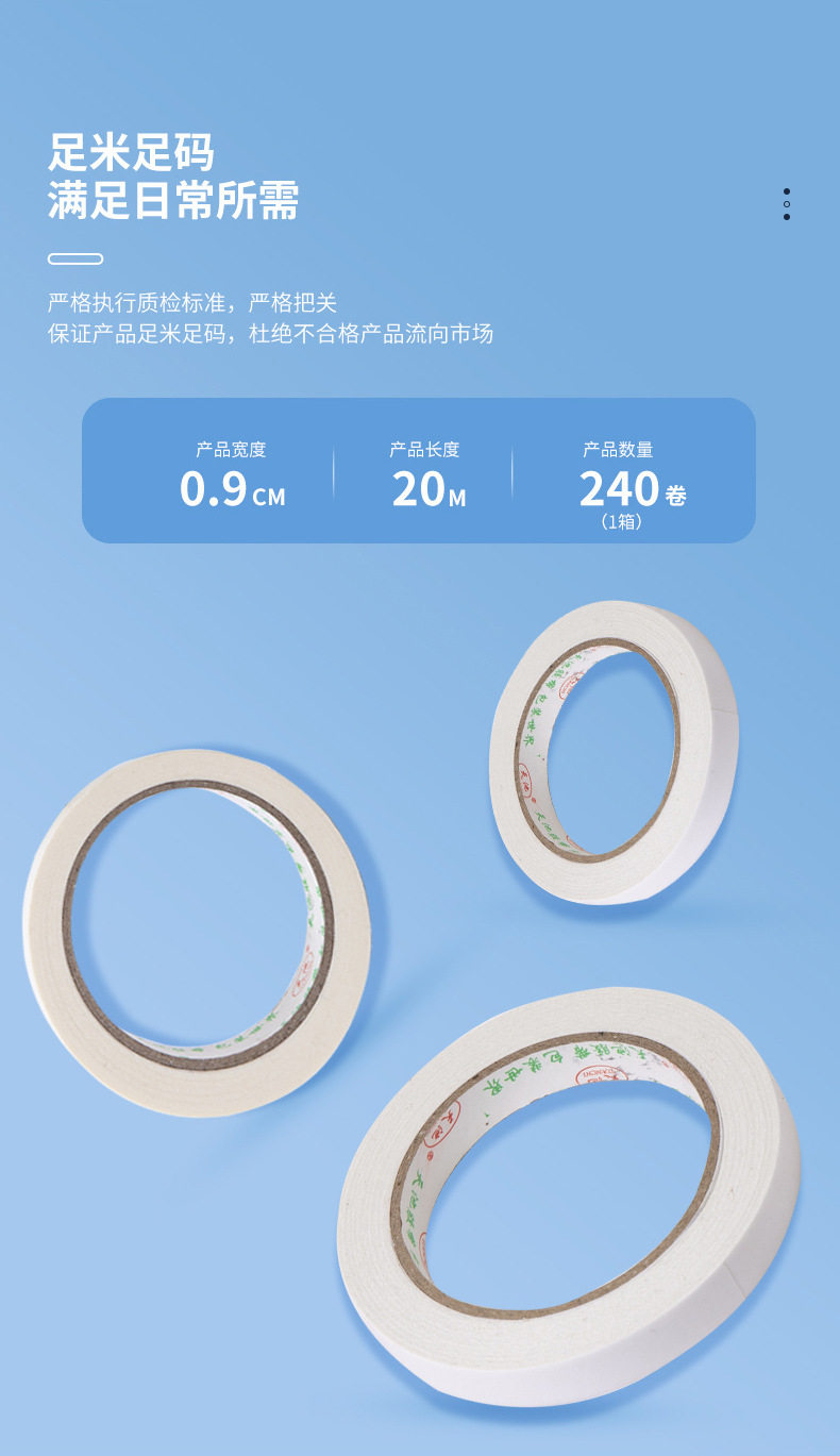 | Specifications and models | Double-sided tape 3mm* 20m 528 rolls per box,Double-sided tape 4mm* 20m 400 rolls per box,Double-sided tape 8mm* 20m 200 rolls per box,Double-sided tape 1cm* 20m 160 rolls per box,Double-sided tape 1.2cm* 20m 136 rolls per box,Double-sided tape 2cm* 20m 80 rolls per box,Double-sided tape 3cm* 20m 56 rolls per box,Double-sided tape customized width and meters contact customer service,Double-sided tape 5mm* 20.1m boxes 320 rolls,Double-sided tape 1.5cm* 20m 112 rolls per box,Paper tape can be customized as desired |