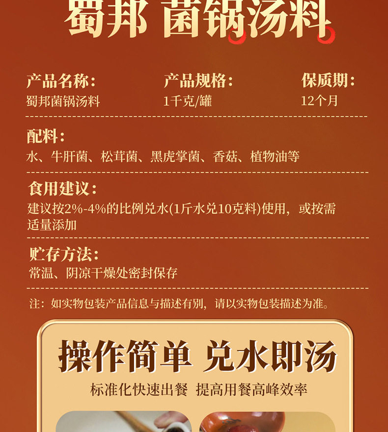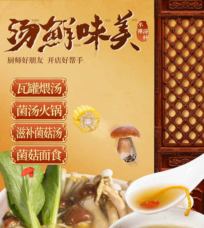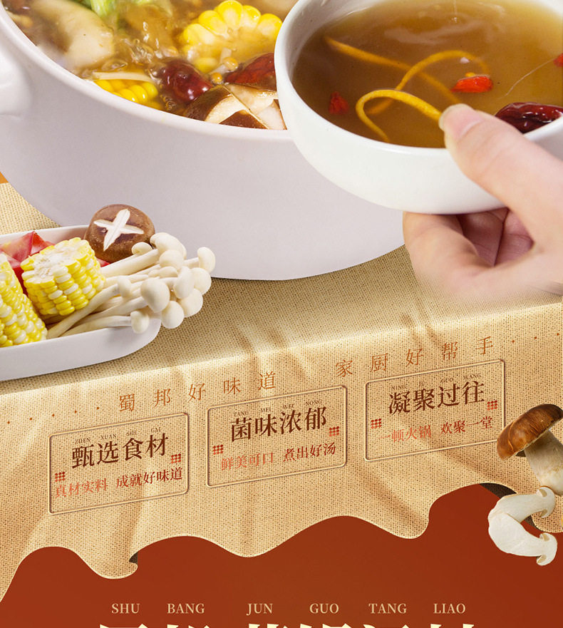 | Raw materials and ingredients | Boletus, pine mushroom, Black Tiger Palm mushroom, Mushroom mushroom, water, edible salt |
