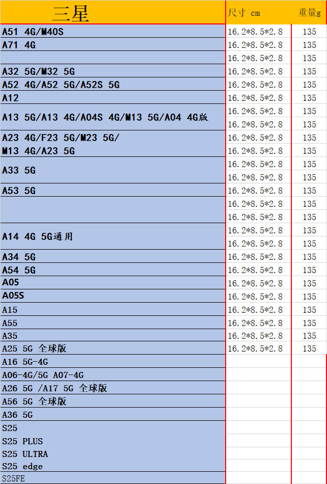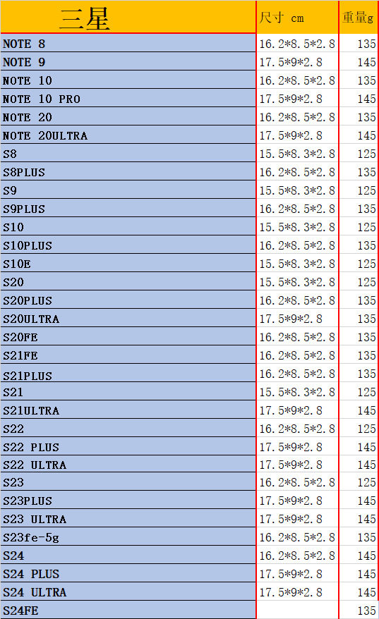 | Applicable models | Samsung s25,Samsung s25plus,Samsung s25 ultra,Samsung s25 edge,Samsung s25fe,Samsung s24,Samsung s24plus,Samsung s24 ultra,Samsung s24 fe,Samsung s23,Samsung s23plus,Samsung s23 ultra,Samsung s23 fe,Samsung a56 5g,Samsung a36 5g,Samsung a26 5g /a17 5g global version,Samsung a16 5g/4g,Samsung a06 4g,Samsung a55,Samsung a35,Samsung a25 5g global version,Samsung a15,Samsung a05s,Samsung a05,Samsung a54 5g,Samsung a34 5g,Samsung a14 4g/5g,Samsung a53 5g,Samsung a33 5g,Samsung note20,Samsung note20 ultra,Samsung note10,Samsung note 10pro,For other models, please refer to the model table for ordering notes |