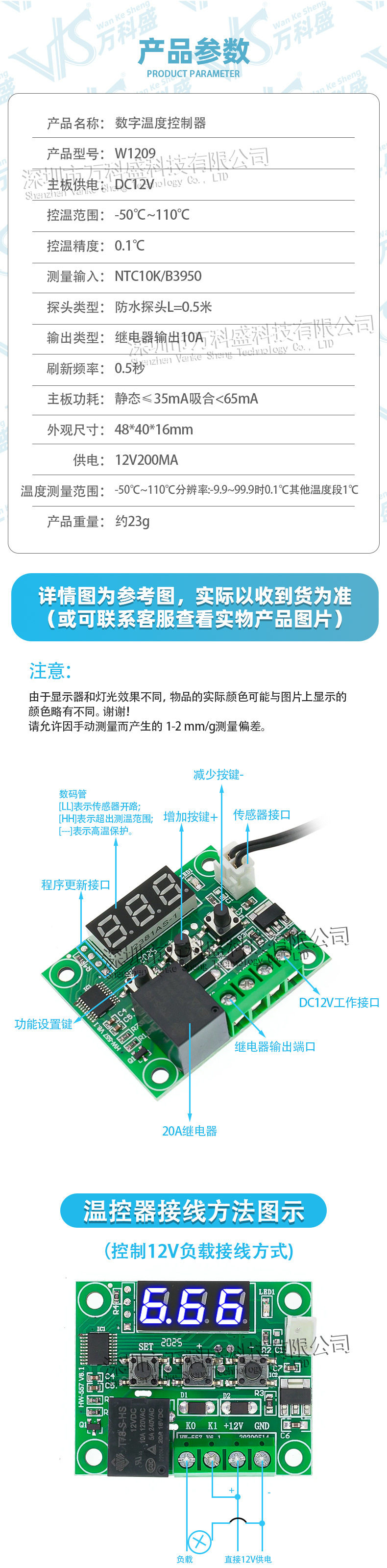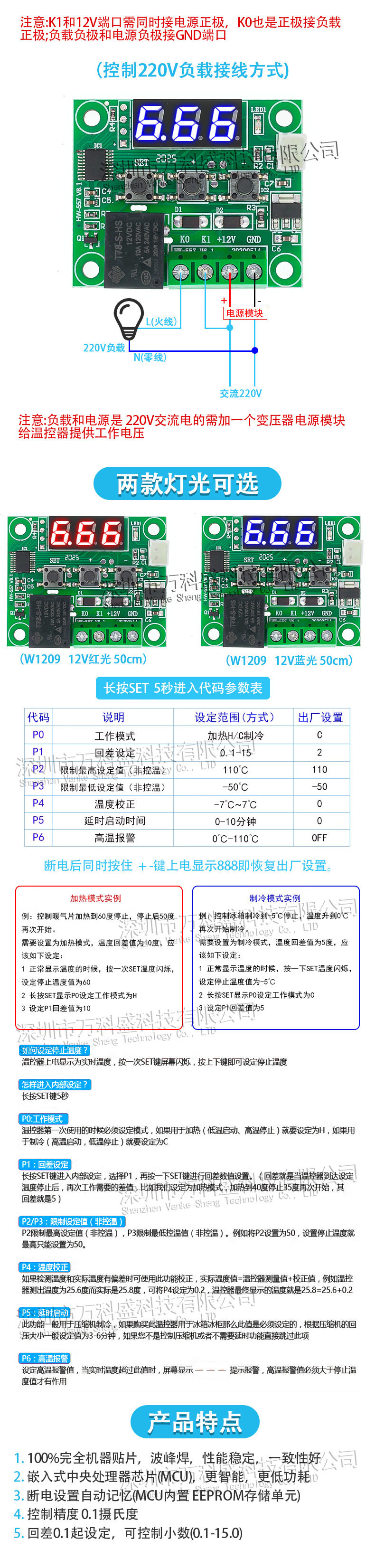 | Specifications and models | W1209 12v blu-ray 50cm,W1209 12v red light 50cm,1209 shell,W1209 220v red |
