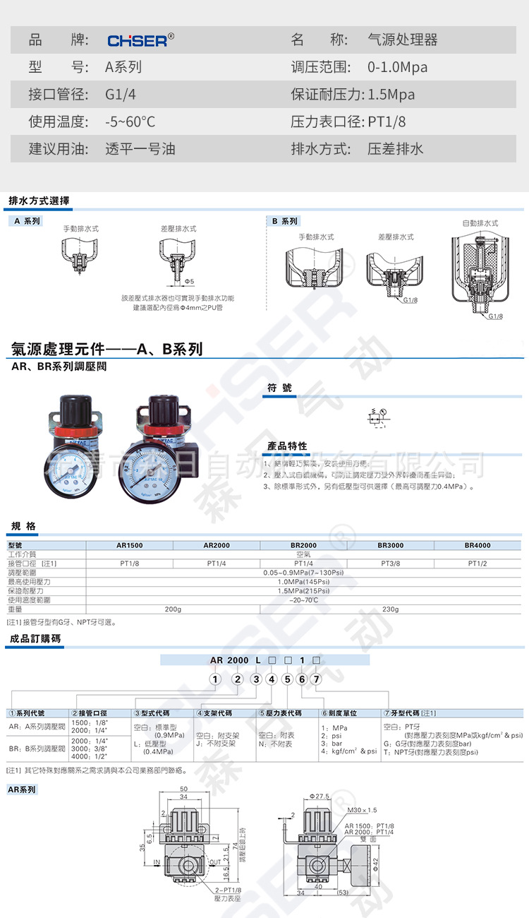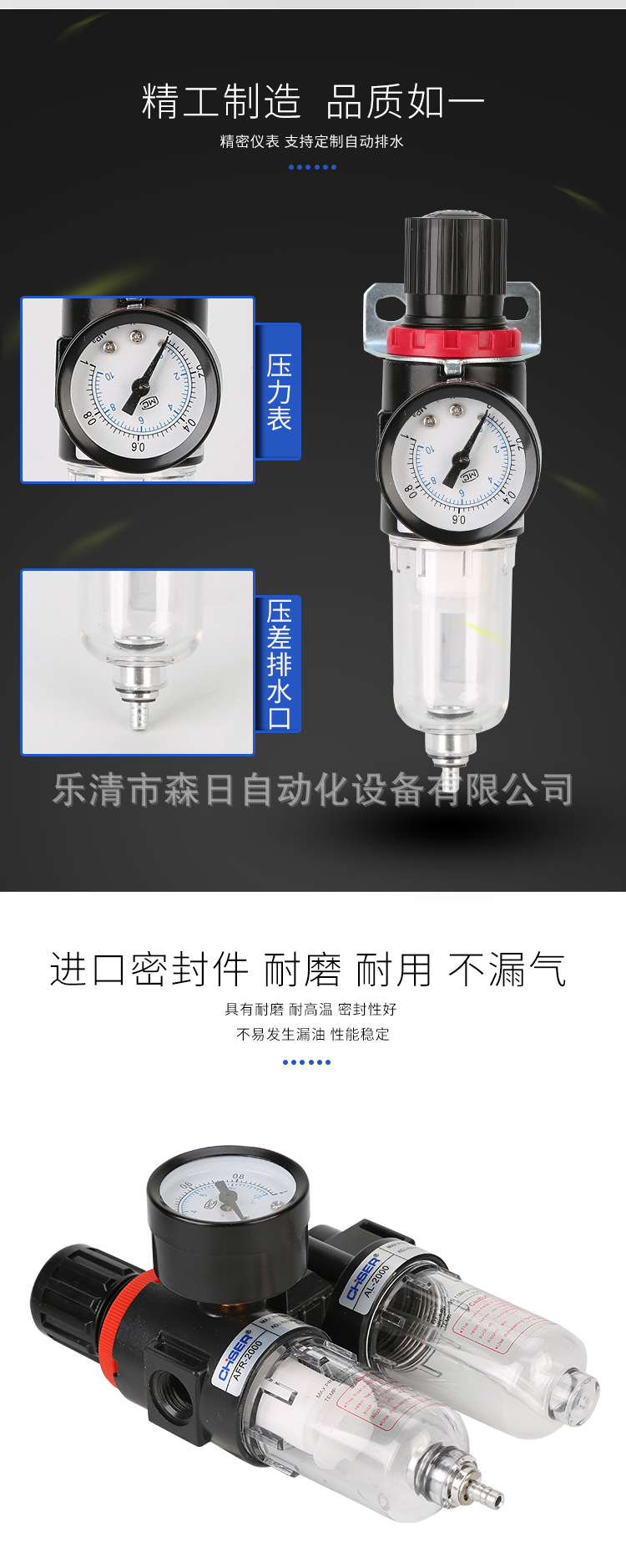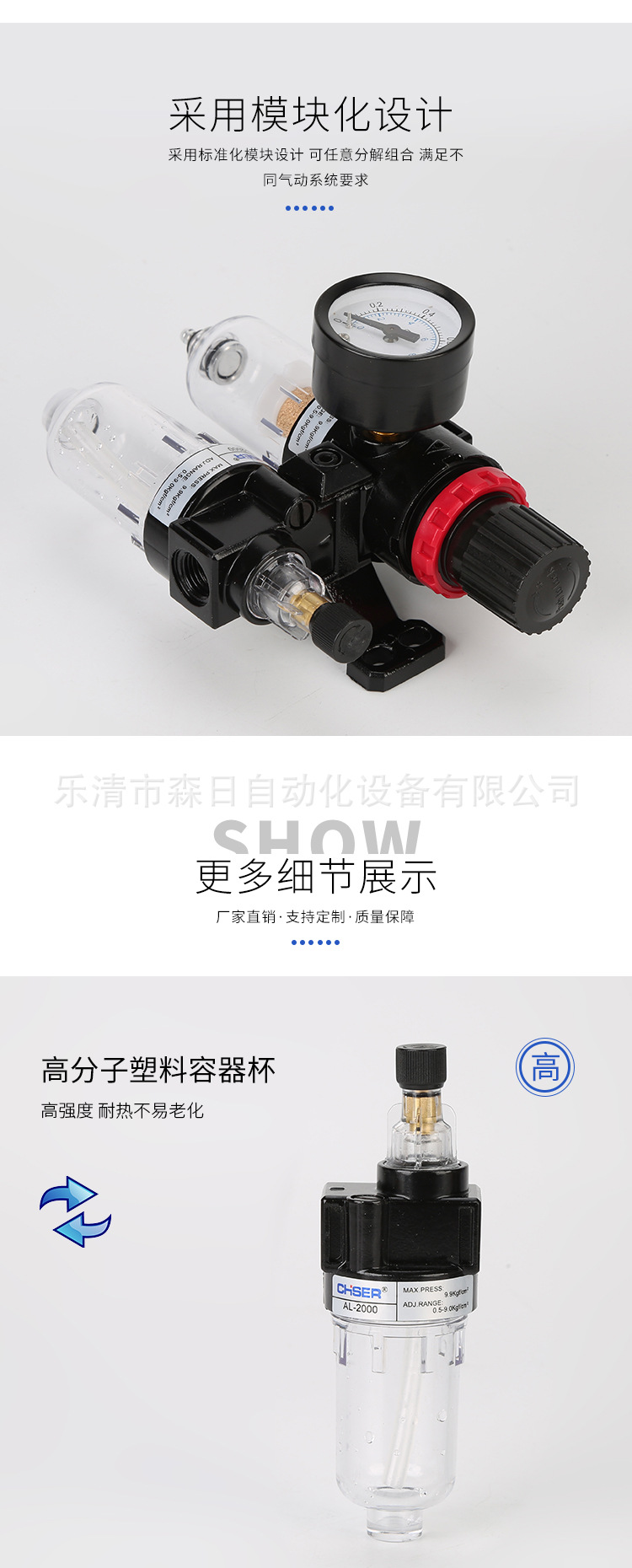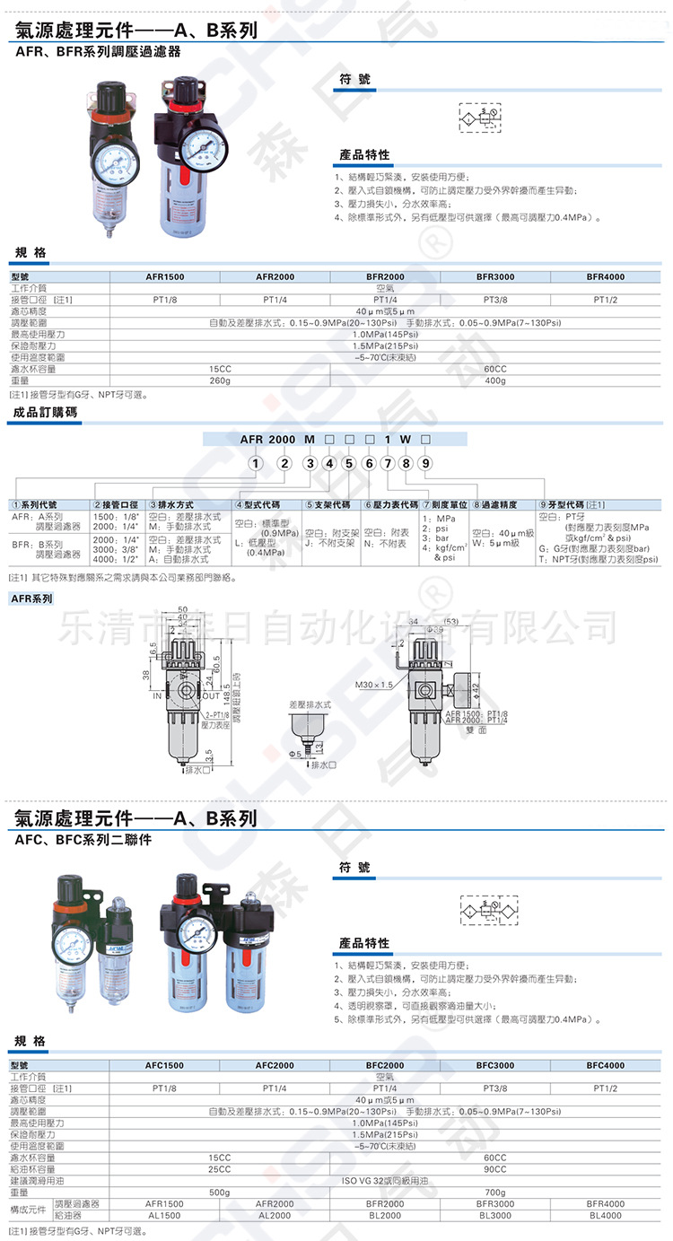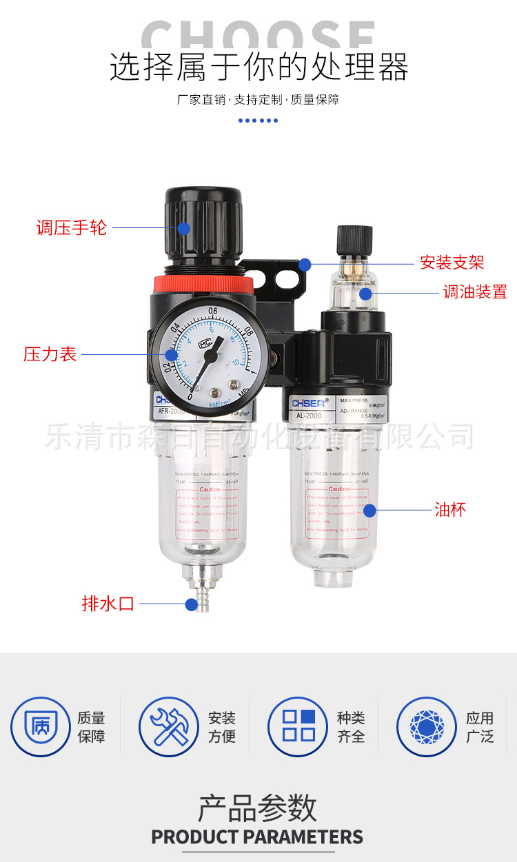 | Product Specifications | Special price of two-piece AFC2000 fiber filter element,Special price of two-piece AFC2000 copper filter element,Two-piece AFC2000 fiber filter element,Two-piece AFC2000 copper core,Two-piece AFC2000 copper core (new piston type),AFC2000 copper core SM20 PM20,AFC2000 fiber core SM20 PM20,Triple AC2000,Pressure regulating filter AFR2000 fiber filter element,Pressure regulating filter AFR2000 copper core,Pressure regulating valve AR2000,Oil mist device AL2000,Filter AF2000,Individual pressure gauge |