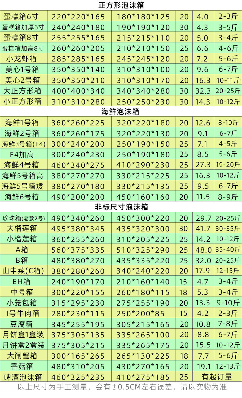 | Specification model | Foam; beer 6 can box 23*17*20,Foam; 2 boxes of mooncakes 37*30.5*15.5,Foam; EH24*19*17,Foam; SF5 No. 28.5*23.5*23,Foam; Post No. 4 34*22*18,Foam; box No. 3 42*27*20,Foam; No. 4 heightened by 34*22*22.5,Foam; No. 5 28*16*18,Foam; box No. 6 25.5*14.5*18,Foam; No. 10 17.5*11*9,Foam; standard box No. 8 20.5*10.5*13.5,Foam; non-standard No. 8 23*16*13,Foam; No. 7 22.5*12.5*16,Foam; high No. 5 28*16*26,Foam; No. 5 28*16.5*22,Foam; large size 5 box 29*19*20,Foam; large size 4 box 35*23*19,Foam; Small No. 4 32*22*20,Foam; large box No. 3 43*31*20,Foam; No. 2 height 45*33.5*29,Foam; mark No. 2 45*33.5*22,Foam; pearl box 49*34*26,Foam; box A 56*37*33.5,Foam; B box 47*37*27,Foam; box No. 1 60*45*34,Foam; thickened no. 1 60*45*34,Foam; large durian box 49.5*38*34.5,Foam; small durian box 36*25.5*26,Foam; small cage box 31.5*29.5*23,Foam; medium box 30*22*15.5,Foam; Seafood No. 1 box 36*26*22.5,Foam; Seafood No. 2 box 36*26*17.5,Foam; Seafood No. 4 46*34*27,Foam; Seafood No. 5 height 39*27*26,Foam; Seafood No. 5 short 39*27*18,Foam; No. 1 beef box 28*23*11.5,Foam; thickened 42*36*28,Foam; thickened 52*37*31,Foam; C box 38*28*26,Foam; mushroom box 47*31*20,Foam; barrier crab 30*16.5*26.5,Foam; crayfish box 28.5*28.5*16.5,Foam + carton; 2 boxes of mooncakes 37*30.5*15.5,Foam + carton; EH24*19*17,Foam + carton; SF5 No. 28.5*23.5*23,Foam + carton; No. 3 box 42*27*20,Foam + carton; No. 5 28*16*18,Foam + carton; No. 6 box 25.5*14.5*18,Foam + carton; No. 10 17.5*11*9,Foam + carton; non-standard No. 8 23*16*13,Foam + carton; No. 7 22.5*12.5*16,Foam + carton; large No. 5 box 29*19*20,Foam + carton; large No. 4 box 35*23*19,Foam + carton; small size 4 32*22*20,Foam + carton; large No. 3 box 43*31*20,Foam + carton; No. 2 height 45*33.5*29,Foam + carton; pearl carton box 49*34*26,Foam + carton; A box 56*37*33.5,Foam + carton; B box 47*37*27,Foam + carton; No. 1 box 60*45*34,Foam + carton; thickened no. 1 60*45*34,Foam + carton; medium box 30*22*15.5,Foam + carton; Seafood No. 1 box 36*26*22.5,Foam + carton; Seafood No. 4 46*34*27,Foam + carton; No. 1 beef box 28*23*11.5,Foam + carton; thickeneded 42*36*28,Foam + carton; thickened 52*37*31,Foam + carton; C box 38*28*26,Foam + carton; mushroom box 47*31*20,Foam + carton; barrier crab 30*16.5*26.5 |