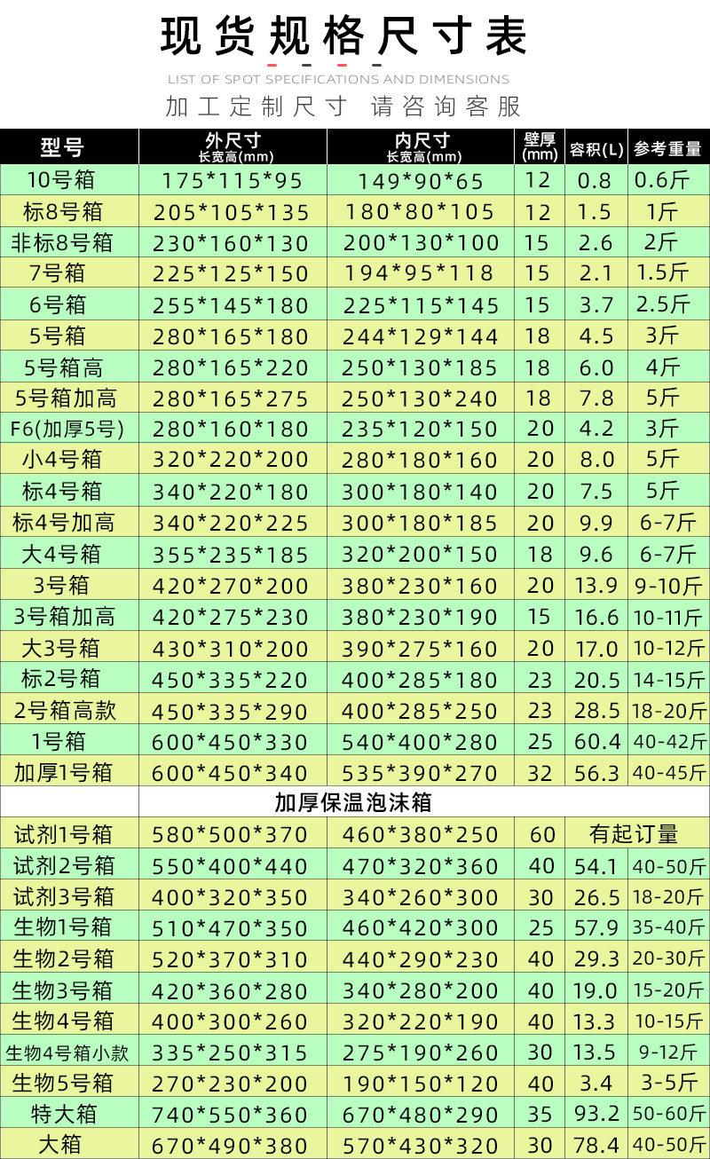 | Specification model | Foam; beer 6 can box 23*17*20,Foam; 2 boxes of mooncakes 37*30.5*15.5,Foam; EH24*19*17,Foam; SF5 No. 28.5*23.5*23,Foam; Post No. 4 34*22*18,Foam; box No. 3 42*27*20,Foam; No. 4 heightened by 34*22*22.5,Foam; No. 5 28*16*18,Foam; box No. 6 25.5*14.5*18,Foam; No. 10 17.5*11*9,Foam; standard box No. 8 20.5*10.5*13.5,Foam; non-standard No. 8 23*16*13,Foam; No. 7 22.5*12.5*16,Foam; high No. 5 28*16*26,Foam; No. 5 28*16.5*22,Foam; large size 5 box 29*19*20,Foam; large size 4 box 35*23*19,Foam; Small No. 4 32*22*20,Foam; large box No. 3 43*31*20,Foam; No. 2 height 45*33.5*29,Foam; mark No. 2 45*33.5*22,Foam; pearl box 49*34*26,Foam; box A 56*37*33.5,Foam; B box 47*37*27,Foam; box No. 1 60*45*34,Foam; thickened no. 1 60*45*34,Foam; large durian box 49.5*38*34.5,Foam; small durian box 36*25.5*26,Foam; small cage box 31.5*29.5*23,Foam; medium box 30*22*15.5,Foam; Seafood No. 1 box 36*26*22.5,Foam; Seafood No. 2 box 36*26*17.5,Foam; Seafood No. 4 46*34*27,Foam; Seafood No. 5 height 39*27*26,Foam; Seafood No. 5 short 39*27*18,Foam; No. 1 beef box 28*23*11.5,Foam; thickened 42*36*28,Foam; thickened 52*37*31,Foam; C box 38*28*26,Foam; mushroom box 47*31*20,Foam; barrier crab 30*16.5*26.5,Foam; crayfish box 28.5*28.5*16.5,Foam + carton; 2 boxes of mooncakes 37*30.5*15.5,Foam + carton; EH24*19*17,Foam + carton; SF5 No. 28.5*23.5*23,Foam + carton; No. 3 box 42*27*20,Foam + carton; No. 5 28*16*18,Foam + carton; No. 6 box 25.5*14.5*18,Foam + carton; No. 10 17.5*11*9,Foam + carton; non-standard No. 8 23*16*13,Foam + carton; No. 7 22.5*12.5*16,Foam + carton; large No. 5 box 29*19*20,Foam + carton; large No. 4 box 35*23*19,Foam + carton; small size 4 32*22*20,Foam + carton; large No. 3 box 43*31*20,Foam + carton; No. 2 height 45*33.5*29,Foam + carton; pearl carton box 49*34*26,Foam + carton; A box 56*37*33.5,Foam + carton; B box 47*37*27,Foam + carton; No. 1 box 60*45*34,Foam + carton; thickened no. 1 60*45*34,Foam + carton; medium box 30*22*15.5,Foam + carton; Seafood No. 1 box 36*26*22.5,Foam + carton; Seafood No. 4 46*34*27,Foam + carton; No. 1 beef box 28*23*11.5,Foam + carton; thickeneded 42*36*28,Foam + carton; thickened 52*37*31,Foam + carton; C box 38*28*26,Foam + carton; mushroom box 47*31*20,Foam + carton; barrier crab 30*16.5*26.5 |