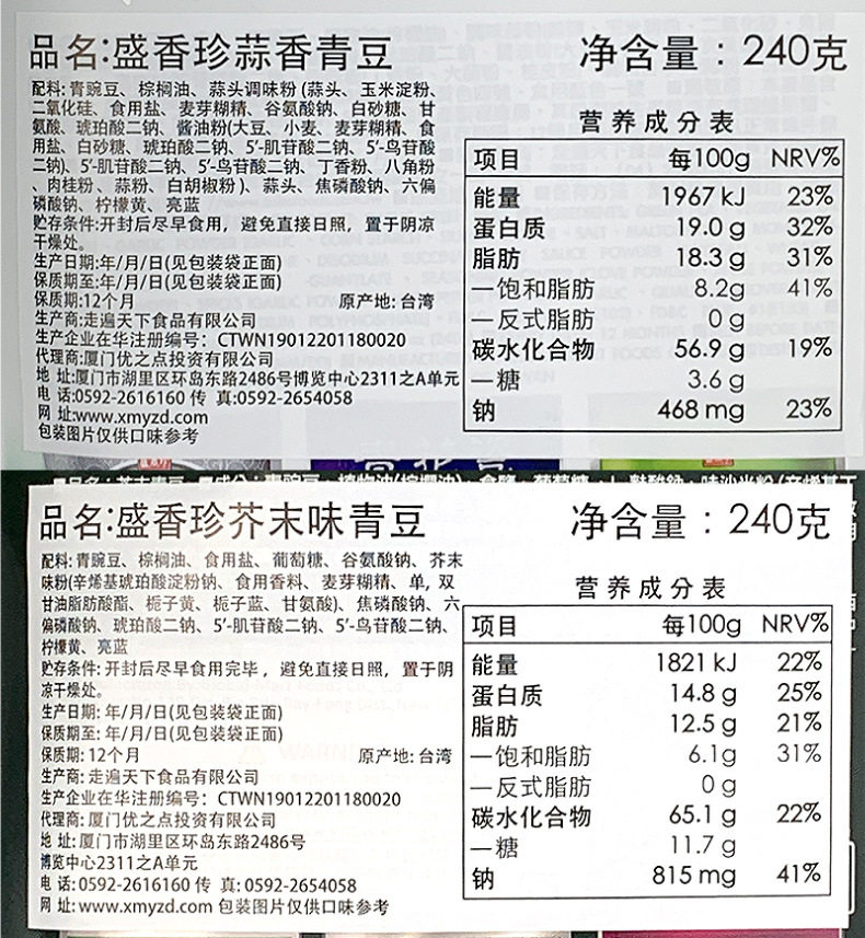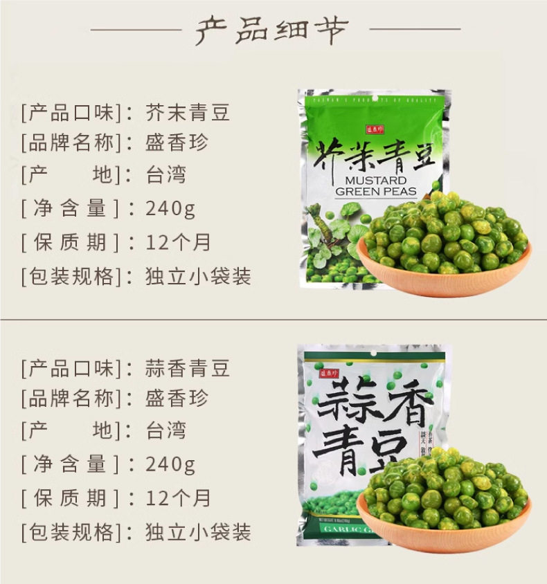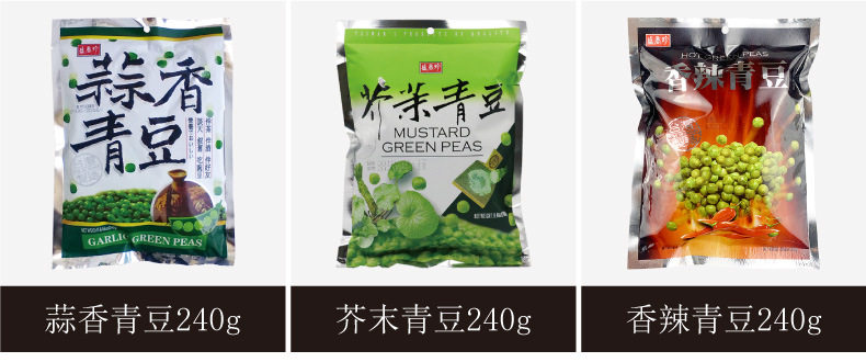 | Packaging specifications | Taiwan shengxiang zhen garlic green beans bag 240g,Taiwan shengxiang zhen wasabi green bean bag 240g,Taiwan shengxiang zhen spicy green bean bag 240g,For product dates, see the description on the content page |