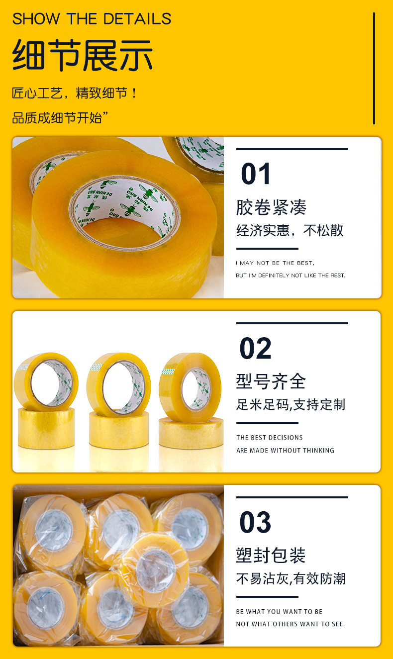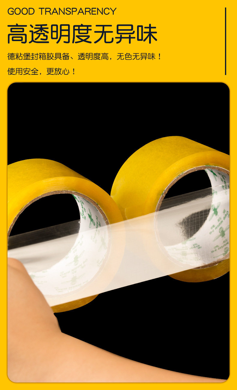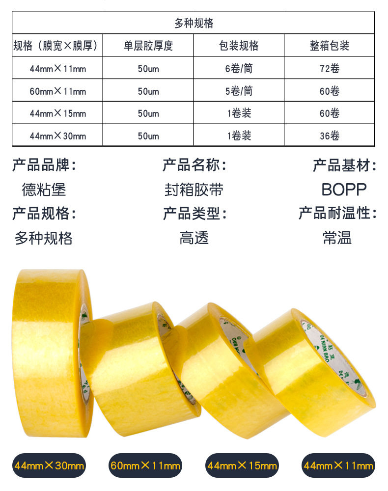 | Specification model | Transparent 44mm*70 yards; delibao sealing glue; 60,Transparent 44mm*100 yards; delibao sealing glue; 60,Transparent 44mm*full 250 yards; delibao sealing glue; 60,Transparent 60mm*full 100 yards; delibao sealing glue; 60 |