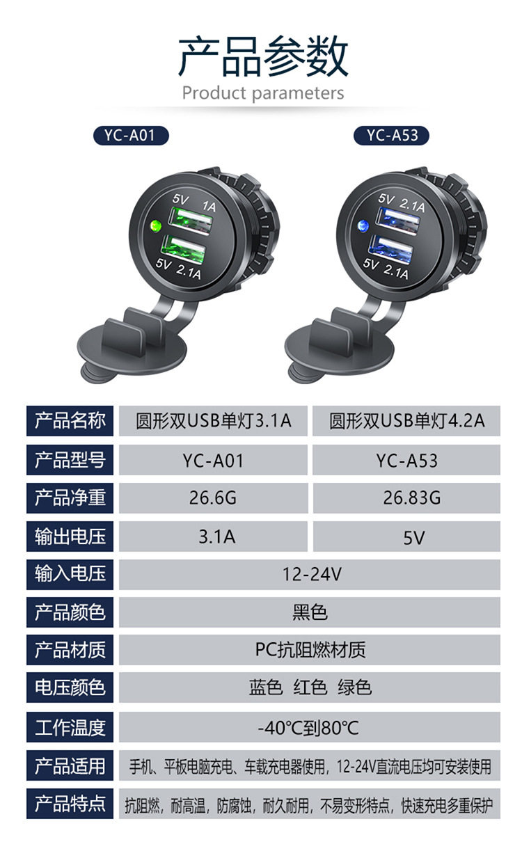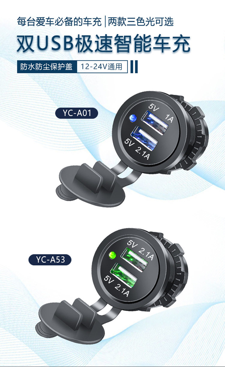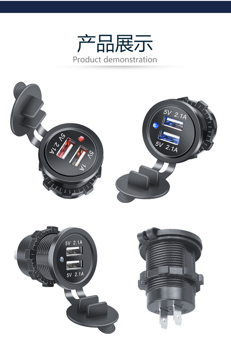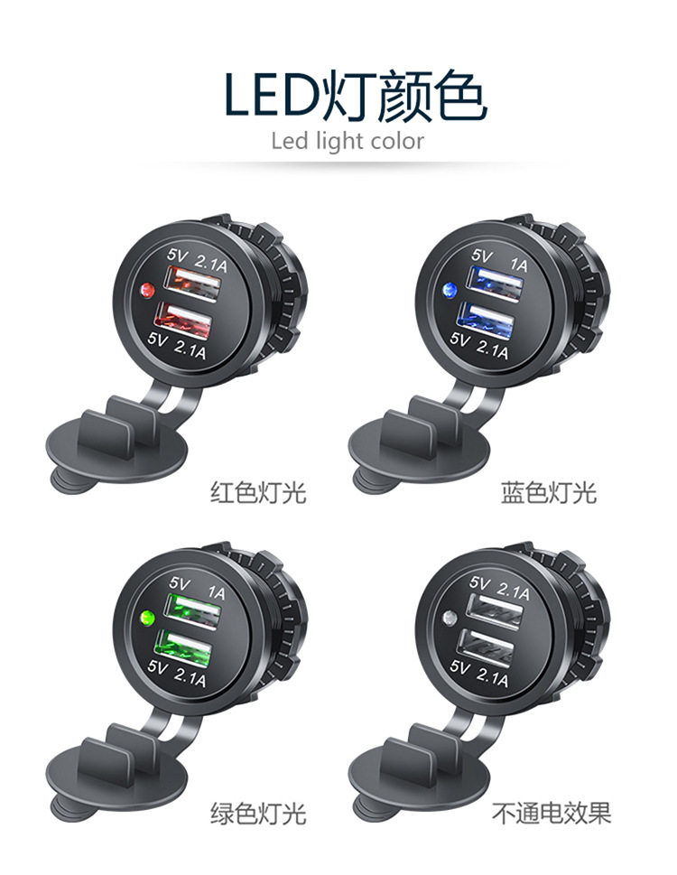 | Model | Dual usb blue indicator light 3.1a,Dual usb red indicator light 3.1a,Dual usb green indicator light 3.1a,Dual usb blue indicator light 4.2a,Dual usb red indicator light 4.2a,Dual usb green indicator light 4.2a |