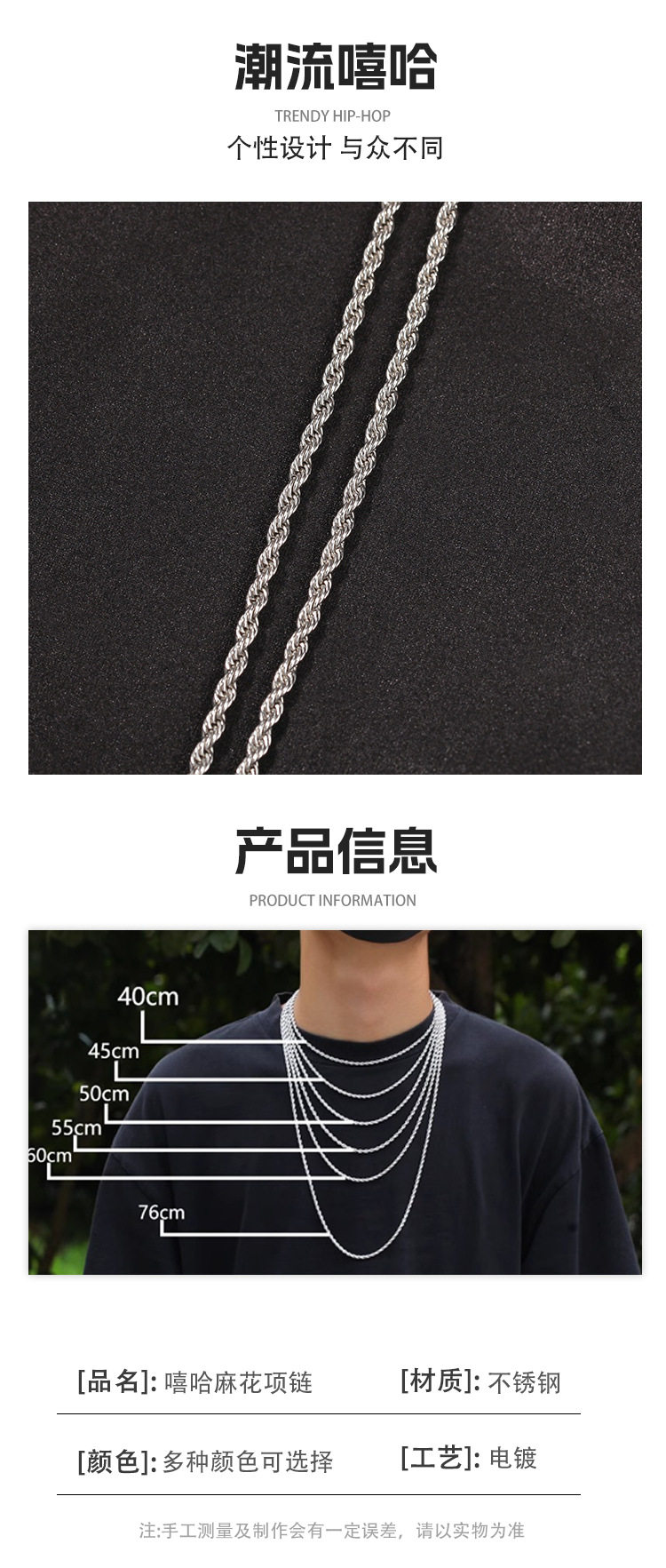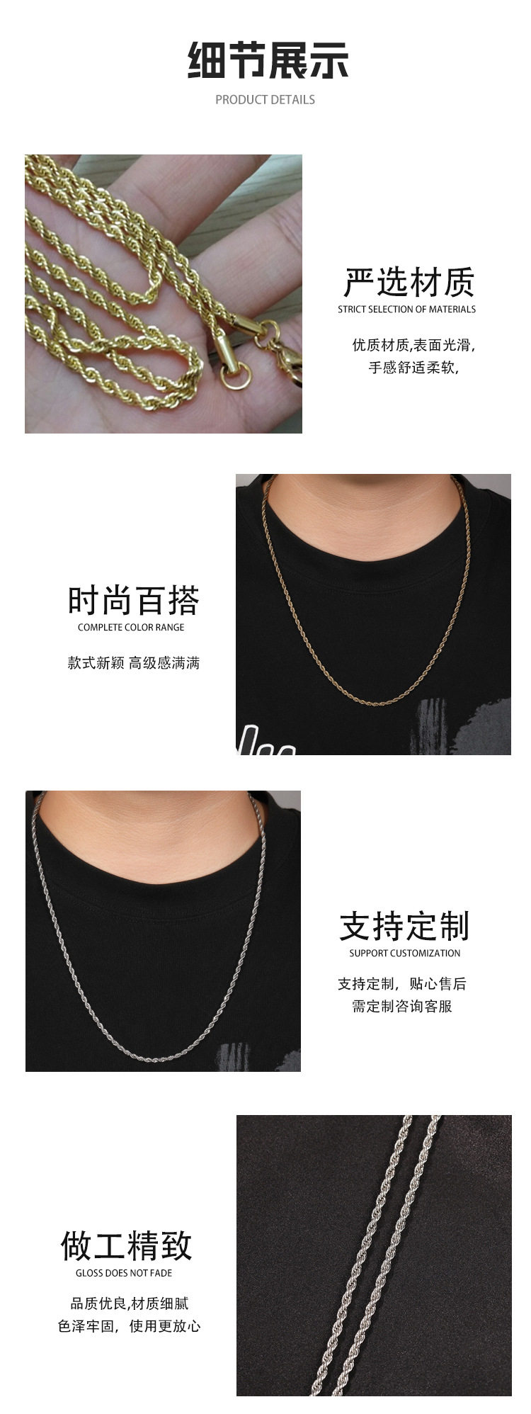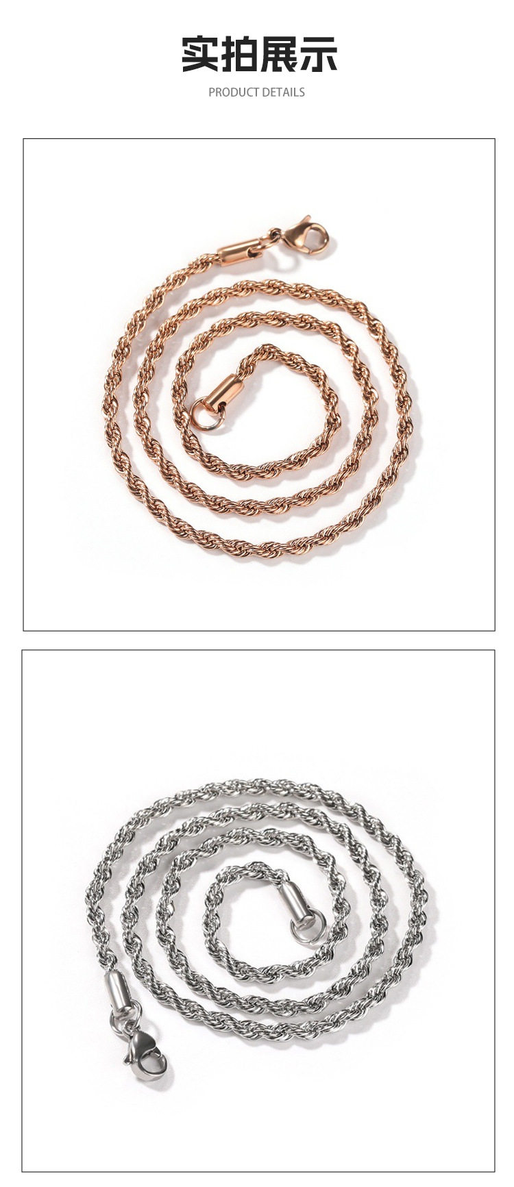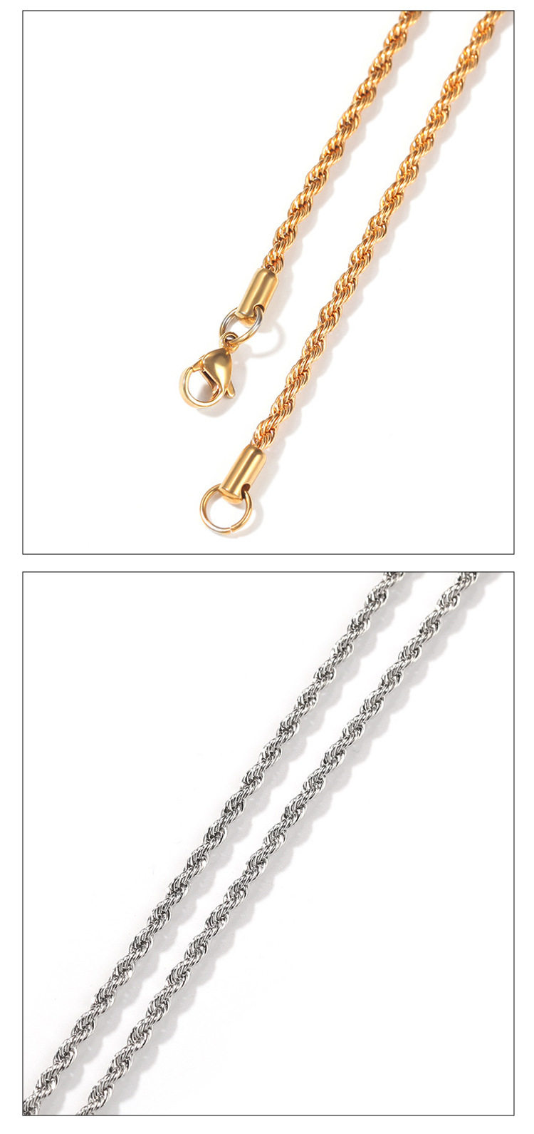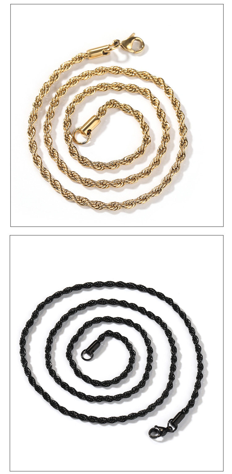 | Color | Gold 2mm twist chain,Gold 3mm twist chain,Gold 4mm twist chain,Gold 5mm twist chain,Gold 6mm twist chain,Steel color 2mm twist chain,Steel color 3mm twist chain,Steel color 4mm twist chain,Steel color 5mm twist chain,Steel color 6mm twist chain,Black 2mm twist chain,Black 3mm twist chain,Black 4mm twist chain,Black 5mm twist chain,Black 6mm twist chain,Rose gold 2mm twist chain,Rose gold 3mm twist chain,Rose gold 4mm twist chain,Rose Gold 5mm Twist Chain,Rose gold 6mm twist chain |