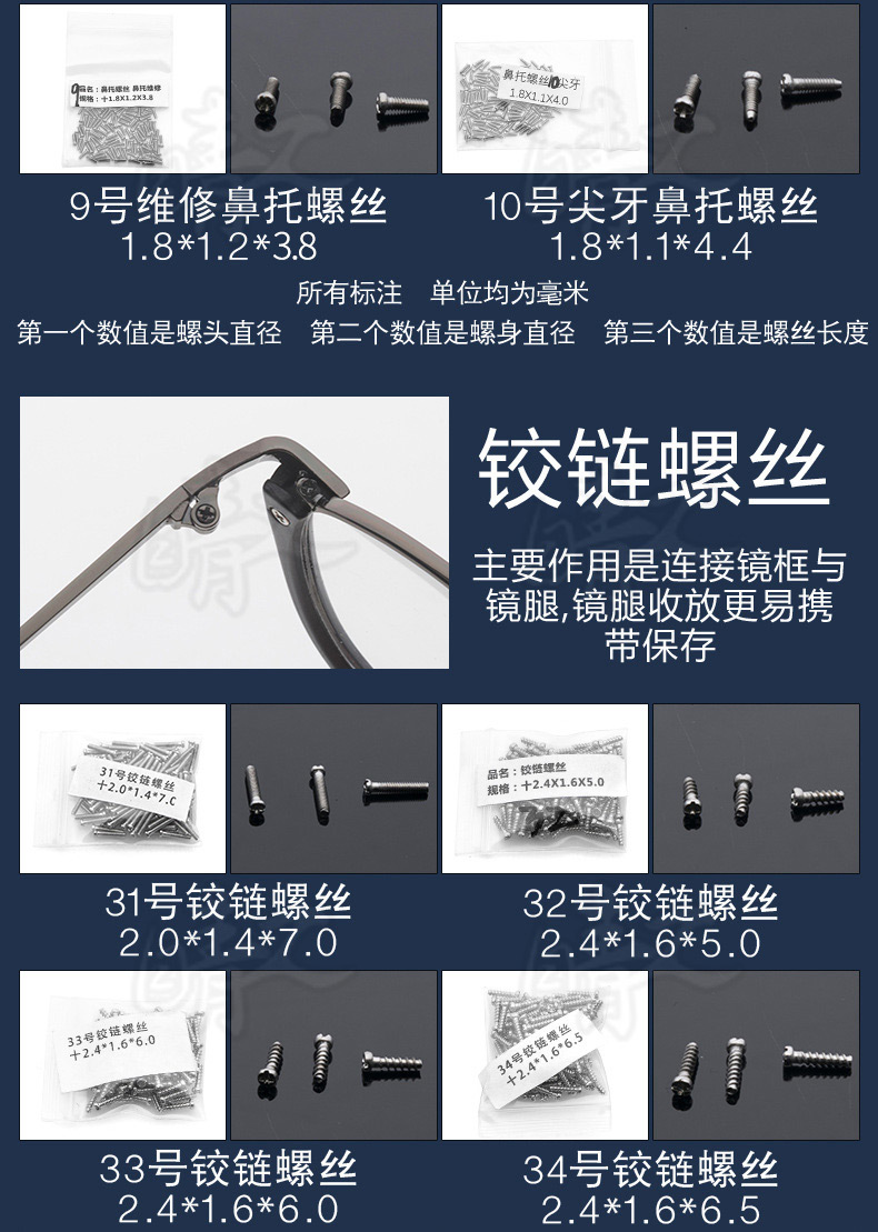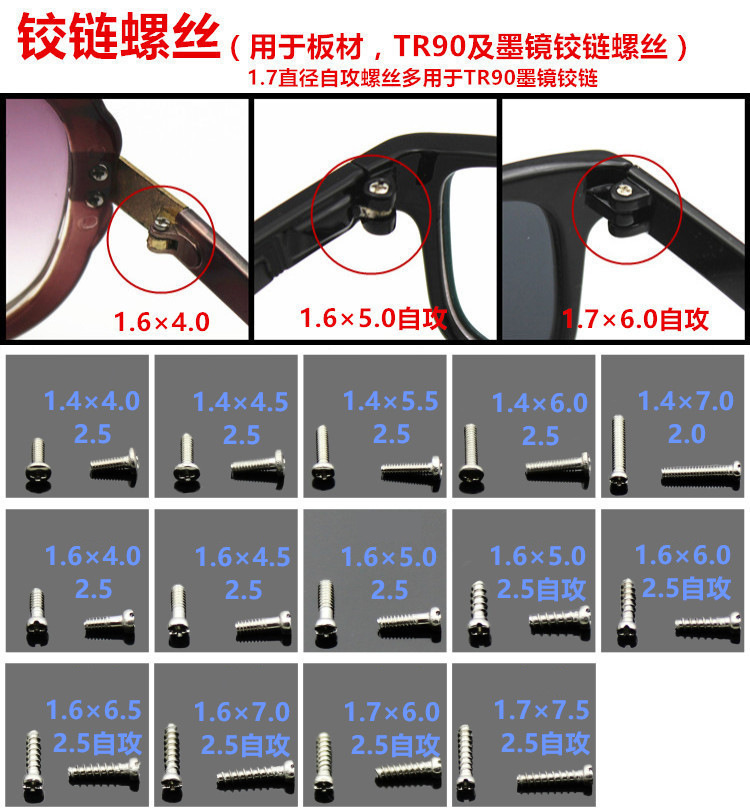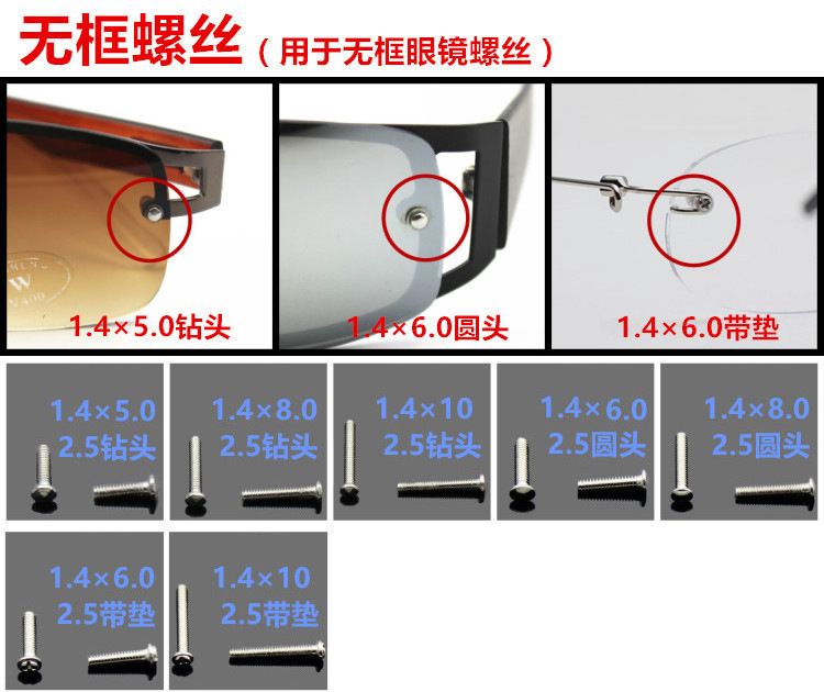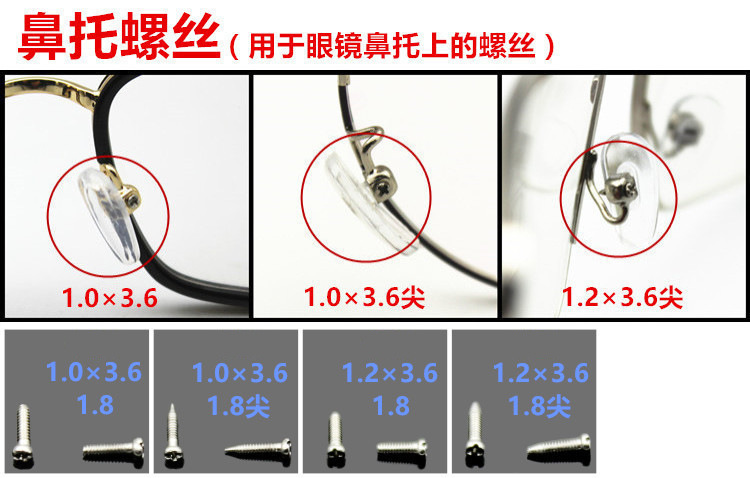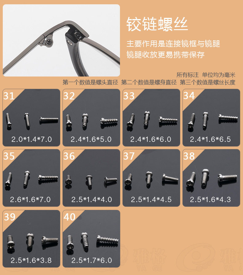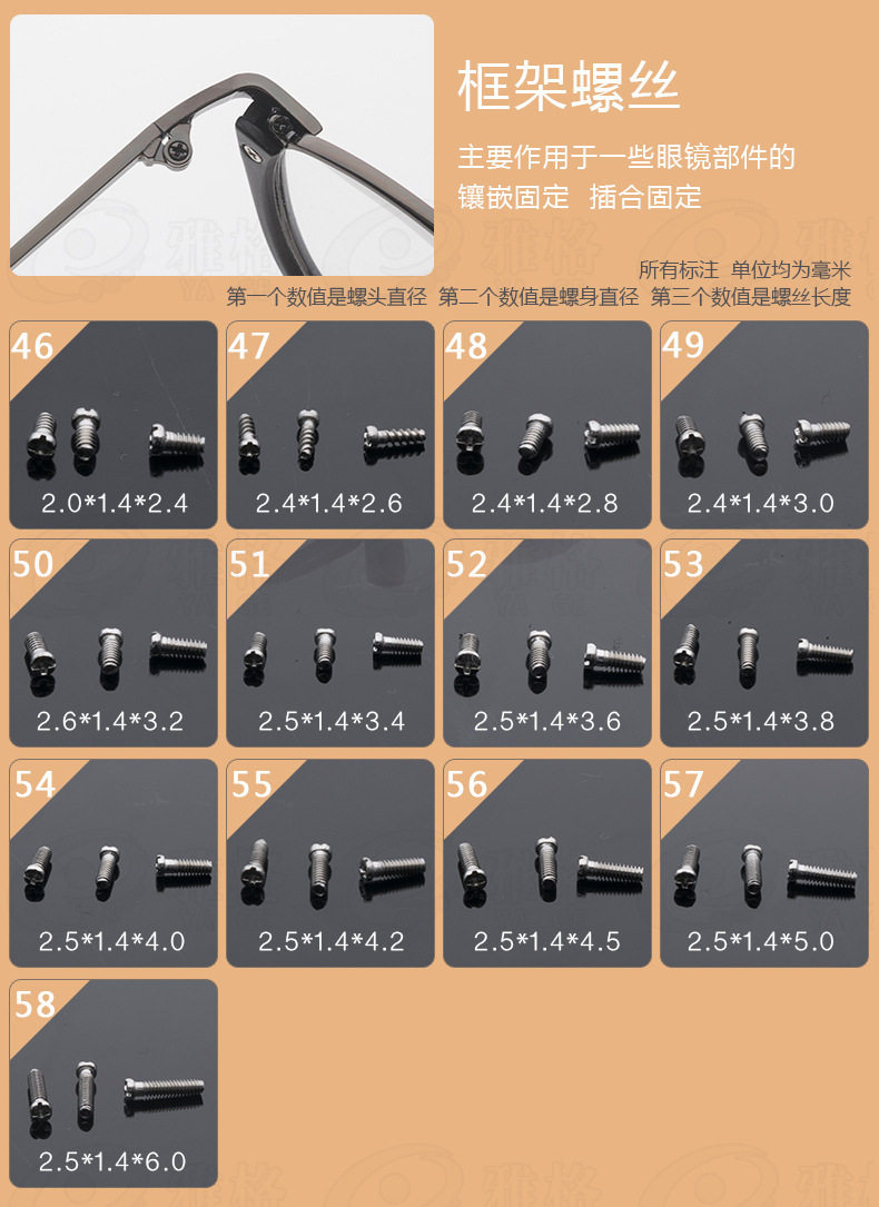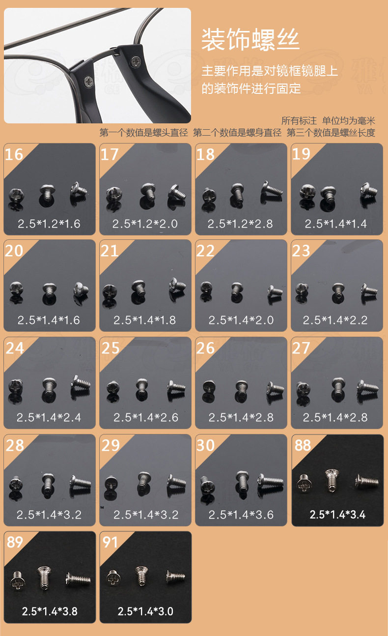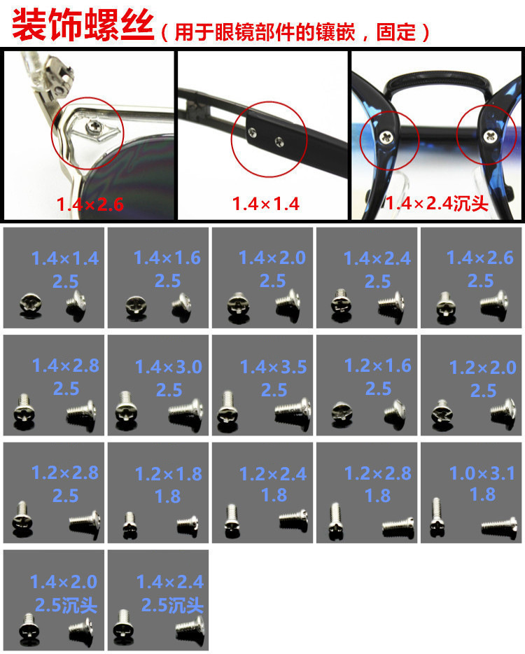 | Frame color | No. 3 nose pad screw flat 1.8*1.0*3.5,No. 5 nose pad screw flat head 10 1.8*1.0*3.6,No. 7 nose pad screw canine 1.8*1.0*4.0,No. 8 nose pad screw flat head 1.8*1.2*3.6,No. 9 nose pad repair screw flat head 10 1.8*1.2*3.8,No. 10 nose pad screw, tip 1.8*1.1*4.0,No. 11 frameless metal gasket 1.4,No. 12 spring washer 1.4,No. 13 t-type gasket inner diameter 1.4,No. 14 frameless screws and caps are commonly used,No. 16 decorative screw, small offset head +2.5*1.2*1.6,No. 17 decorative screw, small offset head +2.5*1.2*2.0,No. 18 decorative screw, small offset head +2.5*1.2*2.8,No. 19 decorative screw, small offset head +2.5*1.4*1.4,No. 20 decorative screw, small offset head +2.5*1.4*1.6,No. 21 decorative screw, small offset head +2.5*1.4*1.8,No. 22 decorative screw, small offset head +2.5*1.4*2.0,No. 23 decorative screw, small offset head +2.5*1.4*2.2,No. 24 decorative screw, small offset head +2.5*1.4*2.4,No. 25 decorative screw, small offset head +2.5*1.4*2.6,No. 26 decorative screw, flat head and sunken head+2.5*1.4*2.8,No. 27 decorative screw, small offset head +2.5*1.4*2.8,No. 28 decorative screw, small offset head +2.5*1.4*3.2,No. 29 decorative screw flat countersunk head+2.5*1.4*3.2,No. 30 decorative screw, small offset head +2.5*1.4*3.6,No. 31 hinge screw 2.0*1.4*7.0,No. 32 hinge screw 2.4*1.6*5.0,No. 33 hinge screw 2.4*1.6*6.0,No. 34 hinge screw 2.4*1.6*6.5,No. 35 hinge screw 2.4*1.6*7.0,No. 36 hinge screw 2.5*1.4*4.0,No. 37 hinge screw 2.5*1.4*4.5,No. 38 hinge screw 2.5*1.6*4.3,No. 39 hinge screw 2.5*1.6*3.8,No. 40 hinge screw 2.5*1.7*6.0,No. 41 hinge screw 2.5*1.6*6.5,No. 76 nose pad screw small flat head 1.8*1.0*3.6,No. 77 nose pad screw small flat head 1.8*1.1*3.6,No. 78 maintenance screw small flat head 1.8*1.2*3.8,No. 88 decorative screw flat countersunk head 10.5*1.4*3.4,No. 89 decorative screw flat countersunk head 2.5*1.4*3.8,No. 91 decorative screw flat countersunk head 2.5*1.4*3.0 |
