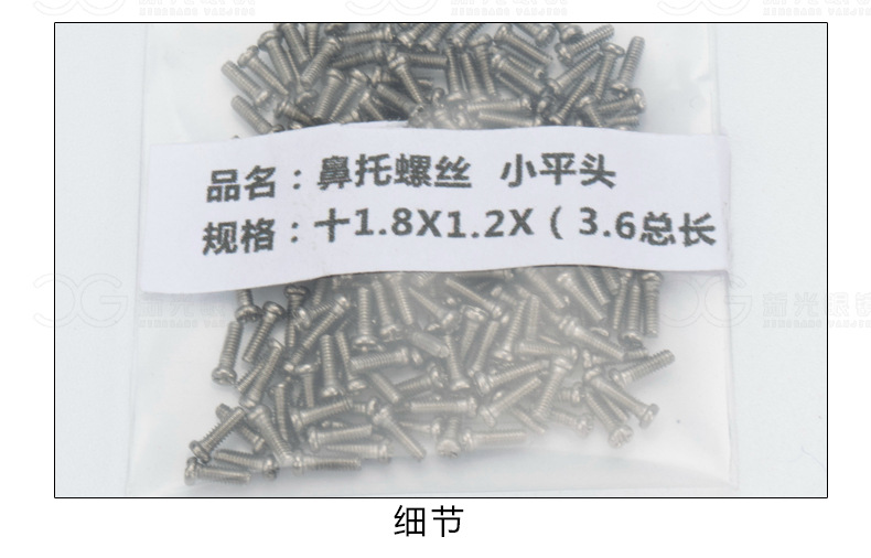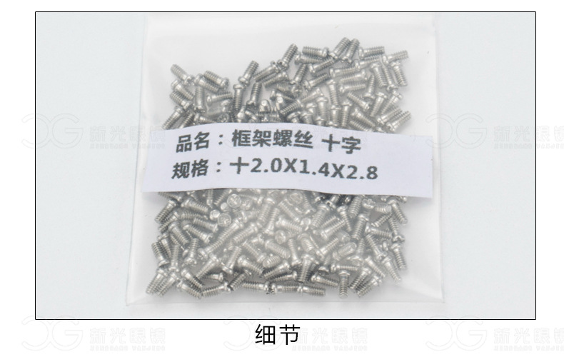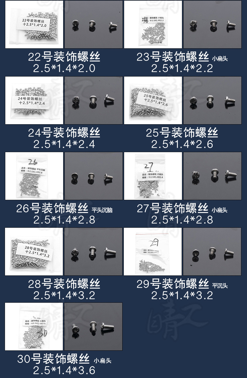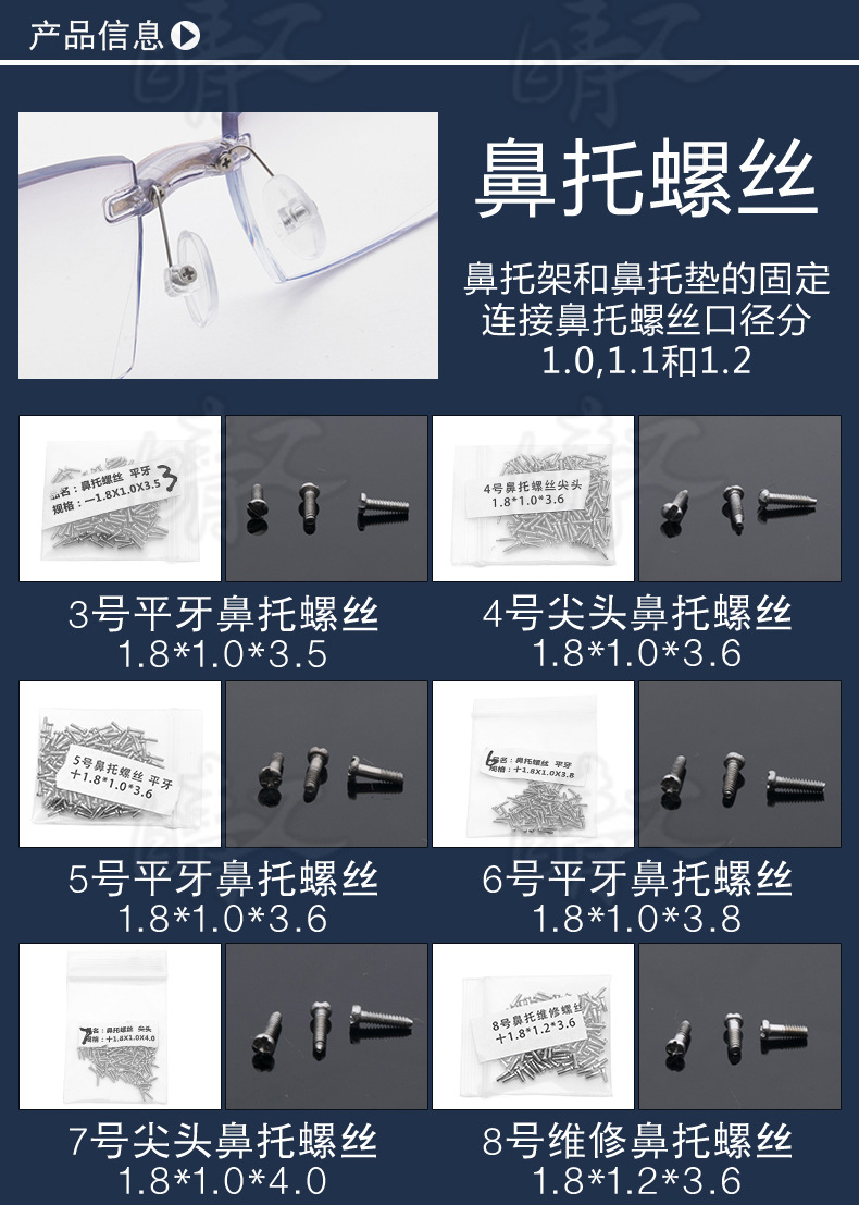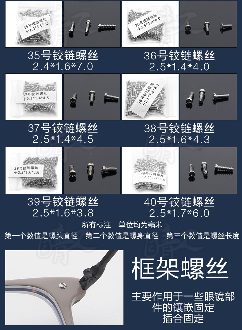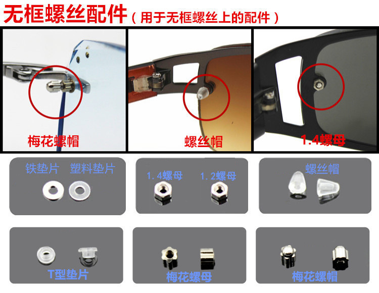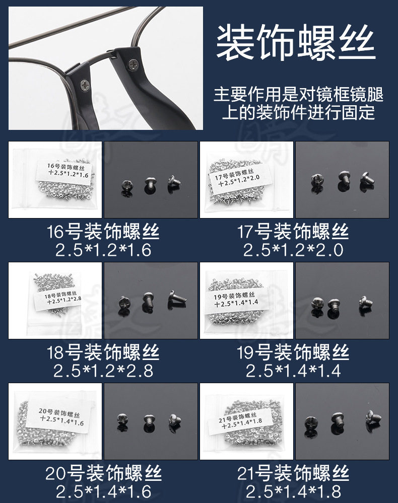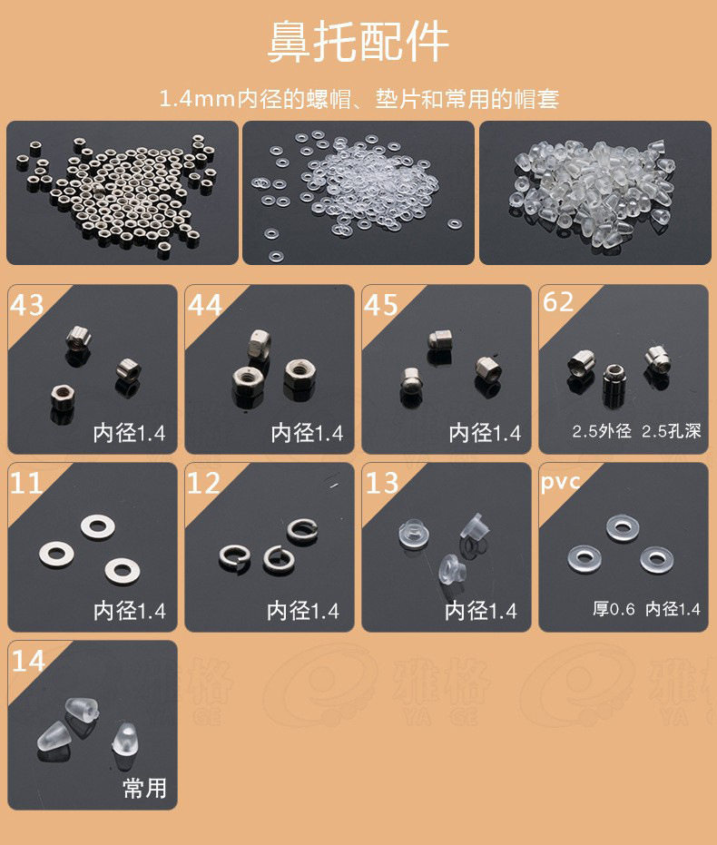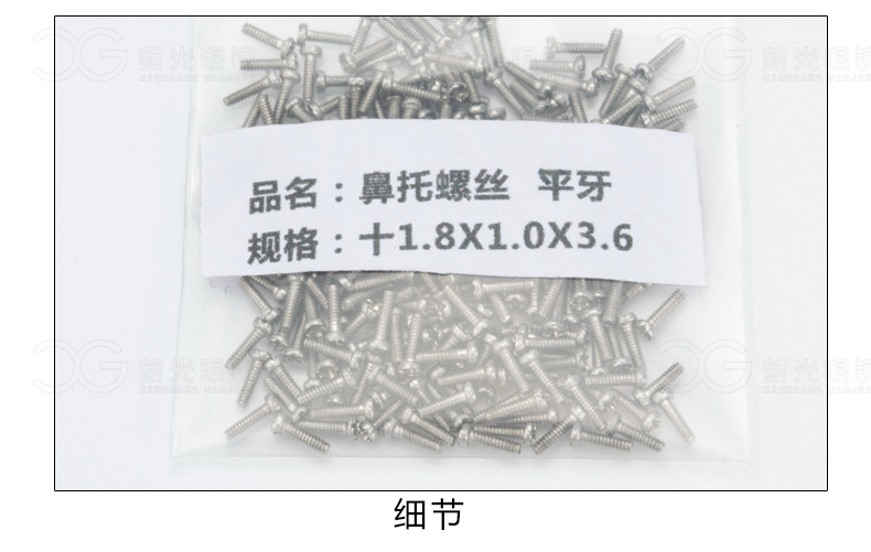 | Frame color | No. 3 nose pad screw flat 1.8*1.0*3.5,No. 5 nose pad screw flat head 10 1.8*1.0*3.6,No. 7 nose pad screw canine 1.8*1.0*4.0,No. 8 nose pad screw flat head 1.8*1.2*3.6,No. 9 nose pad repair screw flat head 10 1.8*1.2*3.8,No. 10 nose pad screw, tip 1.8*1.1*4.0,No. 11 frameless metal gasket 1.4,No. 12 spring washer 1.4,No. 13 t-type gasket inner diameter 1.4,No. 14 frameless screws and caps are commonly used,No. 16 decorative screw, small offset head +2.5*1.2*1.6,No. 17 decorative screw, small offset head +2.5*1.2*2.0,No. 18 decorative screw, small offset head +2.5*1.2*2.8,No. 19 decorative screw, small offset head +2.5*1.4*1.4,No. 20 decorative screw, small offset head +2.5*1.4*1.6,No. 21 decorative screw, small offset head +2.5*1.4*1.8,No. 22 decorative screw, small offset head +2.5*1.4*2.0,No. 23 decorative screw, small offset head +2.5*1.4*2.2,No. 24 decorative screw, small offset head +2.5*1.4*2.4,No. 25 decorative screw, small offset head +2.5*1.4*2.6,No. 26 decorative screw, flat head and sunken head+2.5*1.4*2.8,No. 27 decorative screw, small offset head +2.5*1.4*2.8,No. 28 decorative screw, small offset head +2.5*1.4*3.2,No. 29 decorative screw flat countersunk head+2.5*1.4*3.2,No. 30 decorative screw, small offset head +2.5*1.4*3.6,No. 31 hinge screw 2.0*1.4*7.0,No. 32 hinge screw 2.4*1.6*5.0,No. 33 hinge screw 2.4*1.6*6.0,No. 34 hinge screw 2.4*1.6*6.5,No. 35 hinge screw 2.4*1.6*7.0,No. 36 hinge screw 2.5*1.4*4.0,No. 37 hinge screw 2.5*1.4*4.5,No. 38 hinge screw 2.5*1.6*4.3,No. 39 hinge screw 2.5*1.6*3.8,No. 40 hinge screw 2.5*1.7*6.0,No. 41 hinge screw 2.5*1.6*6.5,No. 76 nose pad screw small flat head 1.8*1.0*3.6,No. 77 nose pad screw small flat head 1.8*1.1*3.6,No. 78 maintenance screw small flat head 1.8*1.2*3.8,No. 88 decorative screw flat countersunk head 10.5*1.4*3.4,No. 89 decorative screw flat countersunk head 2.5*1.4*3.8,No. 91 decorative screw flat countersunk head 2.5*1.4*3.0 |