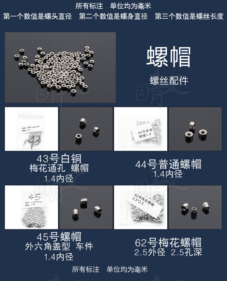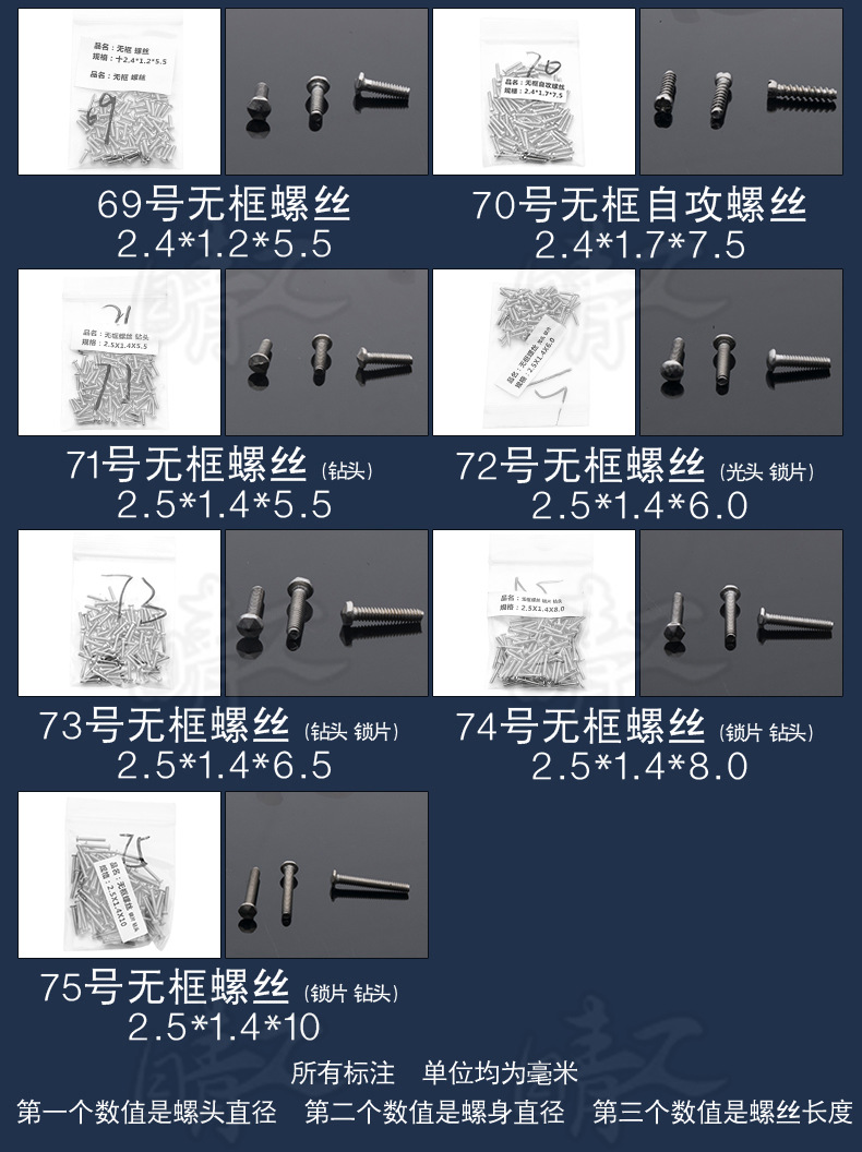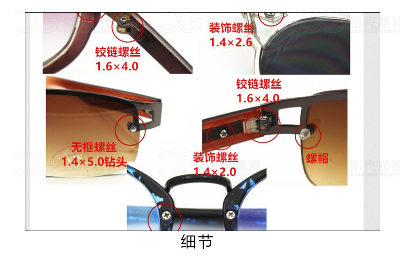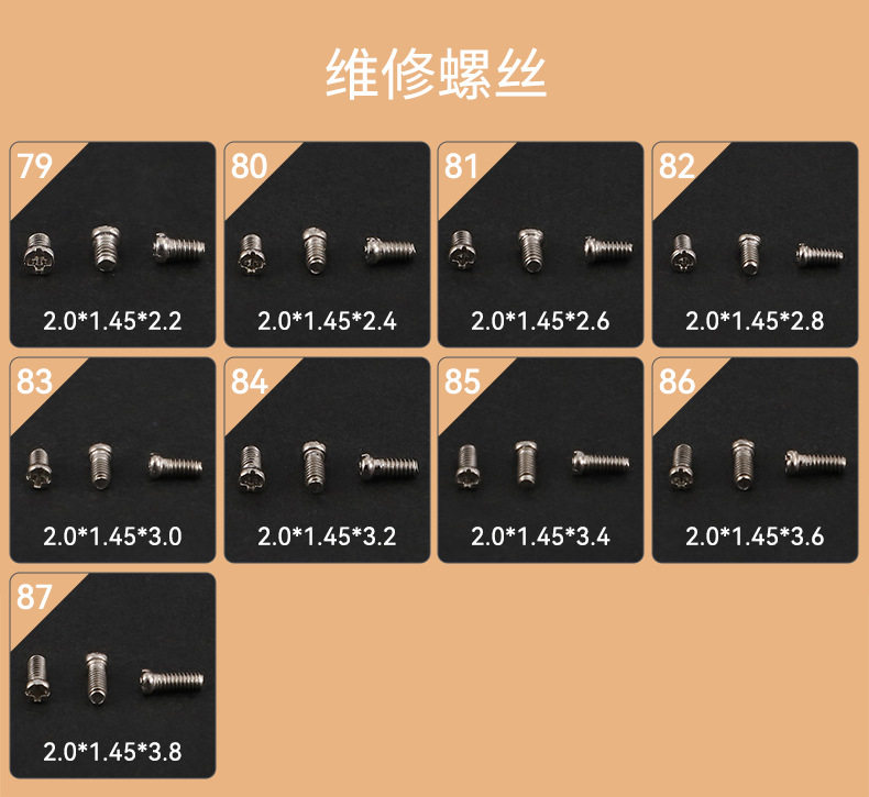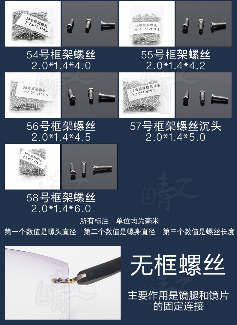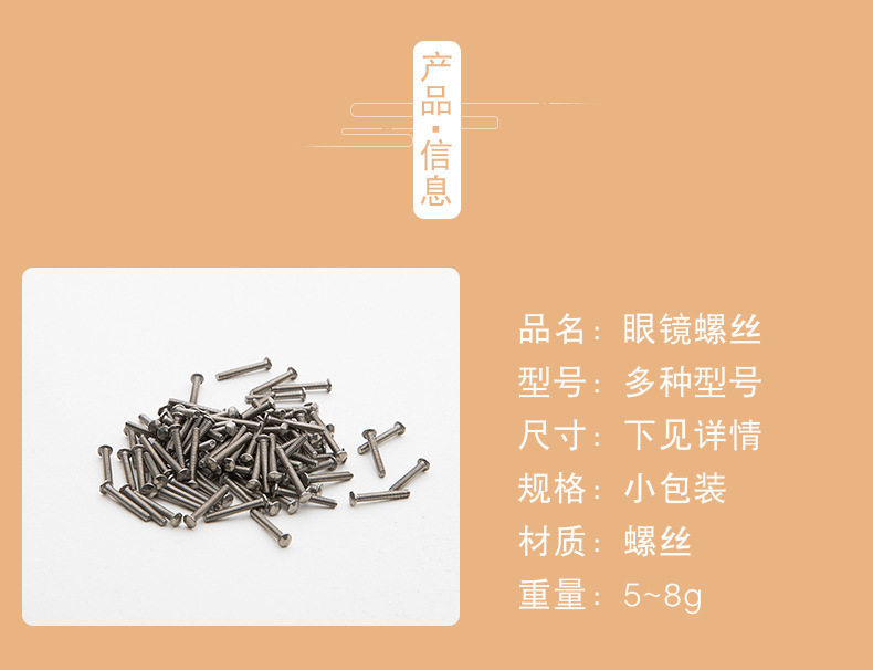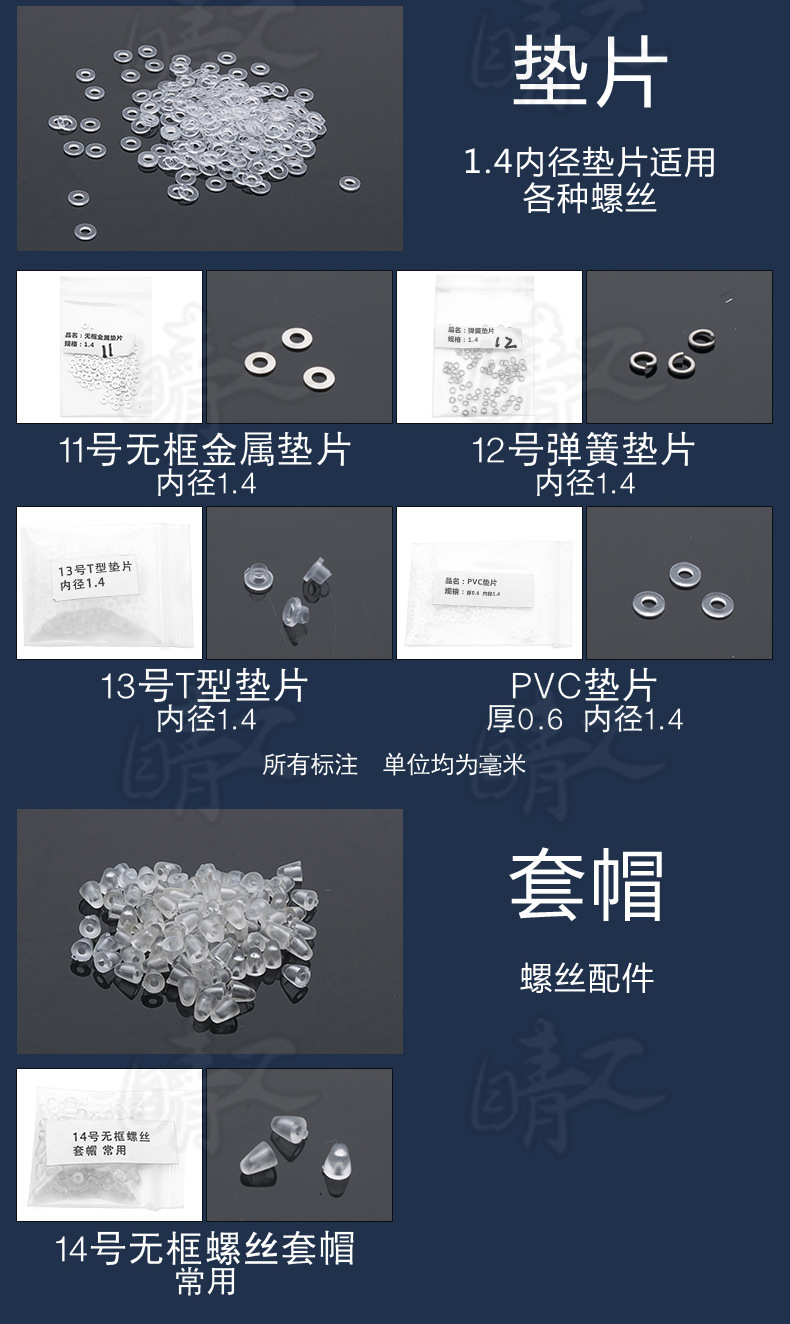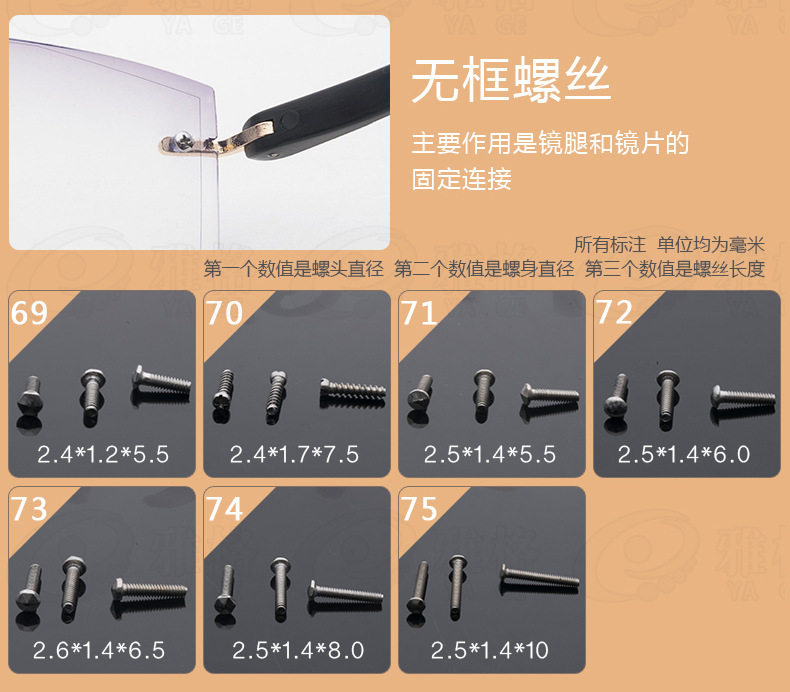 | Frame color | No. 3 nose pad screw flat 1.8*1.0*3.5,No. 5 nose pad screw flat head 10 1.8*1.0*3.6,No. 7 nose pad screw canine 1.8*1.0*4.0,No. 8 nose pad screw flat head 1.8*1.2*3.6,No. 9 nose pad repair screw flat head 10 1.8*1.2*3.8,No. 10 nose pad screw, tip 1.8*1.1*4.0,No. 11 frameless metal gasket 1.4,No. 12 spring washer 1.4,No. 13 t-type gasket inner diameter 1.4,No. 14 frameless screws and caps are commonly used,No. 16 decorative screw, small offset head +2.5*1.2*1.6,No. 17 decorative screw, small offset head +2.5*1.2*2.0,No. 18 decorative screw, small offset head +2.5*1.2*2.8,No. 19 decorative screw, small offset head +2.5*1.4*1.4,No. 20 decorative screw, small offset head +2.5*1.4*1.6,No. 21 decorative screw, small offset head +2.5*1.4*1.8,No. 22 decorative screw, small offset head +2.5*1.4*2.0,No. 23 decorative screw, small offset head +2.5*1.4*2.2,No. 24 decorative screw, small offset head +2.5*1.4*2.4,No. 25 decorative screw, small offset head +2.5*1.4*2.6,No. 26 decorative screw, flat head and sunken head+2.5*1.4*2.8,No. 27 decorative screw, small offset head +2.5*1.4*2.8,No. 28 decorative screw, small offset head +2.5*1.4*3.2,No. 29 decorative screw flat countersunk head+2.5*1.4*3.2,No. 30 decorative screw, small offset head +2.5*1.4*3.6,No. 31 hinge screw 2.0*1.4*7.0,No. 32 hinge screw 2.4*1.6*5.0,No. 33 hinge screw 2.4*1.6*6.0,No. 34 hinge screw 2.4*1.6*6.5,No. 35 hinge screw 2.4*1.6*7.0,No. 36 hinge screw 2.5*1.4*4.0,No. 37 hinge screw 2.5*1.4*4.5,No. 38 hinge screw 2.5*1.6*4.3,No. 39 hinge screw 2.5*1.6*3.8,No. 40 hinge screw 2.5*1.7*6.0,No. 41 hinge screw 2.5*1.6*6.5,No. 76 nose pad screw small flat head 1.8*1.0*3.6,No. 77 nose pad screw small flat head 1.8*1.1*3.6,No. 78 maintenance screw small flat head 1.8*1.2*3.8,No. 88 decorative screw flat countersunk head 10.5*1.4*3.4,No. 89 decorative screw flat countersunk head 2.5*1.4*3.8,No. 91 decorative screw flat countersunk head 2.5*1.4*3.0 |