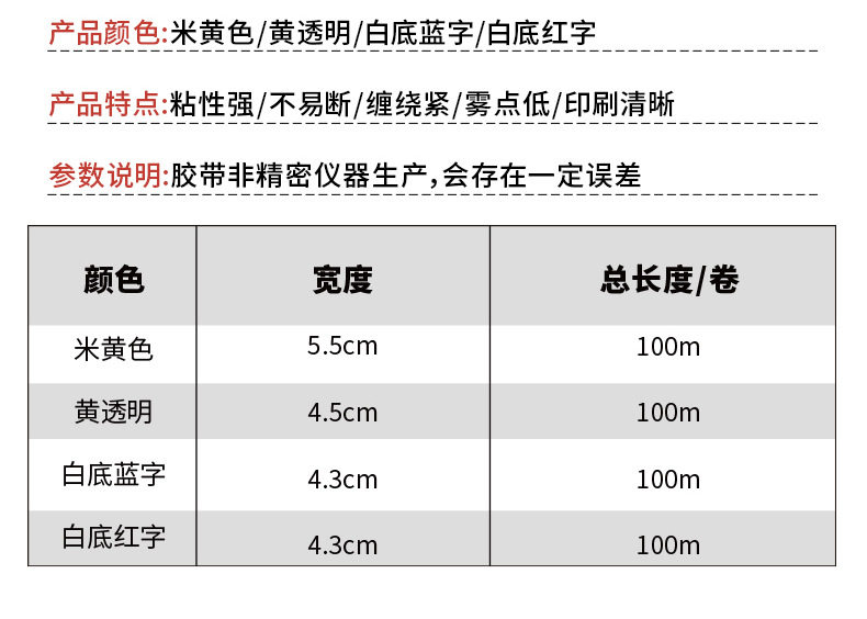 | Specifications and models | White background with red letters; width 4.3*100cm,White background with blue characters; width 4.3*100cm,Beige; width 5.5*100cm,Yellow transparent; width 4.5*100cm |