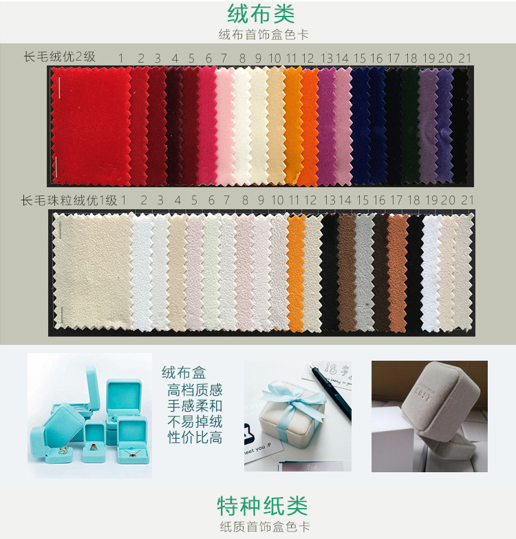 | Specifications and models | Gray; 4.5*5 small ring and earring box,Gray; 6*7/small pendant box/necklace box,Gray;5*6/large ring and earring box,Gray;7*7/medium pendant box/necklace box,Gray;7*10/large pendant box/necklace box,Gray;9*9*4/bracelet box/bracelet box,Gray; 21.5*5 bracelet box/long chain box,Gray; 7*7/ear hook earrings and earrings box,Gray; octagonal 7*8 pendant box,Gray; 7*7*4/velvet couple ring box,Off-white; 4.5*5 small ring and earring box,Off-white; 6*7/small pendant box/necklace box,Off-white; 5*6/large ring and earring box,Off-white;7*7/medium pendant box/necklace box,Off-white;7*10/large pendant box/necklace box,Off-white;9*9*4/bracelet box/bracelet box,Off-white; 21.5*5 bracelet box/long chain box,Off-white; 7*7/ear hook earrings and earrings box,Off-white; octagonal 7*8 pendant box,Off-white; 7*7*4/velvet couple ring box,Black; 4.5*5 small ring earring box,Black; 6*7/small pendant box/necklace box,Black; 5*6/large ring and earring box,Black;7*7/medium pendant box/necklace box,Black;7*10/large pendant box/necklace box,Black;9*9*4/bracelet box/bracelet box,Black; 21.5*5 bracelet box/long chain box,Black; 7*7/ear hook earrings and stud box,Black; octagonal 7*8 pendant box,Black; 7*7*4/velvet couple ring box,Burgundy color; 4.5*5 small ring and earring box,Burgundy color; 6*7/small pendant box/necklace box,Burgundy color; 5*6/large ring and earring box,Burgundy color; 7*7/medium pendant box/necklace box,Burgundy color;7*10/large pendant box/necklace box,Burgundy color;9*9*4/bracelet box/bracelet box,Burgundy color; 21.5*5 bracelet box/long chain box,Burgundy color; 7*7/ear hook earrings and earrings box,Burgundy color; octagonal 7*8 pendant box,Pink; 4.5*5 small ring and earring box,Pink;6*7/small pendant box/necklace box,Pink;5*6/large ring and earring box,Pink;7*7/medium pendant box/necklace box,Pink;7*10/large pendant box/necklace box,Pink;9*9*4/bracelet box/bracelet box,Pink; 21.5*5 bracelet box/long chain box,Pink;7*7/ear hook earrings and stud box,Pink; octagonal 7*8 pendant box,Pink;7*7*4/flannel couple ring box,Aquatic orchid; 4.5*5 small ring and earring box,Water orchid; 6*7/small pendant box/necklace box,Aquatic orchid;5*6/large ring and earring box,Water orchid;7*7/medium pendant box/necklace box,Water orchid;7*10/large pendant box/necklace box,Water orchid;9*9*4/bracelet box/bracelet box,Shui folan; 21.5*5 bracelet box/long chain box,Aquatic orchid;7*7/ear hook earrings and stud box,Aquatic orchid; octagonal 7*8 pendant box,Aquatic orchid; 7*7*4/flannel couple ring box,Yam purple; 4.5*5 small ring and earring box,Yam purple; 6*7/small pendant box/necklace box,Yam purple; 5*6/large ring and earring box,Yam purple;7*7/medium pendant box/necklace box,Yam purple;7*10/large pendant box/necklace box,Yam purple;9*9*4/bracelet box/bracelet box,Yam purple; 21.5*5 bracelet box/long chain box,Yam purple; 7*7/ear hook earrings and earrings box,Yam purple; octagonal 7*8 pendant box,Yam purple; 7*7*4/velvet couple ring box,Apricot color; 4.5*5 small ring and earring box,Apricot color; 6*7/small pendant box/necklace box,Apricot; 5*6/large ring and earring box,Apricot color;7*7/medium pendant box/necklace box,Apricot color;7*10/large pendant box/necklace box,Apricot;9*9*4/bracelet box/bracelet box,Apricot color; 21.5*5 bracelet box/long chain box,Apricot;7*7/ear hook earrings and stud box,Apricot color; octagonal 7*8 pendant box,Apricot; 7*7*4/velvet couple ring box,Royal blue; 4.5*5 small ring earring box,Royal blue; 6*7/small pendant box/necklace box,Royal blue; 5*6/large ring and earring box,Royal blue;7*7/medium pendant box/necklace box,Royal blue;7*10/large pendant box/necklace box,Royal blue;9*9*4/bracelet box/bracelet box,Royal blue; 21.5*5 bracelet box/long chain box,Royal blue; 7*7/ear hook earrings and stud box,Royal blue; octagonal 7*8 pendant box,Big red; 4.5*5 small ring and earring box,Big red; 6*7/small pendant box/necklace box,Big red; 5*6/large ring and earring box,Big red;7*7/medium pendant box/necklace box,Big red;7*10/large pendant box/necklace box,Big red;9*9*4/bracelet box/bracelet box,Big red; 21.5*5 bracelet box/long chain box,Big red; 7*7/ear hook earrings and earrings box,Big red; octagonal 7*8 pendant box,Gray pink; 4.5*5 small ring and earring box,Gray pink; 6*7/small pendant box/necklace box,Gray pink;5*6/large ring and earring box,Gray pink;7*7/medium pendant box/necklace box,Gray pink;7*10/large pendant box/necklace box,Gray pink;9*9*4/bracelet box/bracelet box,Gray pink; 21.5*5 bracelet box/long chain box,Gray pink; 7*7/ear hook earrings and earrings box,Gray pink; octagonal 7*8 pendant box,White inside aqua blue; 4.5*5 small ring and earring box,White inside aqua blue; 5*6/large ring and earring box,White inside aqua blue; 7*7/medium pendant box/necklace box,White inside aqua blue; 7*10/large pendant box/necklace box,White inside aqua blue; 9*9*4/bracelet box/bracelet box,White inside aqua blue; 21.5*5 bracelet box/long chain box,Dark green inner white (customized color); 4.5*5 small ring earring box |