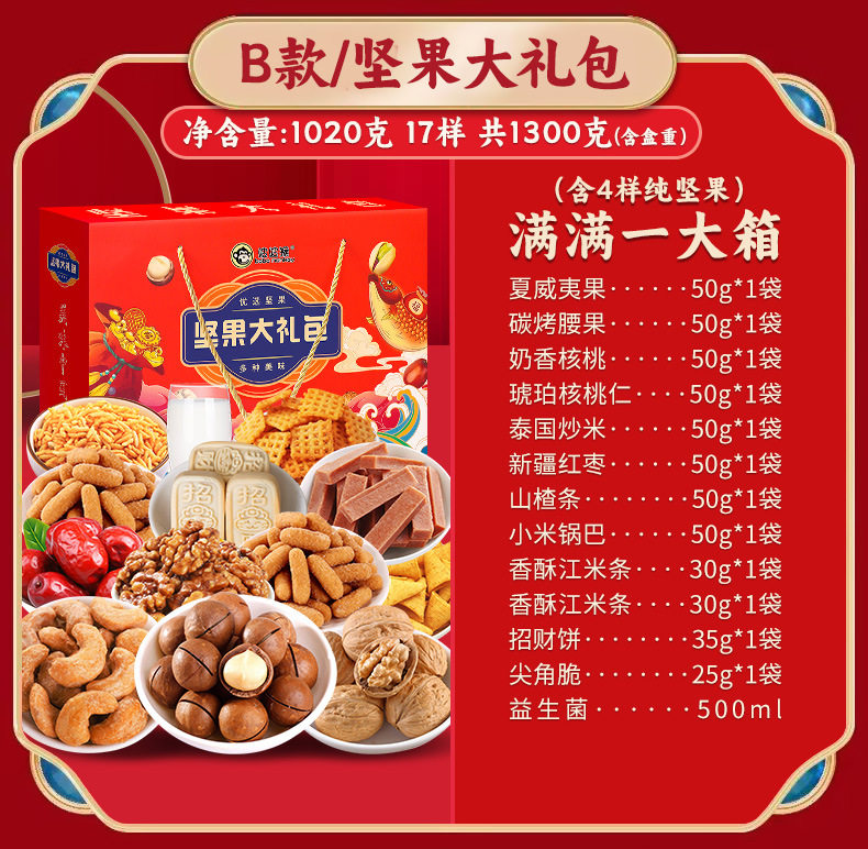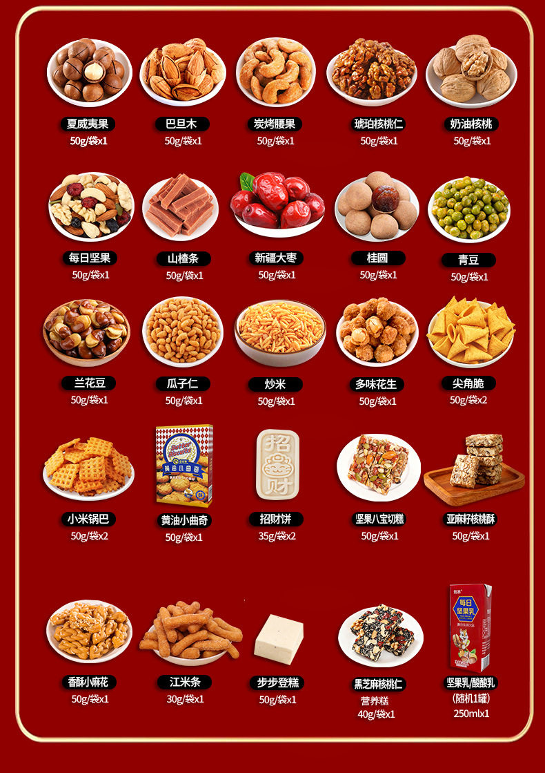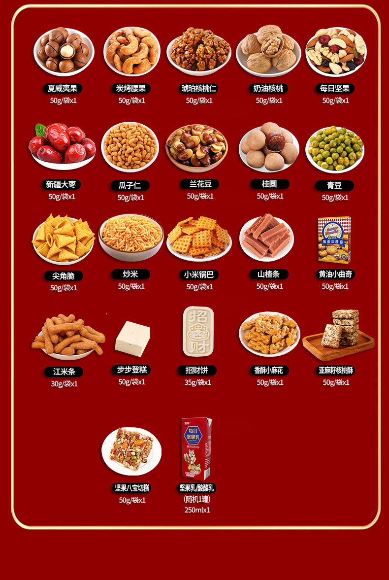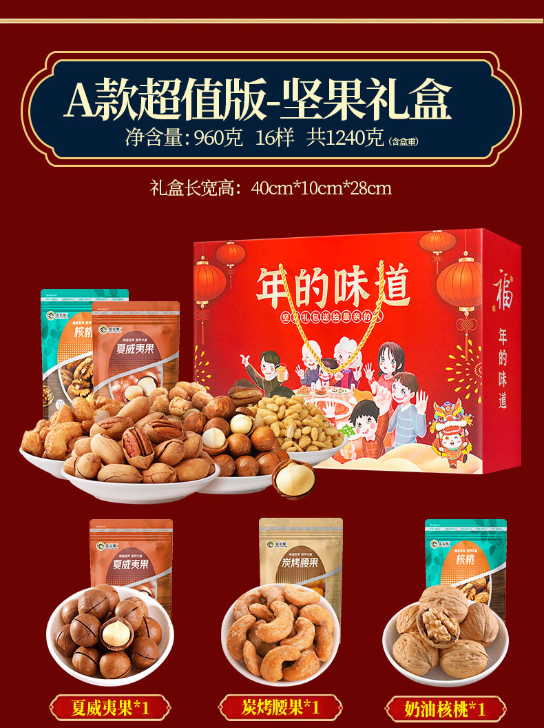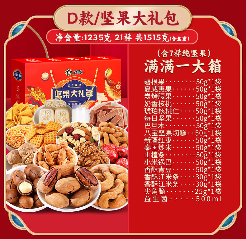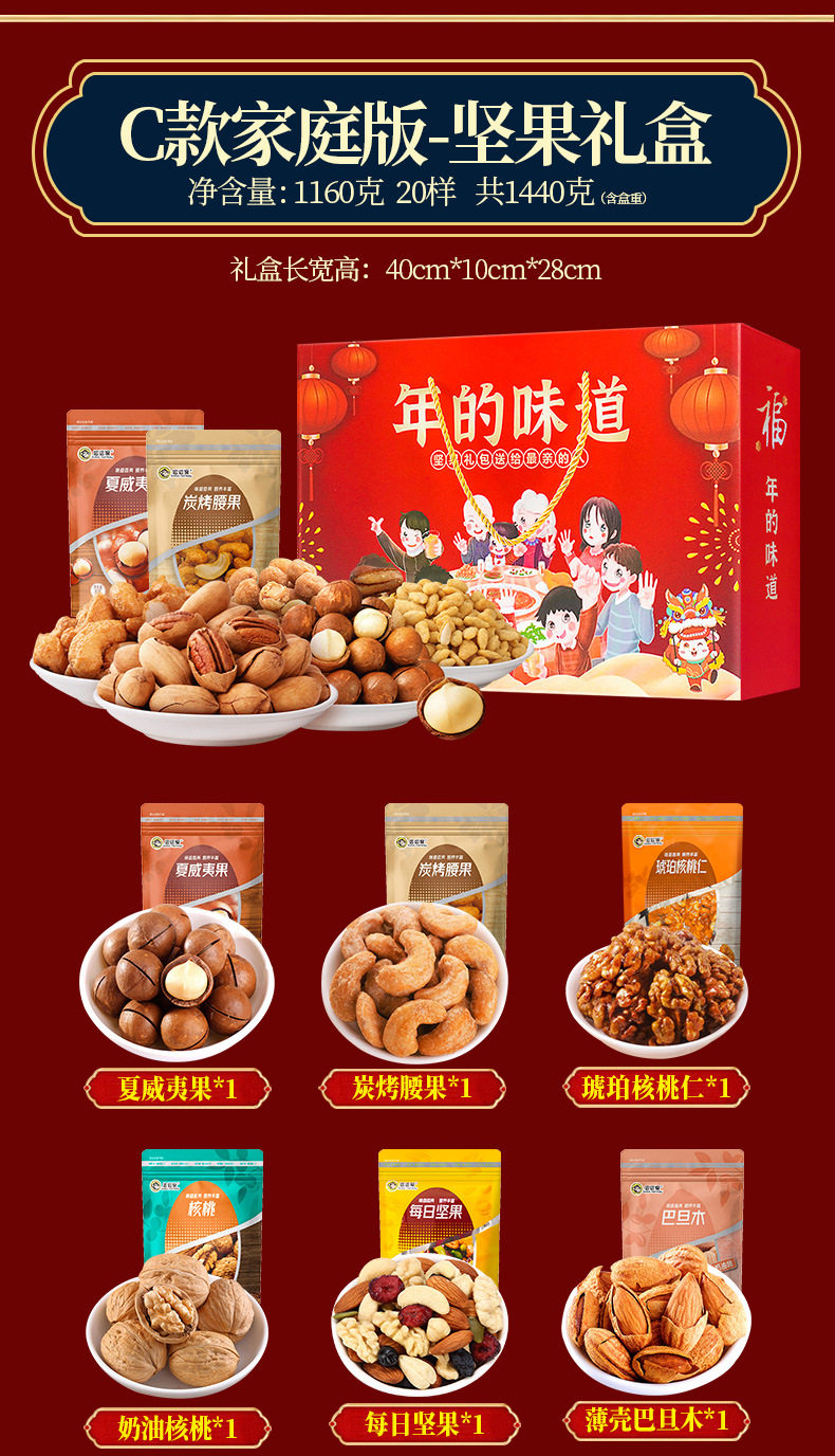 | Packaging specifications | V4 hongyun gift: 13 bags of nut gift box (1070g/box weight) promotional version,Colorful fruit gift - national trend gift box type a [12 bags of 12 flavors + 1 milk 1055g] including box weight,Yuxiangguo new leather handbag model a - gift box [15 bags of 13 flavors + 2 milk 1390g] including box weight,Yuexiangguo new leather handbag model b - gift box [18 bags, 16 flavors + 2 milk, 1570g] including box weight,Yuxiangguo new leather handbag c style - gift box [24 bags, 22 flavors + 2 milk, 1855g] including box weight,Colorful fruit gift - national trend gift box type b [16 bags of 16 flavors + 1 milk 1255g] including box weight,Colorful fruit gift-national trend gift box type c [20 bags of 20 flavors + 1 milk 1475g] including box weight,A2-s promotional model: 15 bags of nut gift box (1190g/box weight included),High-end three-tier gift set - [gilded brilliance a edition - hot stamping gift box] 15 packs, 1695g - weight including box,High-end three-tier gift set - [gilded brilliance gift set b - hot stamped gift box] - total 20 packs, 1945g - includes box weight,High-end three-tier gift set - [gilded brilliance gift set c - hot stamping gift box] total 24 packs, 2155g - including box weight,Extra large - long lucky style a - gift box (20 bags, 1145g),Extra large - long lucky b style - gift box (22 bags, 1265g),Extra large - long strip premium c style - gift box (28 bags, 1540g),New hongyun zhenpin type a - hot stamping gift box [15 packs in total, 1240g] including box weight,New hongyun zhenpin type b - hot stamping gift box [20 packs in total, 1495g] including box weight,New hongyun zhenpin c model - hot stamping gift box [26 packs in total, 1795 grams] including box weight,Lucky & prosperous gift set: 13-bag nut gift box (1010g/box weight) - value pack,Exquisite canned gift box [new year gift type a 10 cans 1580g] canned nut gift box,Exquisite canned gift box [new year gift type b, 10 cans, 1590g] canned nut gift box,Canned fruit gift set a3-a: contains 8 cans, 1770g/box,Canned fruit gift set a3-b: contains 8 cans, 1840g total,High-end square bamboo basket t7-a model--gift box: (15 bags/1295g) including box weight,High-end square bamboo basket t7-b model--gift box: (20 bags 1545g) including box weight,High-end square bamboo basket t7-c model--gift box: (16 bags in total, 1390 grams) including box weight,V1-a model: (bamboo nut gift box) 15 items 940g/box,V1-b model: (bamboo nut gift box) 20 items 1205g/box,V1-c model: (bamboo nut gift box) 20 samples 1355g/box,Premium gift box - oriental delights a [12 bags, 11 flavors, 1470g] - weight with box included,Premium gift box - oriental delights b [17 bags, 16 flavors, 1720g] - weight with box included,Premium gift box - oriental delights style c [20 bags, 19 flavors, 1885g] - weight with box included,The taste of the year a2-a: 16 bags of nut gift box (1240g/box weight included),The taste of the year a2-b: 19 bags of nut gift box (1375g/box weight included),The taste of the year a2-c: 20 bags of nut gift box (1440g/box weight included),The taste of the year a2-d model: 21 bags of nut gift box (1475g/box weight included),Olive green style a: 14 bags of nut gift box (1490g/box weight) accessible luxury style,Olive green type b: 16 bags of nut gift box (1610g/weight including box),V2-a: (pure nuts gift box) 14 bags, 1100g/box,V2-b type: (pure nut gift box) 20 bags 1400g/box,V3-a model: 15 bags of nut gift box (1190g/box) including box weight,V3-b model: 17 bags of nut gift box (1290g/box) including box weight,V3-c model: 20 bags of nut gift box (1425g/box) including box weight,V3-d model: 23 bags of nut gift box (1790g/box) including box weight,Auspicious royal gift: premium gift box (16 bags, 1475g) - box weight included,Luxury gift set - premium gift box t8-a: 15 bags, 15 flavors (1225g/box weight),Luxury gift set - premium gift box t8-b: 20 bags, 19 flavors (1475g/box weight),Luxury gift set - premium gift box t8-c: 26 sachets, 23 flavors (1755g/box weight),Nut gift pack g3-a: a total of 9 flavors and 15 pieces of nut gift box (1190g/box weight included),Nut gift pack g3-b: a total of 19 kinds of nuts in 14 flavors (1400g/box weight included),Nut gift pack g3-c: a total of 16 flavors and 21 types of nut gift boxes (1515g/box weight included),Nut gift pack g3-d: 22 items in total of 17 flavors (1565g/box weight included) |