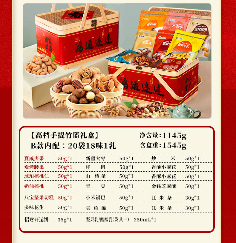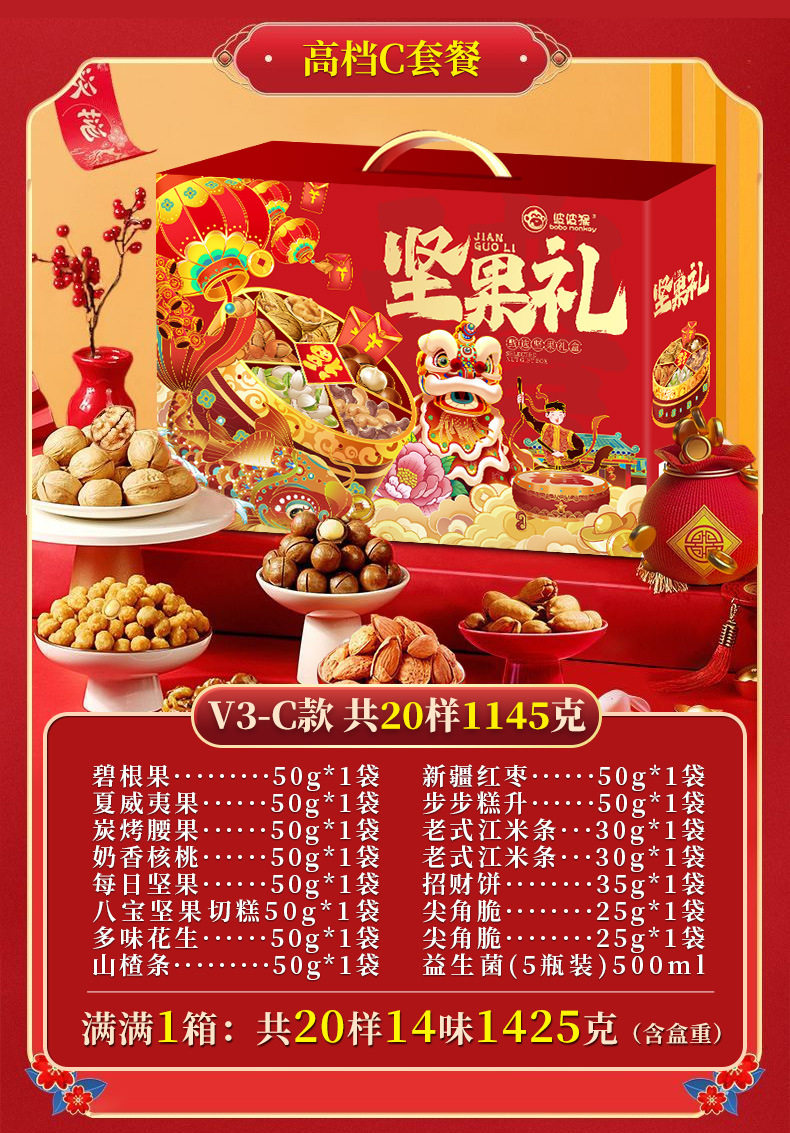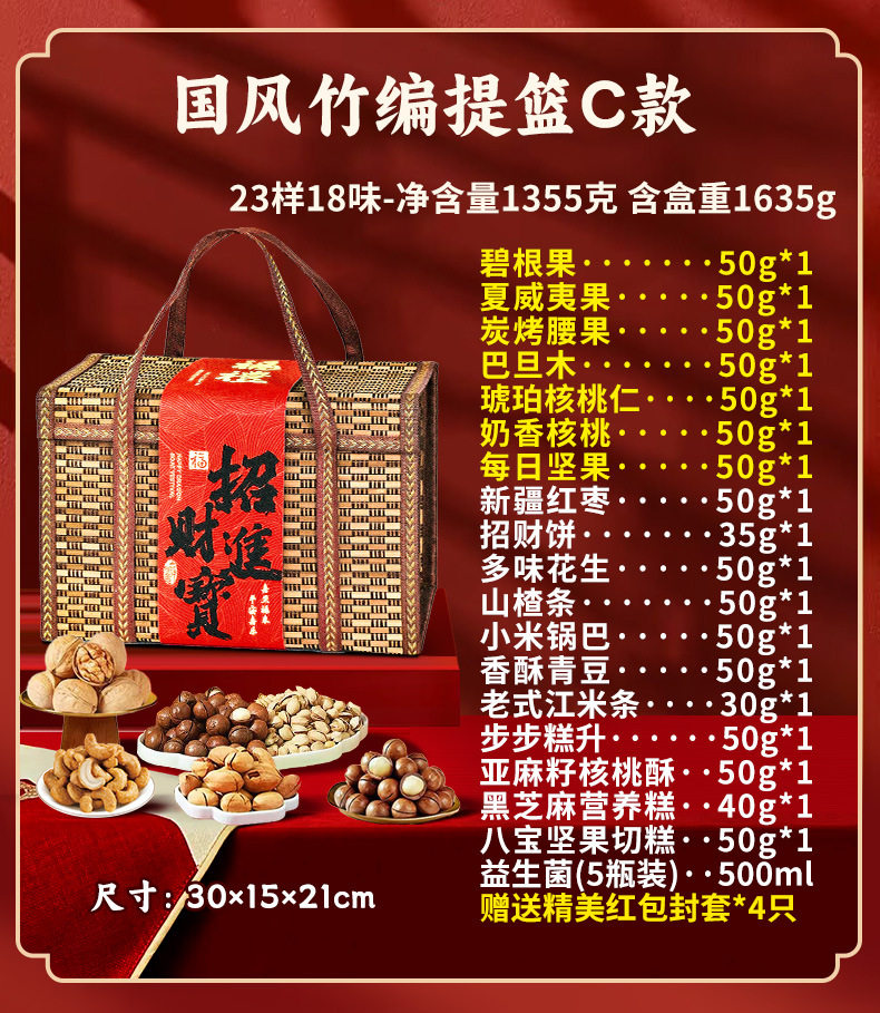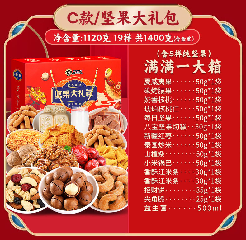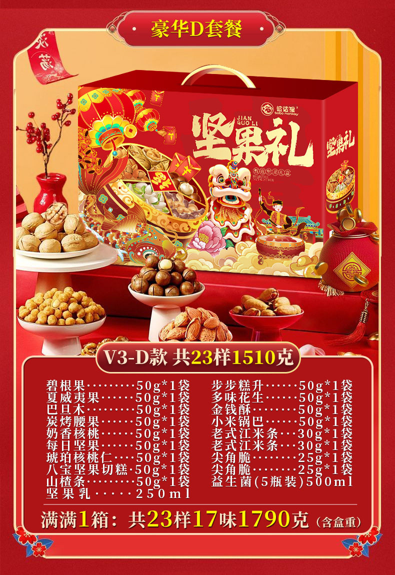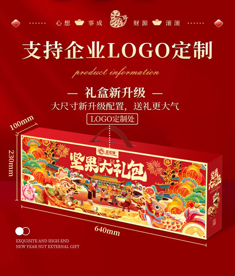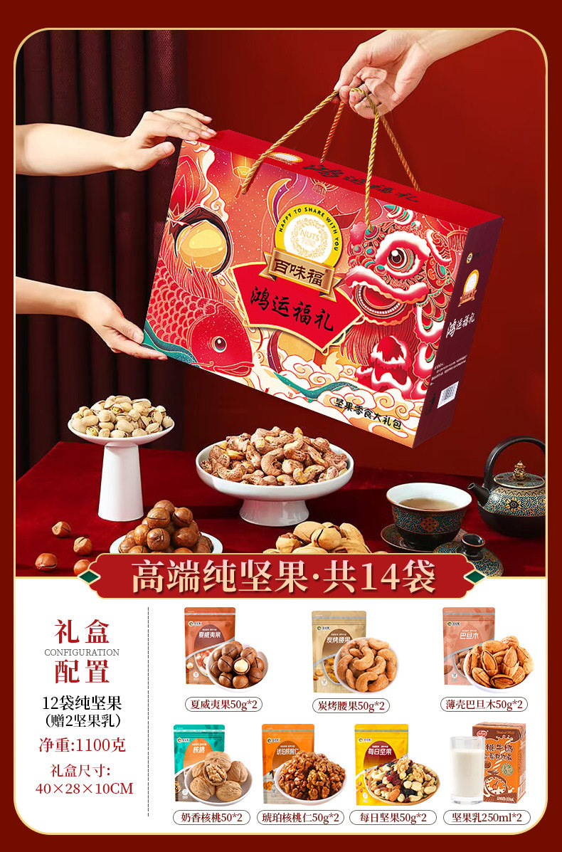 | Packaging specifications | V4 hongyun gift: 13 bags of nut gift box (1070g/box weight) promotional version,Colorful fruit gift - national trend gift box type a [12 bags of 12 flavors + 1 milk 1055g] including box weight,Yuxiangguo new leather handbag model a - gift box [15 bags of 13 flavors + 2 milk 1390g] including box weight,Yuexiangguo new leather handbag model b - gift box [18 bags, 16 flavors + 2 milk, 1570g] including box weight,Yuxiangguo new leather handbag c style - gift box [24 bags, 22 flavors + 2 milk, 1855g] including box weight,Colorful fruit gift - national trend gift box type b [16 bags of 16 flavors + 1 milk 1255g] including box weight,Colorful fruit gift-national trend gift box type c [20 bags of 20 flavors + 1 milk 1475g] including box weight,A2-s promotional model: 15 bags of nut gift box (1190g/box weight included),High-end three-tier gift set - [gilded brilliance a edition - hot stamping gift box] 15 packs, 1695g - weight including box,High-end three-tier gift set - [gilded brilliance gift set b - hot stamped gift box] - total 20 packs, 1945g - includes box weight,High-end three-tier gift set - [gilded brilliance gift set c - hot stamping gift box] total 24 packs, 2155g - including box weight,Extra large - long lucky style a - gift box (20 bags, 1145g),Extra large - long lucky b style - gift box (22 bags, 1265g),Extra large - long strip premium c style - gift box (28 bags, 1540g),New hongyun zhenpin type a - hot stamping gift box [15 packs in total, 1240g] including box weight,New hongyun zhenpin type b - hot stamping gift box [20 packs in total, 1495g] including box weight,New hongyun zhenpin c model - hot stamping gift box [26 packs in total, 1795 grams] including box weight,Lucky & prosperous gift set: 13-bag nut gift box (1010g/box weight) - value pack,Exquisite canned gift box [new year gift type a 10 cans 1580g] canned nut gift box,Exquisite canned gift box [new year gift type b, 10 cans, 1590g] canned nut gift box,Canned fruit gift set a3-a: contains 8 cans, 1770g/box,Canned fruit gift set a3-b: contains 8 cans, 1840g total,High-end square bamboo basket t7-a model--gift box: (15 bags/1295g) including box weight,High-end square bamboo basket t7-b model--gift box: (20 bags 1545g) including box weight,High-end square bamboo basket t7-c model--gift box: (16 bags in total, 1390 grams) including box weight,V1-a model: (bamboo nut gift box) 15 items 940g/box,V1-b model: (bamboo nut gift box) 20 items 1205g/box,V1-c model: (bamboo nut gift box) 20 samples 1355g/box,Premium gift box - oriental delights a [12 bags, 11 flavors, 1470g] - weight with box included,Premium gift box - oriental delights b [17 bags, 16 flavors, 1720g] - weight with box included,Premium gift box - oriental delights style c [20 bags, 19 flavors, 1885g] - weight with box included,The taste of the year a2-a: 16 bags of nut gift box (1240g/box weight included),The taste of the year a2-b: 19 bags of nut gift box (1375g/box weight included),The taste of the year a2-c: 20 bags of nut gift box (1440g/box weight included),The taste of the year a2-d model: 21 bags of nut gift box (1475g/box weight included),Olive green style a: 14 bags of nut gift box (1490g/box weight) accessible luxury style,Olive green type b: 16 bags of nut gift box (1610g/weight including box),V2-a: (pure nuts gift box) 14 bags, 1100g/box,V2-b type: (pure nut gift box) 20 bags 1400g/box,V3-a model: 15 bags of nut gift box (1190g/box) including box weight,V3-b model: 17 bags of nut gift box (1290g/box) including box weight,V3-c model: 20 bags of nut gift box (1425g/box) including box weight,V3-d model: 23 bags of nut gift box (1790g/box) including box weight,Auspicious royal gift: premium gift box (16 bags, 1475g) - box weight included,Luxury gift set - premium gift box t8-a: 15 bags, 15 flavors (1225g/box weight),Luxury gift set - premium gift box t8-b: 20 bags, 19 flavors (1475g/box weight),Luxury gift set - premium gift box t8-c: 26 sachets, 23 flavors (1755g/box weight),Nut gift pack g3-a: a total of 9 flavors and 15 pieces of nut gift box (1190g/box weight included),Nut gift pack g3-b: a total of 19 kinds of nuts in 14 flavors (1400g/box weight included),Nut gift pack g3-c: a total of 16 flavors and 21 types of nut gift boxes (1515g/box weight included),Nut gift pack g3-d: 22 items in total of 17 flavors (1565g/box weight included) |