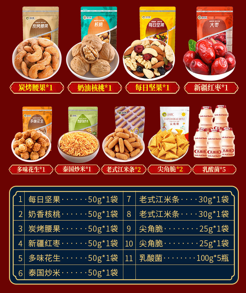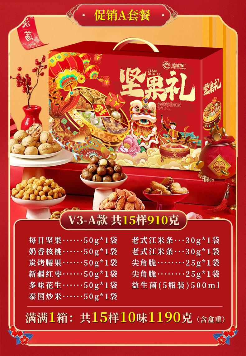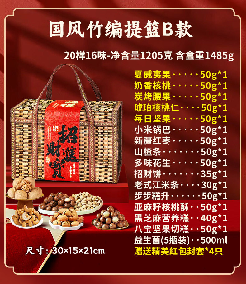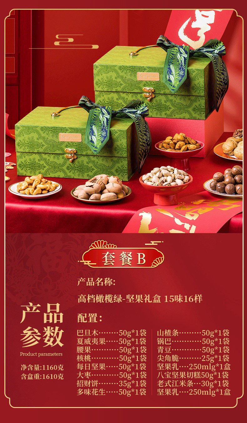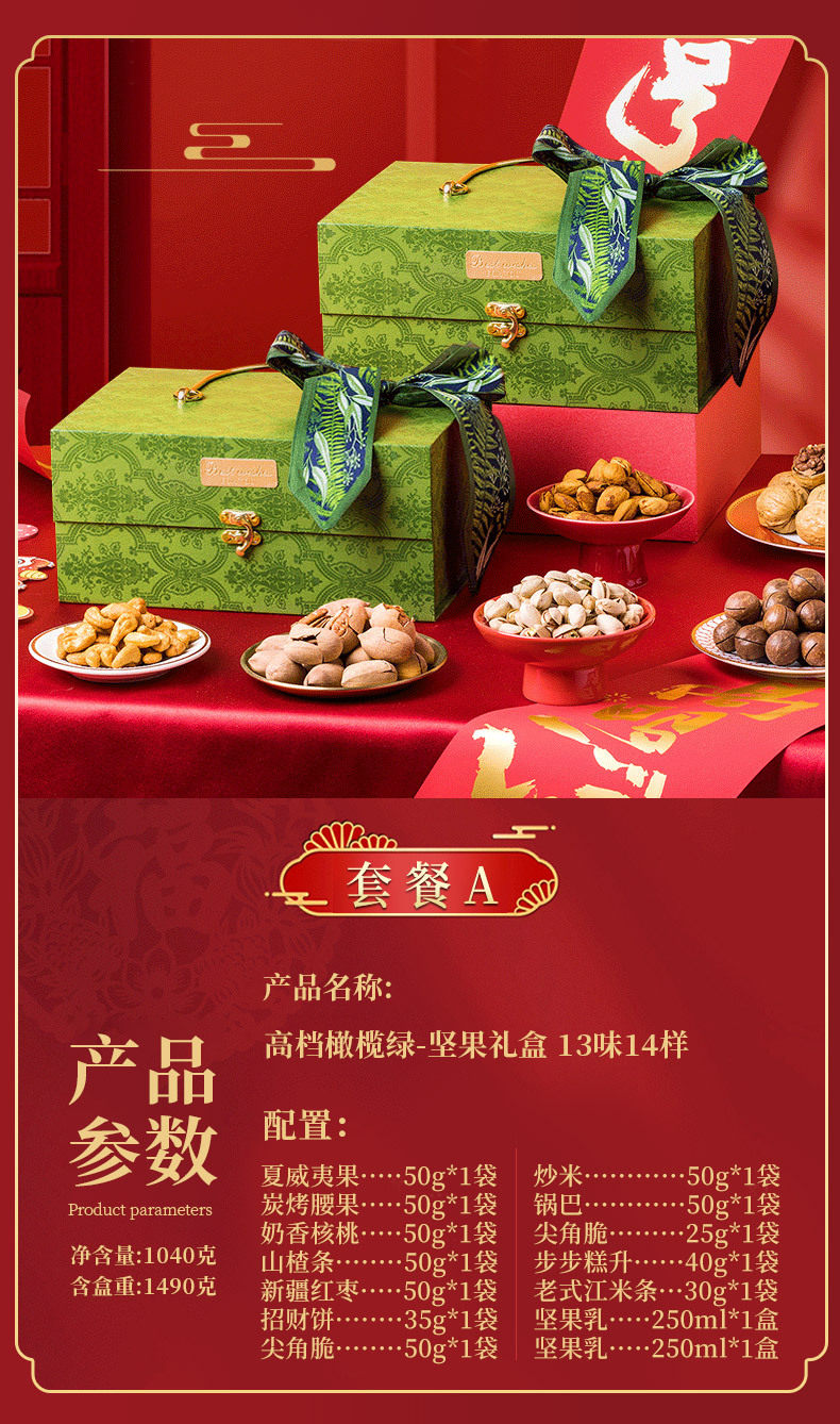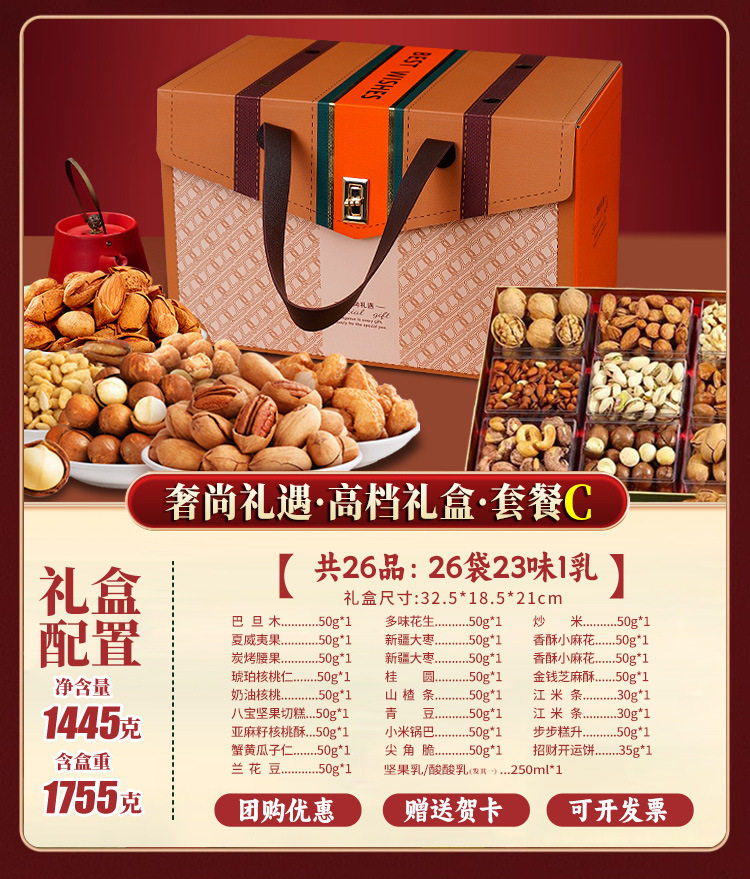 | Packaging specifications | V4 hongyun gift: 13 bags of nut gift box (1070g/box weight) promotional version,Colorful fruit gift - national trend gift box type a [12 bags of 12 flavors + 1 milk 1055g] including box weight,Yuxiangguo new leather handbag model a - gift box [15 bags of 13 flavors + 2 milk 1390g] including box weight,Yuexiangguo new leather handbag model b - gift box [18 bags, 16 flavors + 2 milk, 1570g] including box weight,Yuxiangguo new leather handbag c style - gift box [24 bags, 22 flavors + 2 milk, 1855g] including box weight,Colorful fruit gift - national trend gift box type b [16 bags of 16 flavors + 1 milk 1255g] including box weight,Colorful fruit gift-national trend gift box type c [20 bags of 20 flavors + 1 milk 1475g] including box weight,A2-s promotional model: 15 bags of nut gift box (1190g/box weight included),High-end three-tier gift set - [gilded brilliance a edition - hot stamping gift box] 15 packs, 1695g - weight including box,High-end three-tier gift set - [gilded brilliance gift set b - hot stamped gift box] - total 20 packs, 1945g - includes box weight,High-end three-tier gift set - [gilded brilliance gift set c - hot stamping gift box] total 24 packs, 2155g - including box weight,Extra large - long lucky style a - gift box (20 bags, 1145g),Extra large - long lucky b style - gift box (22 bags, 1265g),Extra large - long strip premium c style - gift box (28 bags, 1540g),New hongyun zhenpin type a - hot stamping gift box [15 packs in total, 1240g] including box weight,New hongyun zhenpin type b - hot stamping gift box [20 packs in total, 1495g] including box weight,New hongyun zhenpin c model - hot stamping gift box [26 packs in total, 1795 grams] including box weight,Lucky & prosperous gift set: 13-bag nut gift box (1010g/box weight) - value pack,Exquisite canned gift box [new year gift type a 10 cans 1580g] canned nut gift box,Exquisite canned gift box [new year gift type b, 10 cans, 1590g] canned nut gift box,Canned fruit gift set a3-a: contains 8 cans, 1770g/box,Canned fruit gift set a3-b: contains 8 cans, 1840g total,High-end square bamboo basket t7-a model--gift box: (15 bags/1295g) including box weight,High-end square bamboo basket t7-b model--gift box: (20 bags 1545g) including box weight,High-end square bamboo basket t7-c model--gift box: (16 bags in total, 1390 grams) including box weight,V1-a model: (bamboo nut gift box) 15 items 940g/box,V1-b model: (bamboo nut gift box) 20 items 1205g/box,V1-c model: (bamboo nut gift box) 20 samples 1355g/box,Premium gift box - oriental delights a [12 bags, 11 flavors, 1470g] - weight with box included,Premium gift box - oriental delights b [17 bags, 16 flavors, 1720g] - weight with box included,Premium gift box - oriental delights style c [20 bags, 19 flavors, 1885g] - weight with box included,The taste of the year a2-a: 16 bags of nut gift box (1240g/box weight included),The taste of the year a2-b: 19 bags of nut gift box (1375g/box weight included),The taste of the year a2-c: 20 bags of nut gift box (1440g/box weight included),The taste of the year a2-d model: 21 bags of nut gift box (1475g/box weight included),Olive green style a: 14 bags of nut gift box (1490g/box weight) accessible luxury style,Olive green type b: 16 bags of nut gift box (1610g/weight including box),V2-a: (pure nuts gift box) 14 bags, 1100g/box,V2-b type: (pure nut gift box) 20 bags 1400g/box,V3-a model: 15 bags of nut gift box (1190g/box) including box weight,V3-b model: 17 bags of nut gift box (1290g/box) including box weight,V3-c model: 20 bags of nut gift box (1425g/box) including box weight,V3-d model: 23 bags of nut gift box (1790g/box) including box weight,Auspicious royal gift: premium gift box (16 bags, 1475g) - box weight included,Luxury gift set - premium gift box t8-a: 15 bags, 15 flavors (1225g/box weight),Luxury gift set - premium gift box t8-b: 20 bags, 19 flavors (1475g/box weight),Luxury gift set - premium gift box t8-c: 26 sachets, 23 flavors (1755g/box weight),Nut gift pack g3-a: a total of 9 flavors and 15 pieces of nut gift box (1190g/box weight included),Nut gift pack g3-b: a total of 19 kinds of nuts in 14 flavors (1400g/box weight included),Nut gift pack g3-c: a total of 16 flavors and 21 types of nut gift boxes (1515g/box weight included),Nut gift pack g3-d: 22 items in total of 17 flavors (1565g/box weight included) |