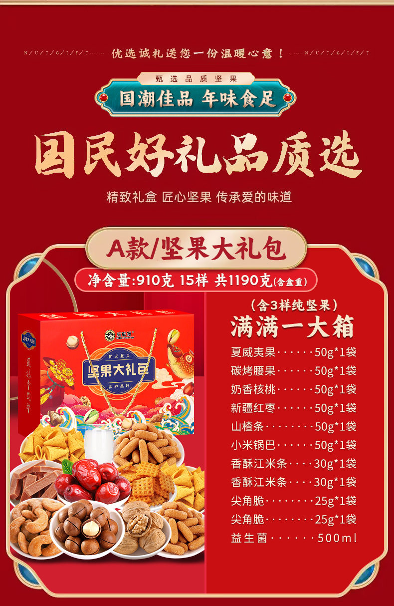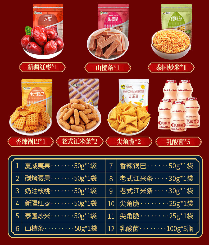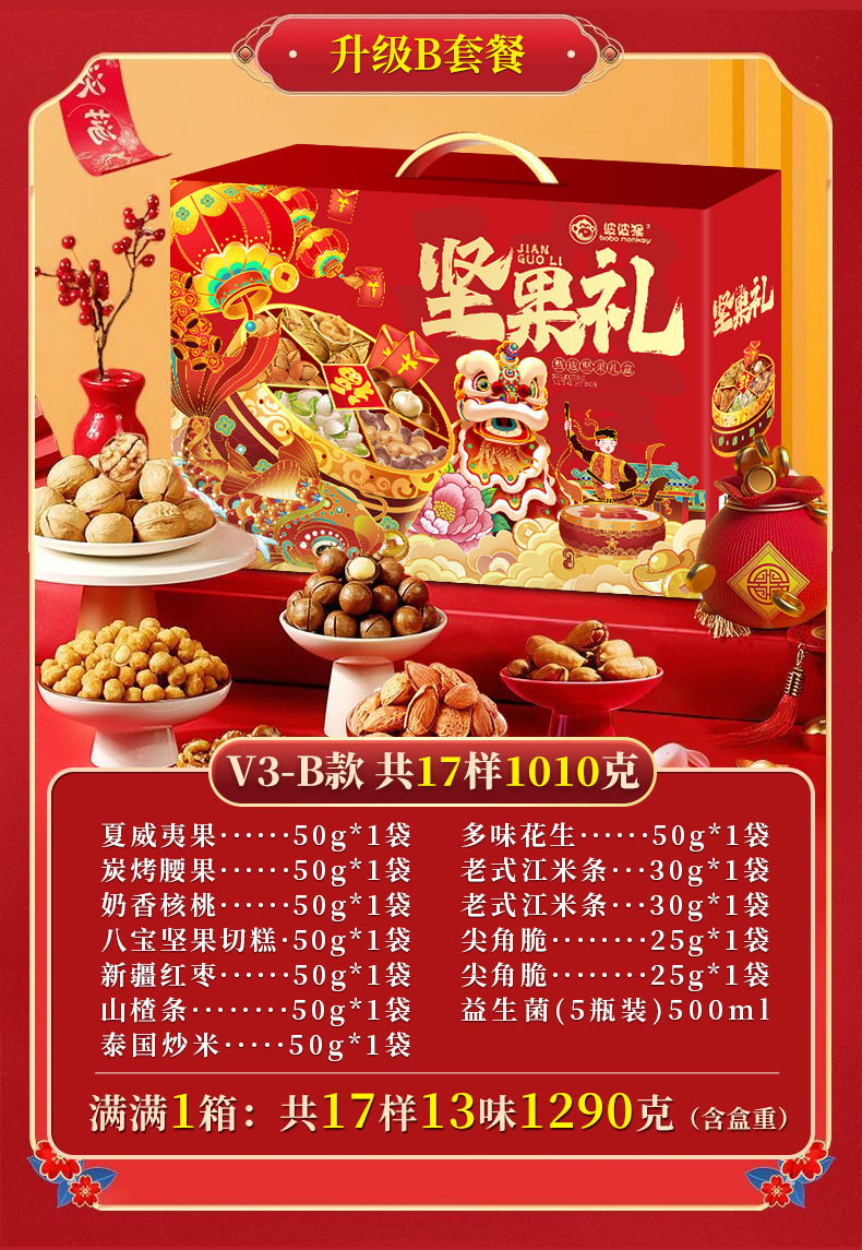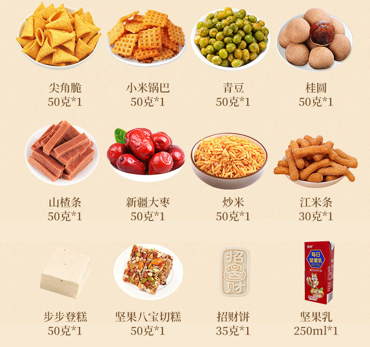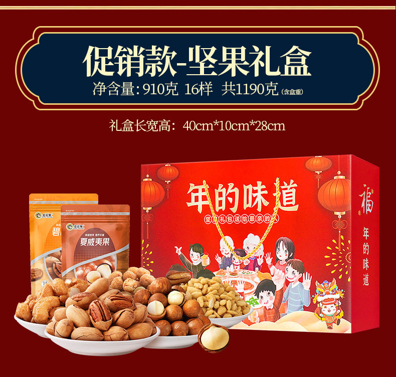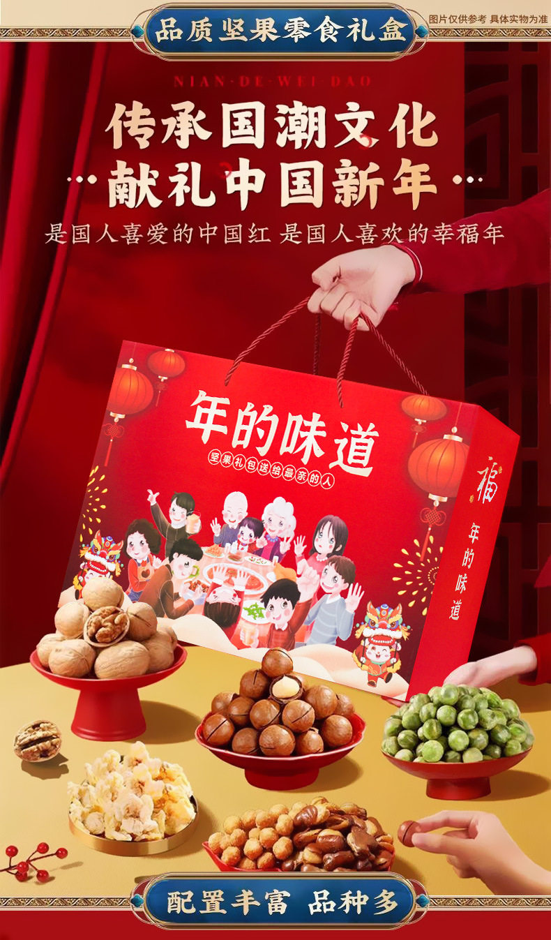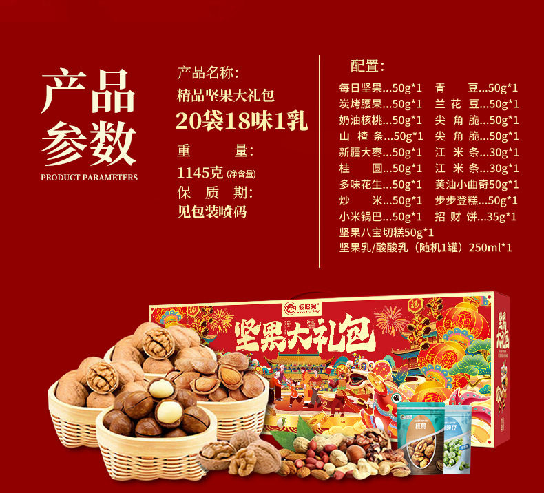 | Packaging specifications | V4 hongyun gift: 13 bags of nut gift box (1070g/box weight) promotional version,Colorful fruit gift - national trend gift box type a [12 bags of 12 flavors + 1 milk 1055g] including box weight,Yuxiangguo new leather handbag model a - gift box [15 bags of 13 flavors + 2 milk 1390g] including box weight,Yuexiangguo new leather handbag model b - gift box [18 bags, 16 flavors + 2 milk, 1570g] including box weight,Yuxiangguo new leather handbag c style - gift box [24 bags, 22 flavors + 2 milk, 1855g] including box weight,Colorful fruit gift - national trend gift box type b [16 bags of 16 flavors + 1 milk 1255g] including box weight,Colorful fruit gift-national trend gift box type c [20 bags of 20 flavors + 1 milk 1475g] including box weight,A2-s promotional model: 15 bags of nut gift box (1190g/box weight included),High-end three-tier gift set - [gilded brilliance a edition - hot stamping gift box] 15 packs, 1695g - weight including box,High-end three-tier gift set - [gilded brilliance gift set b - hot stamped gift box] - total 20 packs, 1945g - includes box weight,High-end three-tier gift set - [gilded brilliance gift set c - hot stamping gift box] total 24 packs, 2155g - including box weight,Extra large - long lucky style a - gift box (20 bags, 1145g),Extra large - long lucky b style - gift box (22 bags, 1265g),Extra large - long strip premium c style - gift box (28 bags, 1540g),New hongyun zhenpin type a - hot stamping gift box [15 packs in total, 1240g] including box weight,New hongyun zhenpin type b - hot stamping gift box [20 packs in total, 1495g] including box weight,New hongyun zhenpin c model - hot stamping gift box [26 packs in total, 1795 grams] including box weight,Lucky & prosperous gift set: 13-bag nut gift box (1010g/box weight) - value pack,Exquisite canned gift box [new year gift type a 10 cans 1580g] canned nut gift box,Exquisite canned gift box [new year gift type b, 10 cans, 1590g] canned nut gift box,Canned fruit gift set a3-a: contains 8 cans, 1770g/box,Canned fruit gift set a3-b: contains 8 cans, 1840g total,High-end square bamboo basket t7-a model--gift box: (15 bags/1295g) including box weight,High-end square bamboo basket t7-b model--gift box: (20 bags 1545g) including box weight,High-end square bamboo basket t7-c model--gift box: (16 bags in total, 1390 grams) including box weight,V1-a model: (bamboo nut gift box) 15 items 940g/box,V1-b model: (bamboo nut gift box) 20 items 1205g/box,V1-c model: (bamboo nut gift box) 20 samples 1355g/box,Premium gift box - oriental delights a [12 bags, 11 flavors, 1470g] - weight with box included,Premium gift box - oriental delights b [17 bags, 16 flavors, 1720g] - weight with box included,Premium gift box - oriental delights style c [20 bags, 19 flavors, 1885g] - weight with box included,The taste of the year a2-a: 16 bags of nut gift box (1240g/box weight included),The taste of the year a2-b: 19 bags of nut gift box (1375g/box weight included),The taste of the year a2-c: 20 bags of nut gift box (1440g/box weight included),The taste of the year a2-d model: 21 bags of nut gift box (1475g/box weight included),Olive green style a: 14 bags of nut gift box (1490g/box weight) accessible luxury style,Olive green type b: 16 bags of nut gift box (1610g/weight including box),V2-a: (pure nuts gift box) 14 bags, 1100g/box,V2-b type: (pure nut gift box) 20 bags 1400g/box,V3-a model: 15 bags of nut gift box (1190g/box) including box weight,V3-b model: 17 bags of nut gift box (1290g/box) including box weight,V3-c model: 20 bags of nut gift box (1425g/box) including box weight,V3-d model: 23 bags of nut gift box (1790g/box) including box weight,Auspicious royal gift: premium gift box (16 bags, 1475g) - box weight included,Luxury gift set - premium gift box t8-a: 15 bags, 15 flavors (1225g/box weight),Luxury gift set - premium gift box t8-b: 20 bags, 19 flavors (1475g/box weight),Luxury gift set - premium gift box t8-c: 26 sachets, 23 flavors (1755g/box weight),Nut gift pack g3-a: a total of 9 flavors and 15 pieces of nut gift box (1190g/box weight included),Nut gift pack g3-b: a total of 19 kinds of nuts in 14 flavors (1400g/box weight included),Nut gift pack g3-c: a total of 16 flavors and 21 types of nut gift boxes (1515g/box weight included),Nut gift pack g3-d: 22 items in total of 17 flavors (1565g/box weight included) |