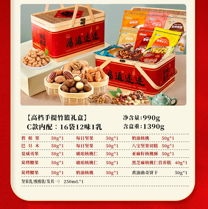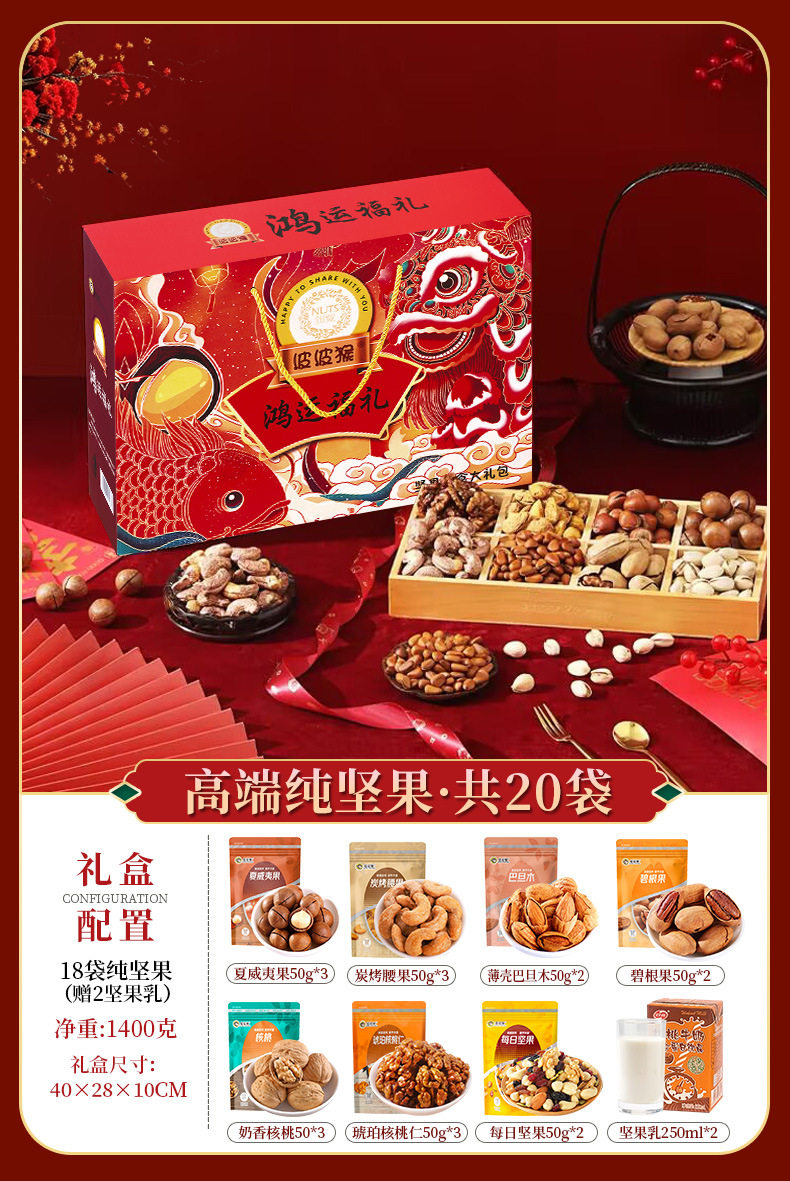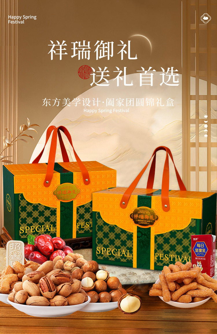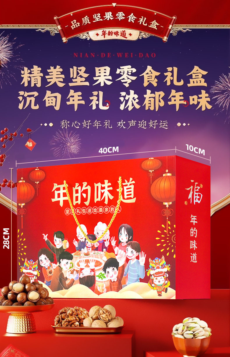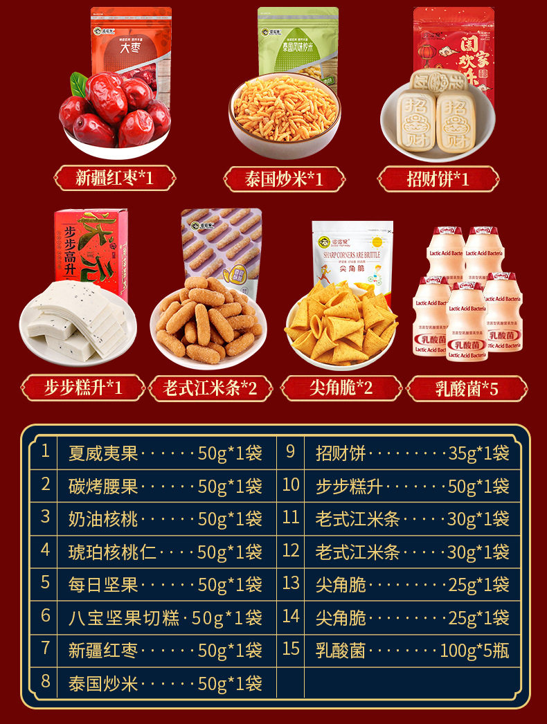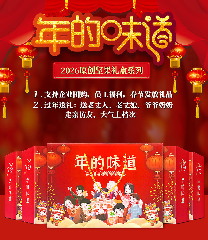 | Packaging specifications | V4 hongyun gift: 13 bags of nut gift box (1070g/box weight) promotional version,Colorful fruit gift - national trend gift box type a [12 bags of 12 flavors + 1 milk 1055g] including box weight,Yuxiangguo new leather handbag model a - gift box [15 bags of 13 flavors + 2 milk 1390g] including box weight,Yuexiangguo new leather handbag model b - gift box [18 bags, 16 flavors + 2 milk, 1570g] including box weight,Yuxiangguo new leather handbag c style - gift box [24 bags, 22 flavors + 2 milk, 1855g] including box weight,Colorful fruit gift - national trend gift box type b [16 bags of 16 flavors + 1 milk 1255g] including box weight,Colorful fruit gift-national trend gift box type c [20 bags of 20 flavors + 1 milk 1475g] including box weight,A2-s promotional model: 15 bags of nut gift box (1190g/box weight included),High-end three-tier gift set - [gilded brilliance a edition - hot stamping gift box] 15 packs, 1695g - weight including box,High-end three-tier gift set - [gilded brilliance gift set b - hot stamped gift box] - total 20 packs, 1945g - includes box weight,High-end three-tier gift set - [gilded brilliance gift set c - hot stamping gift box] total 24 packs, 2155g - including box weight,Extra large - long lucky style a - gift box (20 bags, 1145g),Extra large - long lucky b style - gift box (22 bags, 1265g),Extra large - long strip premium c style - gift box (28 bags, 1540g),New hongyun zhenpin type a - hot stamping gift box [15 packs in total, 1240g] including box weight,New hongyun zhenpin type b - hot stamping gift box [20 packs in total, 1495g] including box weight,New hongyun zhenpin c model - hot stamping gift box [26 packs in total, 1795 grams] including box weight,Lucky & prosperous gift set: 13-bag nut gift box (1010g/box weight) - value pack,Exquisite canned gift box [new year gift type a 10 cans 1580g] canned nut gift box,Exquisite canned gift box [new year gift type b, 10 cans, 1590g] canned nut gift box,Canned fruit gift set a3-a: contains 8 cans, 1770g/box,Canned fruit gift set a3-b: contains 8 cans, 1840g total,High-end square bamboo basket t7-a model--gift box: (15 bags/1295g) including box weight,High-end square bamboo basket t7-b model--gift box: (20 bags 1545g) including box weight,High-end square bamboo basket t7-c model--gift box: (16 bags in total, 1390 grams) including box weight,V1-a model: (bamboo nut gift box) 15 items 940g/box,V1-b model: (bamboo nut gift box) 20 items 1205g/box,V1-c model: (bamboo nut gift box) 20 samples 1355g/box,Premium gift box - oriental delights a [12 bags, 11 flavors, 1470g] - weight with box included,Premium gift box - oriental delights b [17 bags, 16 flavors, 1720g] - weight with box included,Premium gift box - oriental delights style c [20 bags, 19 flavors, 1885g] - weight with box included,The taste of the year a2-a: 16 bags of nut gift box (1240g/box weight included),The taste of the year a2-b: 19 bags of nut gift box (1375g/box weight included),The taste of the year a2-c: 20 bags of nut gift box (1440g/box weight included),The taste of the year a2-d model: 21 bags of nut gift box (1475g/box weight included),Olive green style a: 14 bags of nut gift box (1490g/box weight) accessible luxury style,Olive green type b: 16 bags of nut gift box (1610g/weight including box),V2-a: (pure nuts gift box) 14 bags, 1100g/box,V2-b type: (pure nut gift box) 20 bags 1400g/box,V3-a model: 15 bags of nut gift box (1190g/box) including box weight,V3-b model: 17 bags of nut gift box (1290g/box) including box weight,V3-c model: 20 bags of nut gift box (1425g/box) including box weight,V3-d model: 23 bags of nut gift box (1790g/box) including box weight,Auspicious royal gift: premium gift box (16 bags, 1475g) - box weight included,Luxury gift set - premium gift box t8-a: 15 bags, 15 flavors (1225g/box weight),Luxury gift set - premium gift box t8-b: 20 bags, 19 flavors (1475g/box weight),Luxury gift set - premium gift box t8-c: 26 sachets, 23 flavors (1755g/box weight),Nut gift pack g3-a: a total of 9 flavors and 15 pieces of nut gift box (1190g/box weight included),Nut gift pack g3-b: a total of 19 kinds of nuts in 14 flavors (1400g/box weight included),Nut gift pack g3-c: a total of 16 flavors and 21 types of nut gift boxes (1515g/box weight included),Nut gift pack g3-d: 22 items in total of 17 flavors (1565g/box weight included) |