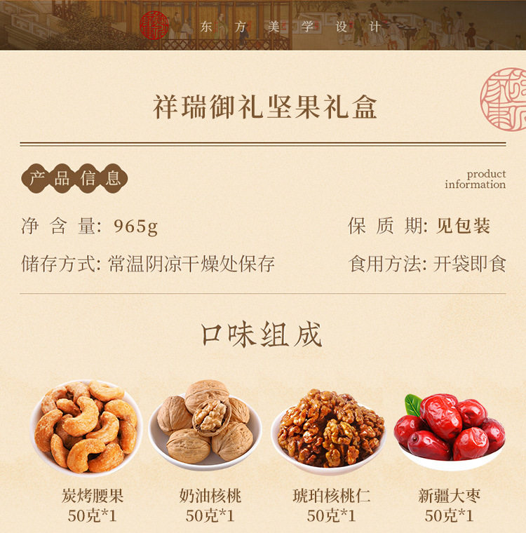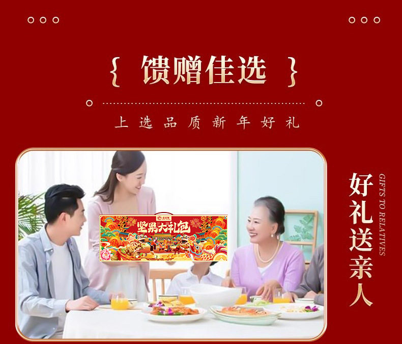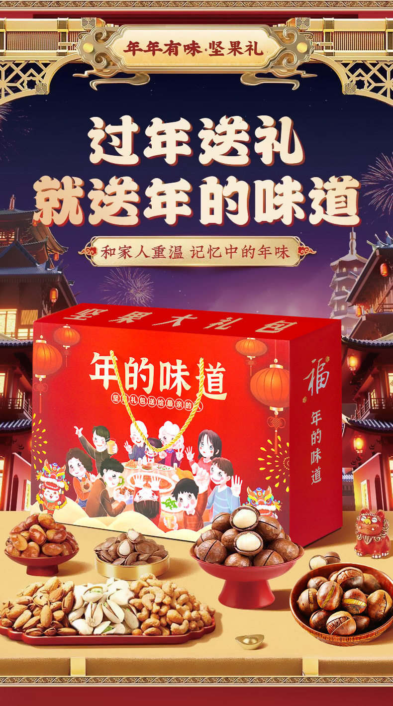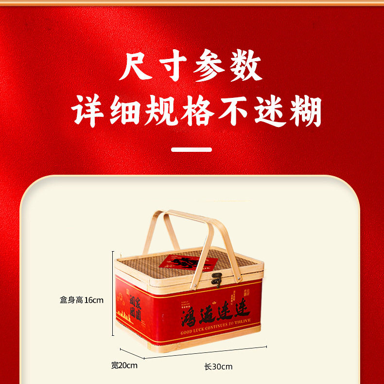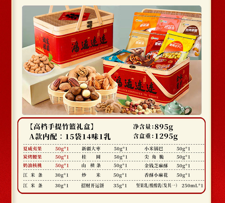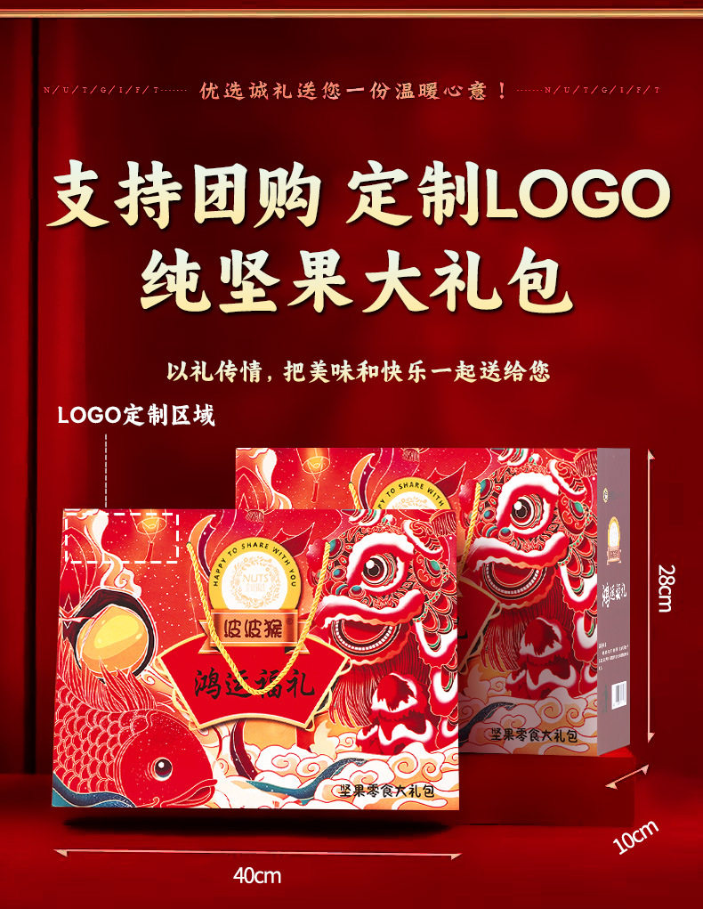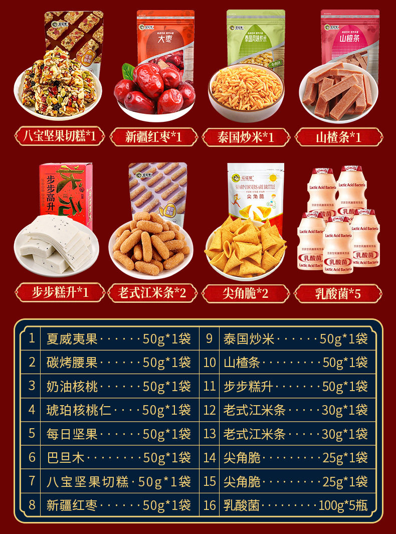 | Packaging specifications | V4 hongyun gift: 13 bags of nut gift box (1070g/box weight) promotional version,Colorful fruit gift - national trend gift box type a [12 bags of 12 flavors + 1 milk 1055g] including box weight,Yuxiangguo new leather handbag model a - gift box [15 bags of 13 flavors + 2 milk 1390g] including box weight,Yuexiangguo new leather handbag model b - gift box [18 bags, 16 flavors + 2 milk, 1570g] including box weight,Yuxiangguo new leather handbag c style - gift box [24 bags, 22 flavors + 2 milk, 1855g] including box weight,Colorful fruit gift - national trend gift box type b [16 bags of 16 flavors + 1 milk 1255g] including box weight,Colorful fruit gift-national trend gift box type c [20 bags of 20 flavors + 1 milk 1475g] including box weight,A2-s promotional model: 15 bags of nut gift box (1190g/box weight included),High-end three-tier gift set - [gilded brilliance a edition - hot stamping gift box] 15 packs, 1695g - weight including box,High-end three-tier gift set - [gilded brilliance gift set b - hot stamped gift box] - total 20 packs, 1945g - includes box weight,High-end three-tier gift set - [gilded brilliance gift set c - hot stamping gift box] total 24 packs, 2155g - including box weight,Extra large - long lucky style a - gift box (20 bags, 1145g),Extra large - long lucky b style - gift box (22 bags, 1265g),Extra large - long strip premium c style - gift box (28 bags, 1540g),New hongyun zhenpin type a - hot stamping gift box [15 packs in total, 1240g] including box weight,New hongyun zhenpin type b - hot stamping gift box [20 packs in total, 1495g] including box weight,New hongyun zhenpin c model - hot stamping gift box [26 packs in total, 1795 grams] including box weight,Lucky & prosperous gift set: 13-bag nut gift box (1010g/box weight) - value pack,Exquisite canned gift box [new year gift type a 10 cans 1580g] canned nut gift box,Exquisite canned gift box [new year gift type b, 10 cans, 1590g] canned nut gift box,Canned fruit gift set a3-a: contains 8 cans, 1770g/box,Canned fruit gift set a3-b: contains 8 cans, 1840g total,High-end square bamboo basket t7-a model--gift box: (15 bags/1295g) including box weight,High-end square bamboo basket t7-b model--gift box: (20 bags 1545g) including box weight,High-end square bamboo basket t7-c model--gift box: (16 bags in total, 1390 grams) including box weight,V1-a model: (bamboo nut gift box) 15 items 940g/box,V1-b model: (bamboo nut gift box) 20 items 1205g/box,V1-c model: (bamboo nut gift box) 20 samples 1355g/box,Premium gift box - oriental delights a [12 bags, 11 flavors, 1470g] - weight with box included,Premium gift box - oriental delights b [17 bags, 16 flavors, 1720g] - weight with box included,Premium gift box - oriental delights style c [20 bags, 19 flavors, 1885g] - weight with box included,The taste of the year a2-a: 16 bags of nut gift box (1240g/box weight included),The taste of the year a2-b: 19 bags of nut gift box (1375g/box weight included),The taste of the year a2-c: 20 bags of nut gift box (1440g/box weight included),The taste of the year a2-d model: 21 bags of nut gift box (1475g/box weight included),Olive green style a: 14 bags of nut gift box (1490g/box weight) accessible luxury style,Olive green type b: 16 bags of nut gift box (1610g/weight including box),V2-a: (pure nuts gift box) 14 bags, 1100g/box,V2-b type: (pure nut gift box) 20 bags 1400g/box,V3-a model: 15 bags of nut gift box (1190g/box) including box weight,V3-b model: 17 bags of nut gift box (1290g/box) including box weight,V3-c model: 20 bags of nut gift box (1425g/box) including box weight,V3-d model: 23 bags of nut gift box (1790g/box) including box weight,Auspicious royal gift: premium gift box (16 bags, 1475g) - box weight included,Luxury gift set - premium gift box t8-a: 15 bags, 15 flavors (1225g/box weight),Luxury gift set - premium gift box t8-b: 20 bags, 19 flavors (1475g/box weight),Luxury gift set - premium gift box t8-c: 26 sachets, 23 flavors (1755g/box weight),Nut gift pack g3-a: a total of 9 flavors and 15 pieces of nut gift box (1190g/box weight included),Nut gift pack g3-b: a total of 19 kinds of nuts in 14 flavors (1400g/box weight included),Nut gift pack g3-c: a total of 16 flavors and 21 types of nut gift boxes (1515g/box weight included),Nut gift pack g3-d: 22 items in total of 17 flavors (1565g/box weight included) |