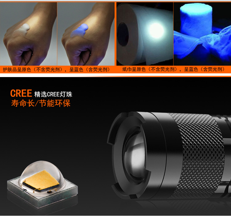 | Color | 365nm flashlight (white box packaging does not contain batteries),365nm Flashlight + battery (white box packaging),395nm flashlight (white box packaging does not contain batteries),395nm Flashlight + battery (white box packaging) |